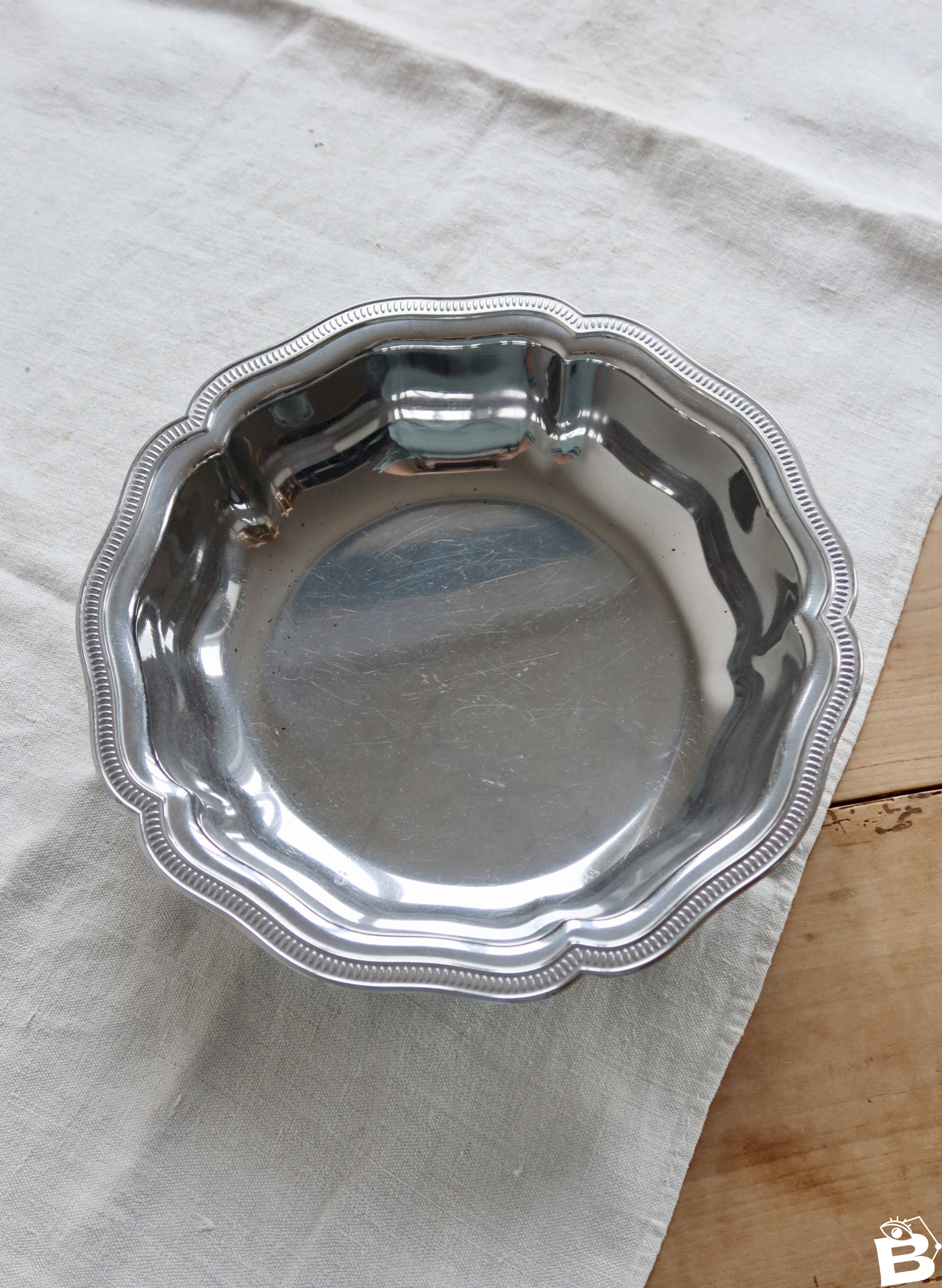 Large silver-plated metal bowl signed Guy Degrenne, with a delicately worked wavy edge.