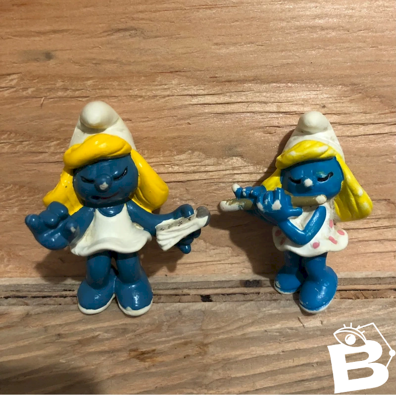 2 vintage Smurfette figurines in satisfactory condition. Missing paint and missing the pencil of the secretary Smurfette.