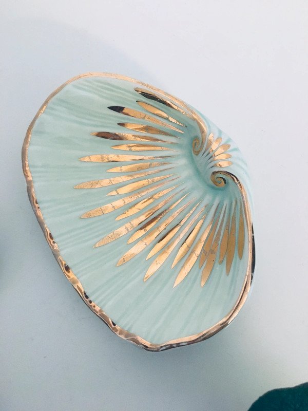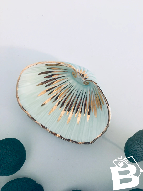 Vintage shell-shaped soap dish / catch-all by Jilda Paris in mint green and gold glazed ceramic. Very good condition, the gilding is slightly worn in some places. 12.5 x 9.5 cm. For two items purchased from my wardrobe, the third one is free ☺️ (the least expensive of the three…). Contact me for the purchase of a lot. Reduced shipping costs possible for vases, plates, and bowls. #retro #vintage #vintageware #antiqueware #englishware #artdeco #70s #bohemian...