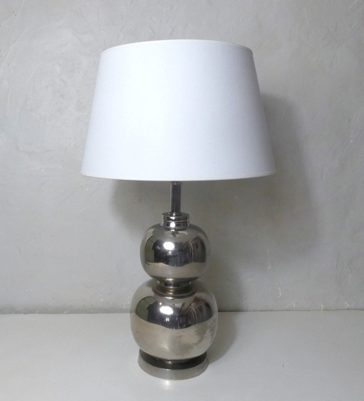 Large floor lamp with a Space Age design from the 70s-80s. Silver chrome metal base made of stacked spheres. Contemporary cylindrical lampshade by DRIMMER, diameter 43 cm, perfectly suited to the proportion of the base. Dimensions: total height 68 cm, base width 19 cm. Condition: very good overall condition, with some scratches and signs of wear. Functional electrification. An impressive decorative piece, retro, chic, and contemporary.