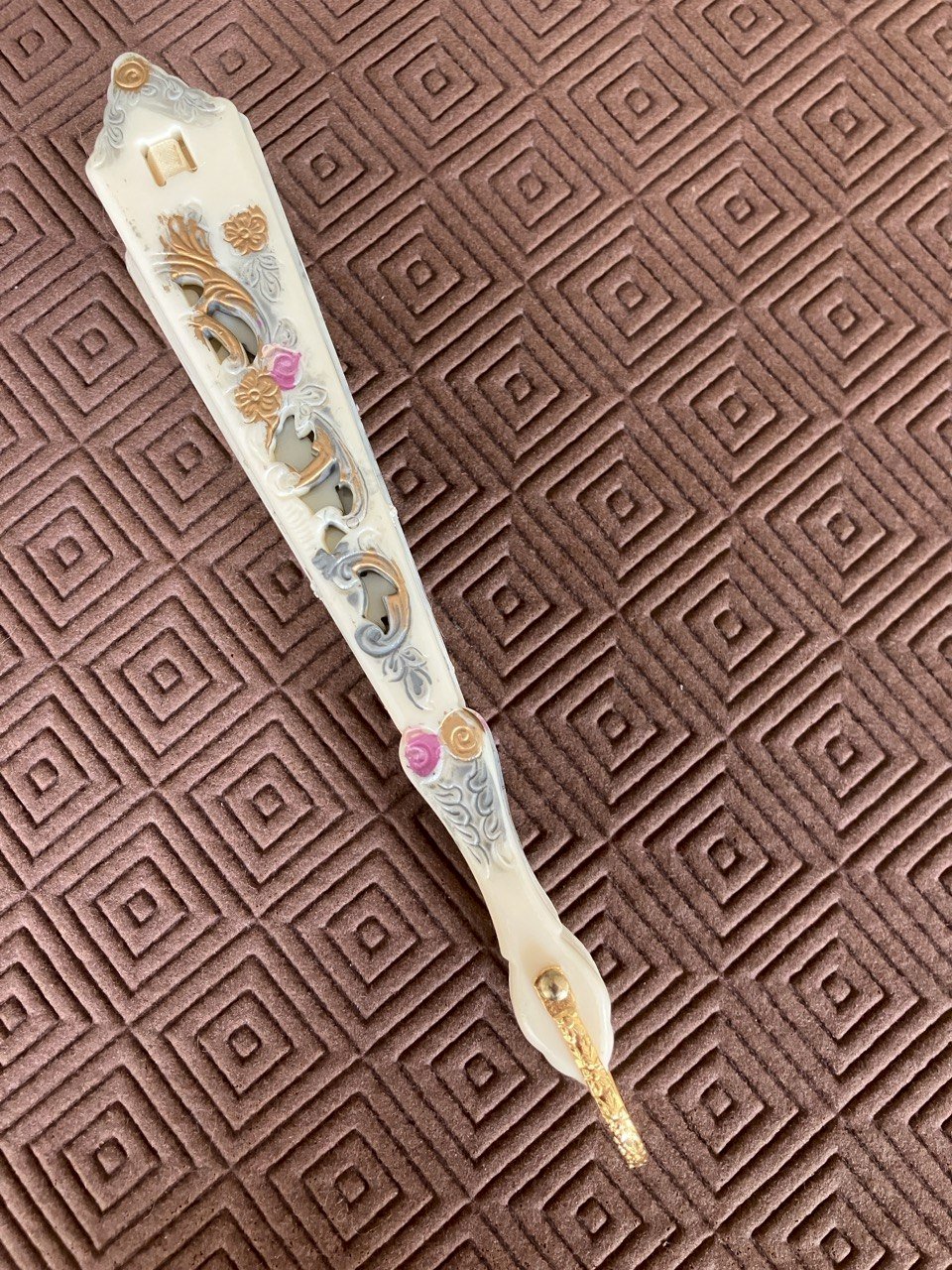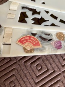 A beautiful wall object with retro charm, still bearing its original label HAND MADE IN SPAIN. Its romantic decor combines openwork, reliefs, gilded highlights, and roses, as well as three painted cartouches of floral bouquets.