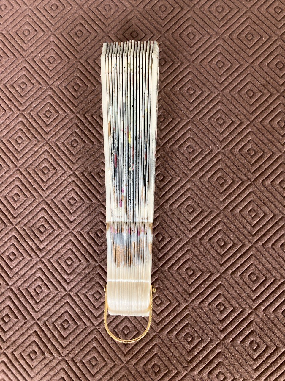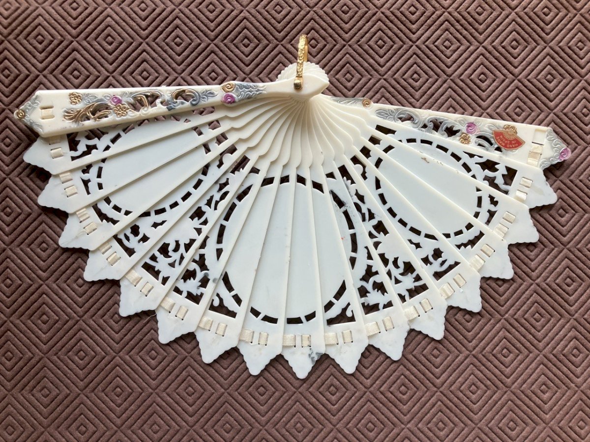 Condition: generally good vintage condition. The fan is complete and remains very decorative. It shows some signs of use and aging visible in the photos, including slight rubbing, small stains, and more noticeable wear when folded.