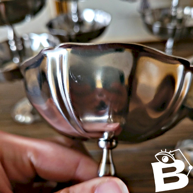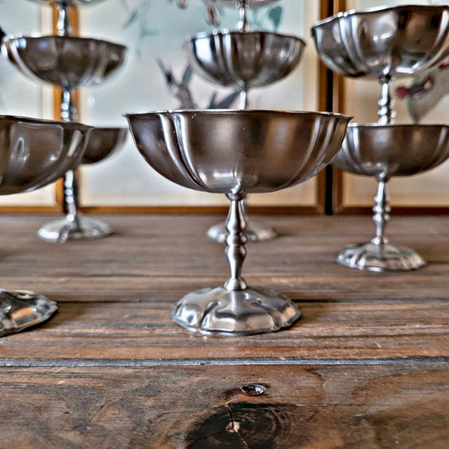 Set of 12 vintage stainless steel ice cream bowls (sorbet). They can also be used as cocktail glasses or for another dessert (fruit salad…). "Flower" shape, elegantly crafted stem.