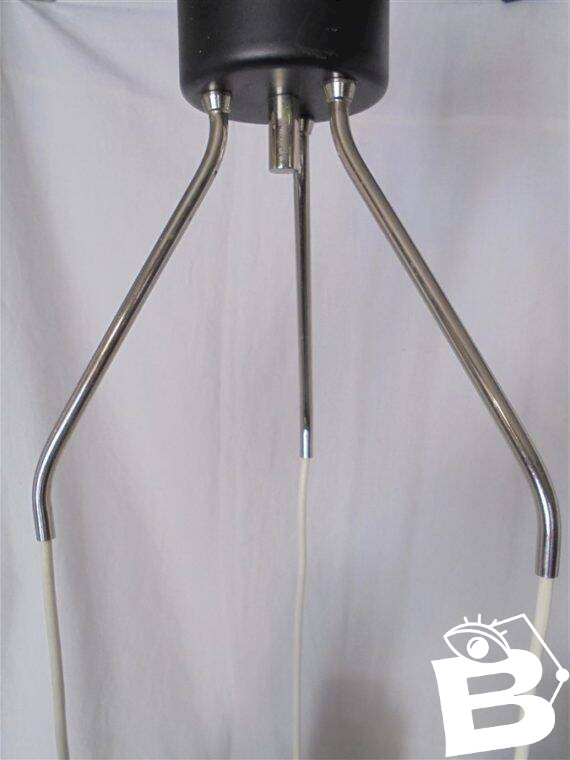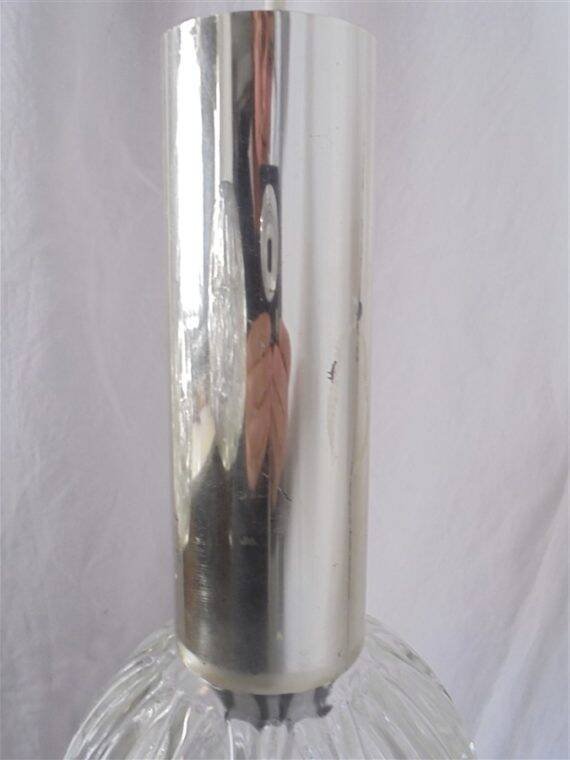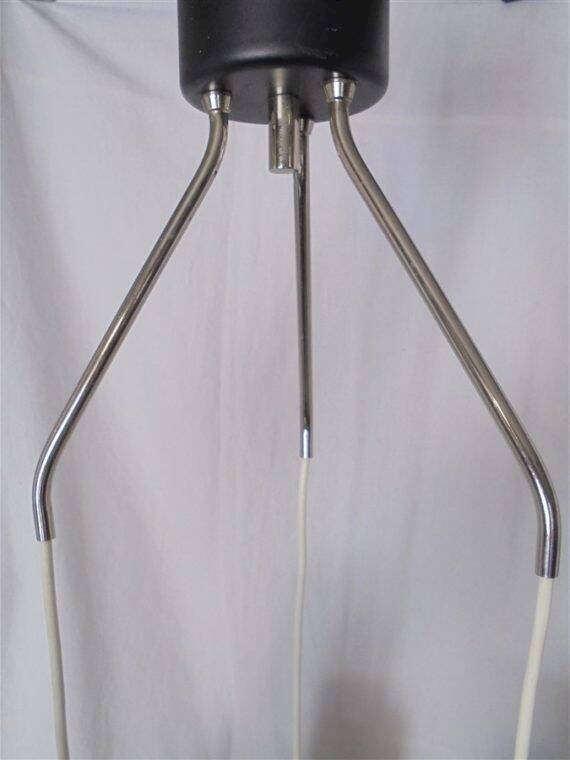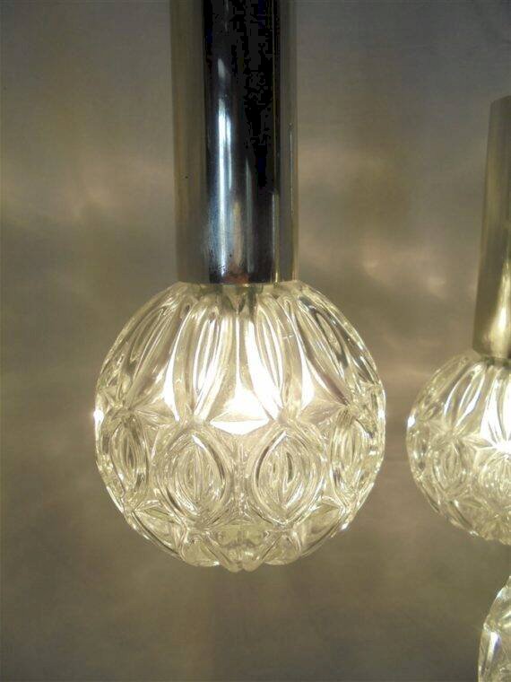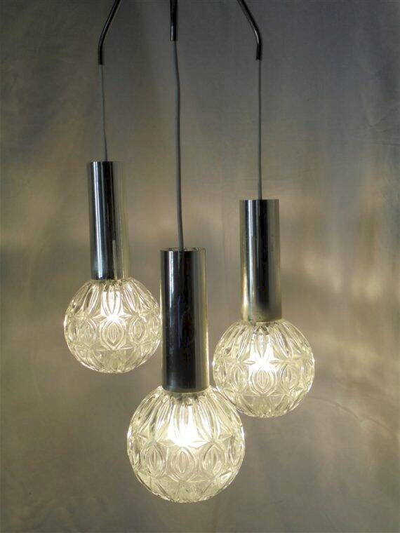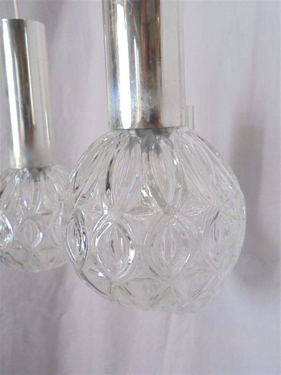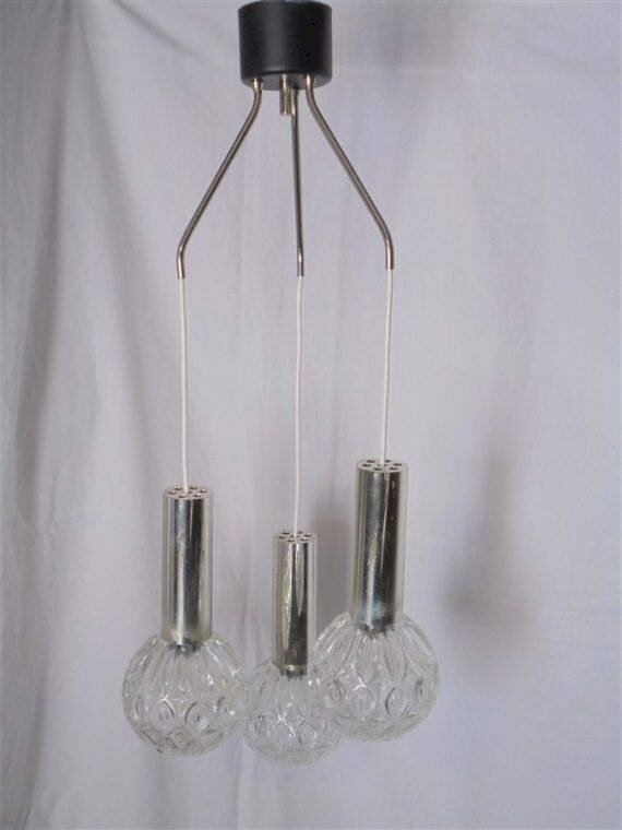 Vintage pendant light with 3 glass globes, topped with a cylindrical part in chrome plastic. The chrome has worn in places; these areas show very discreet signs of wear once the chandelier is in place. Average height: 75 cm. Diameter of the globes: 13 cm. Weight: 2.2 kg. L: 13 W: 13 H: 75.