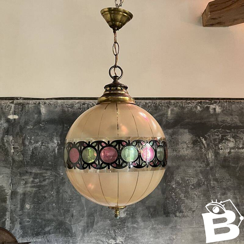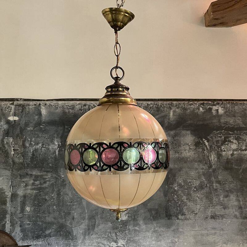It looks like it came straight out of a 1930s salon… This vintage pendant with an Art Deco spirit combines opaline glass and stained glass frieze in powdered shades of pink, white, and black.