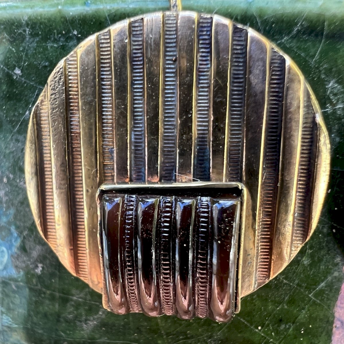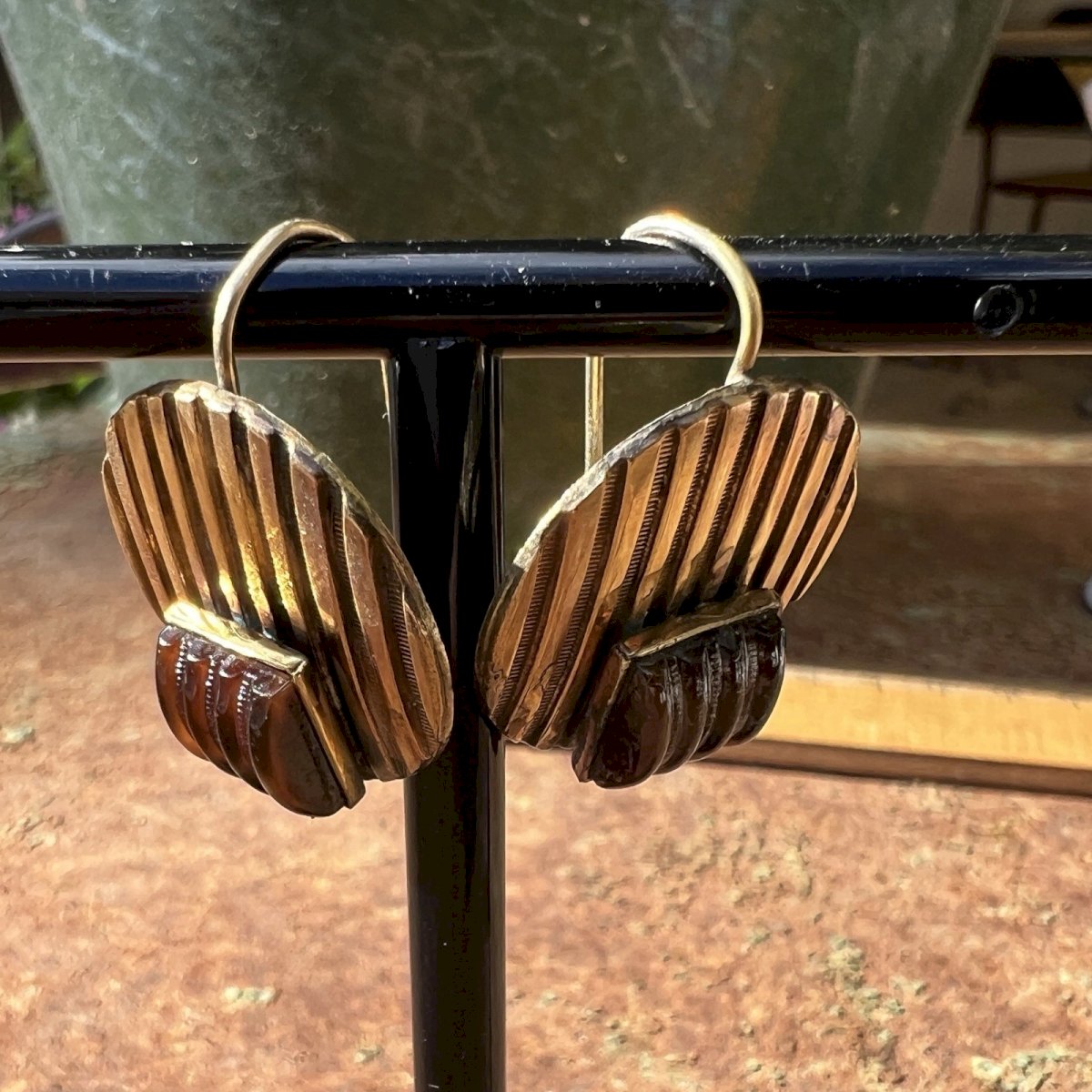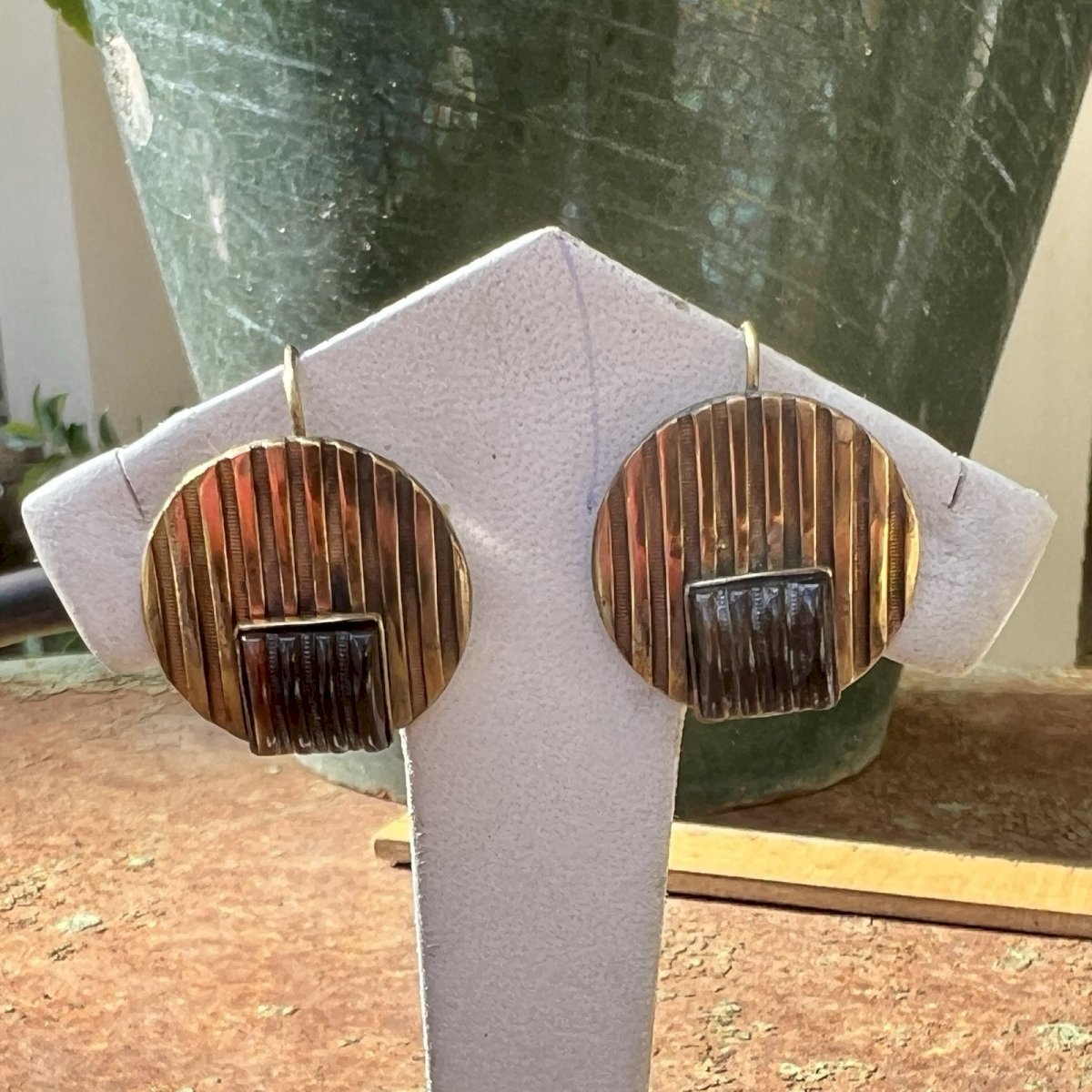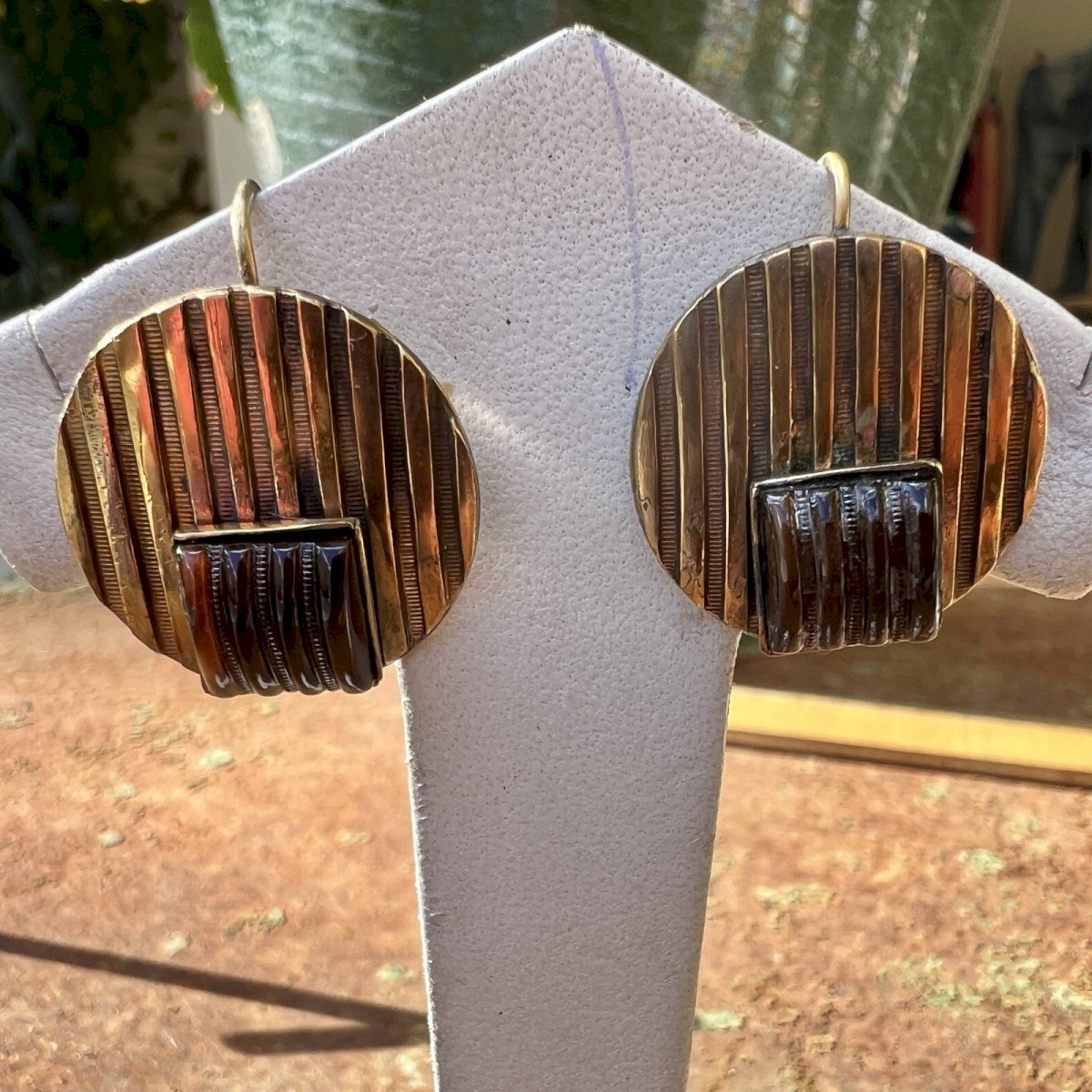 Vintage swan neck earrings from around 1925, geometric design in gilt metal with an antique patina. Mini signs of wear. These earrings are set with beautiful glass cabochons, typical of the Art Deco period. Dimensions approximately 2.5 cm in height and 2 cm in diameter. Total weight approximately 9.2 g. Condition: Pre-owned item. ...Pre-owned item. Any possible imperfections. Dominant stone: Glass cabochon. Brand: Art Deco. Type: Dangle. Country of origin: France. Dominant color: Gilded. Closure: Dormeuses. Material: Glass.