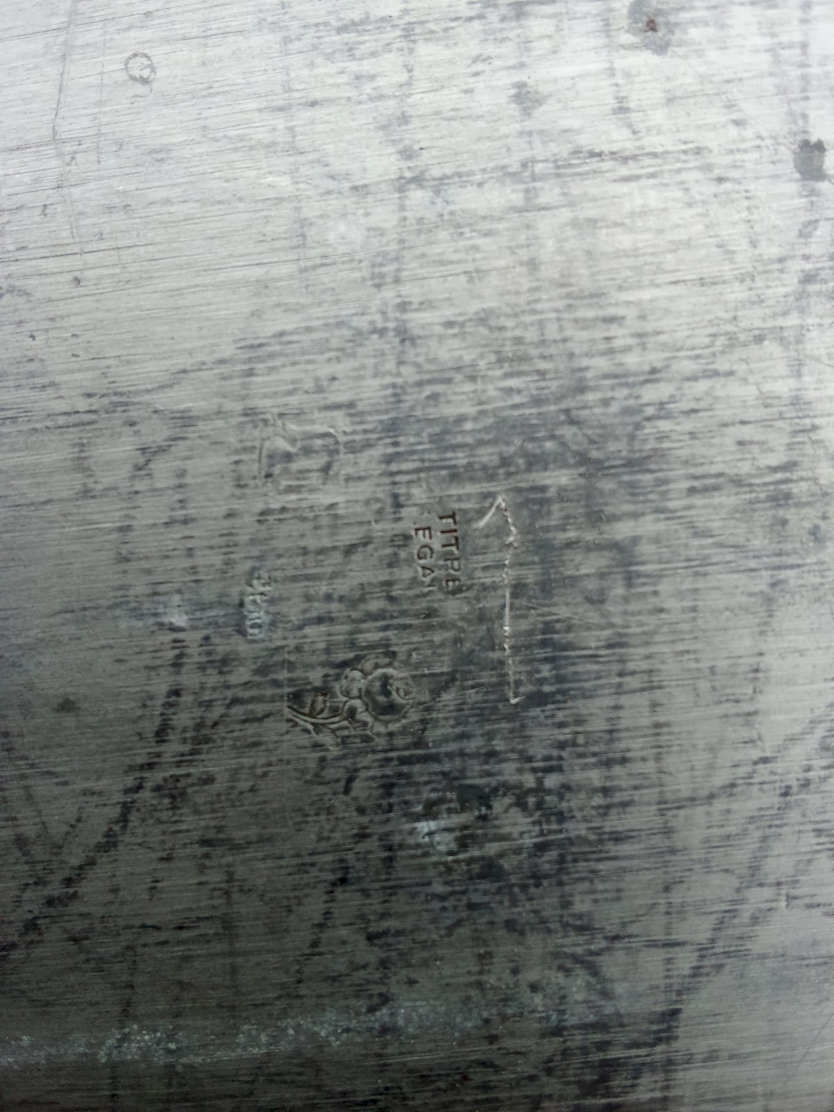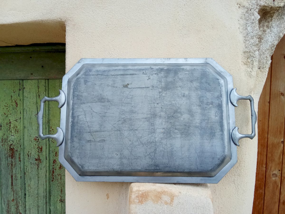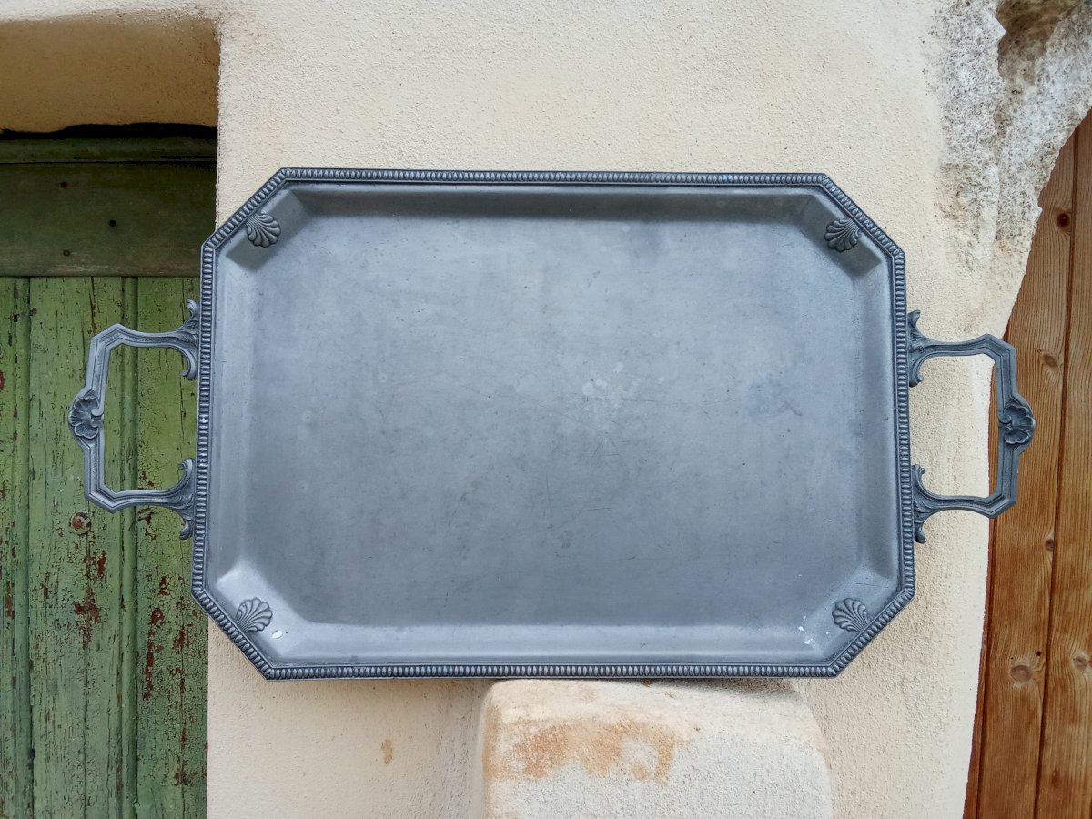 Tin tray. Dimensions: 31 cm x 44 cm wide, handle not included in the dimensions. The tray is in good condition, showing only signs of wear.