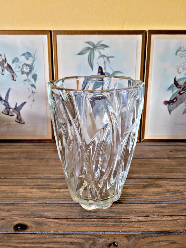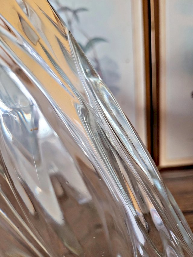 This very thick vintage glass vase isCharmingly present and has character. Its textured glass (twisted ridges) captures light and adds rhythm to the room, creating beautiful plays of shadows and transparency. Its dense material and generous weight give it a nice stability, while its textured design allows it to be as decorative alone as with a bouquet. The vase has been used and shows some limescale marks as well as very small material losses (see photos).