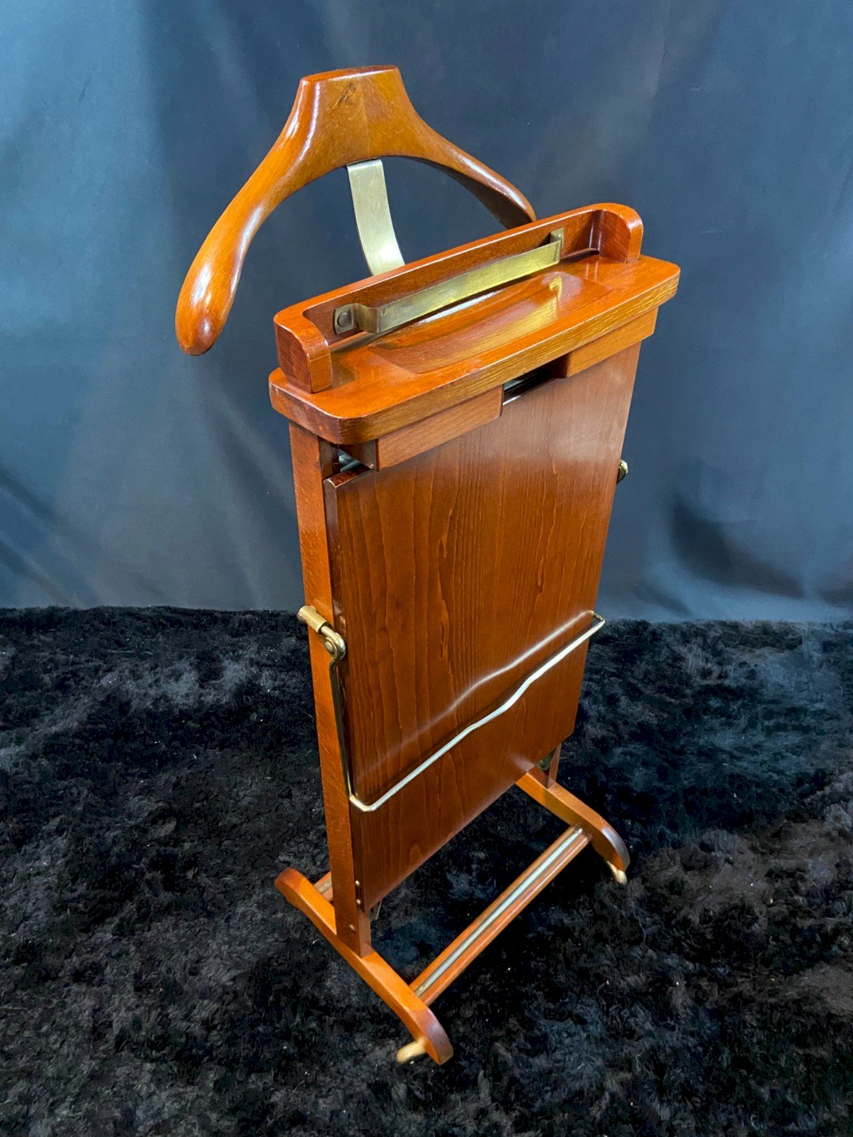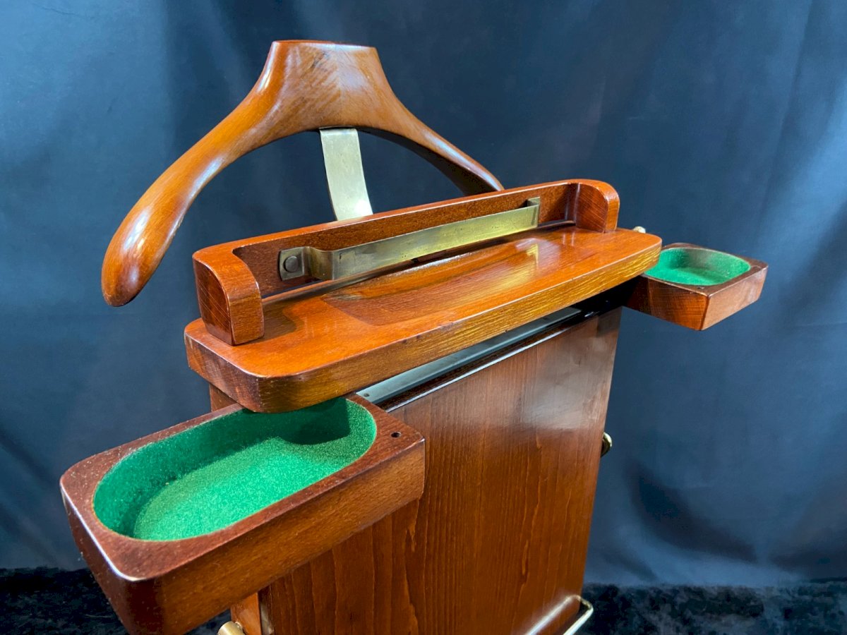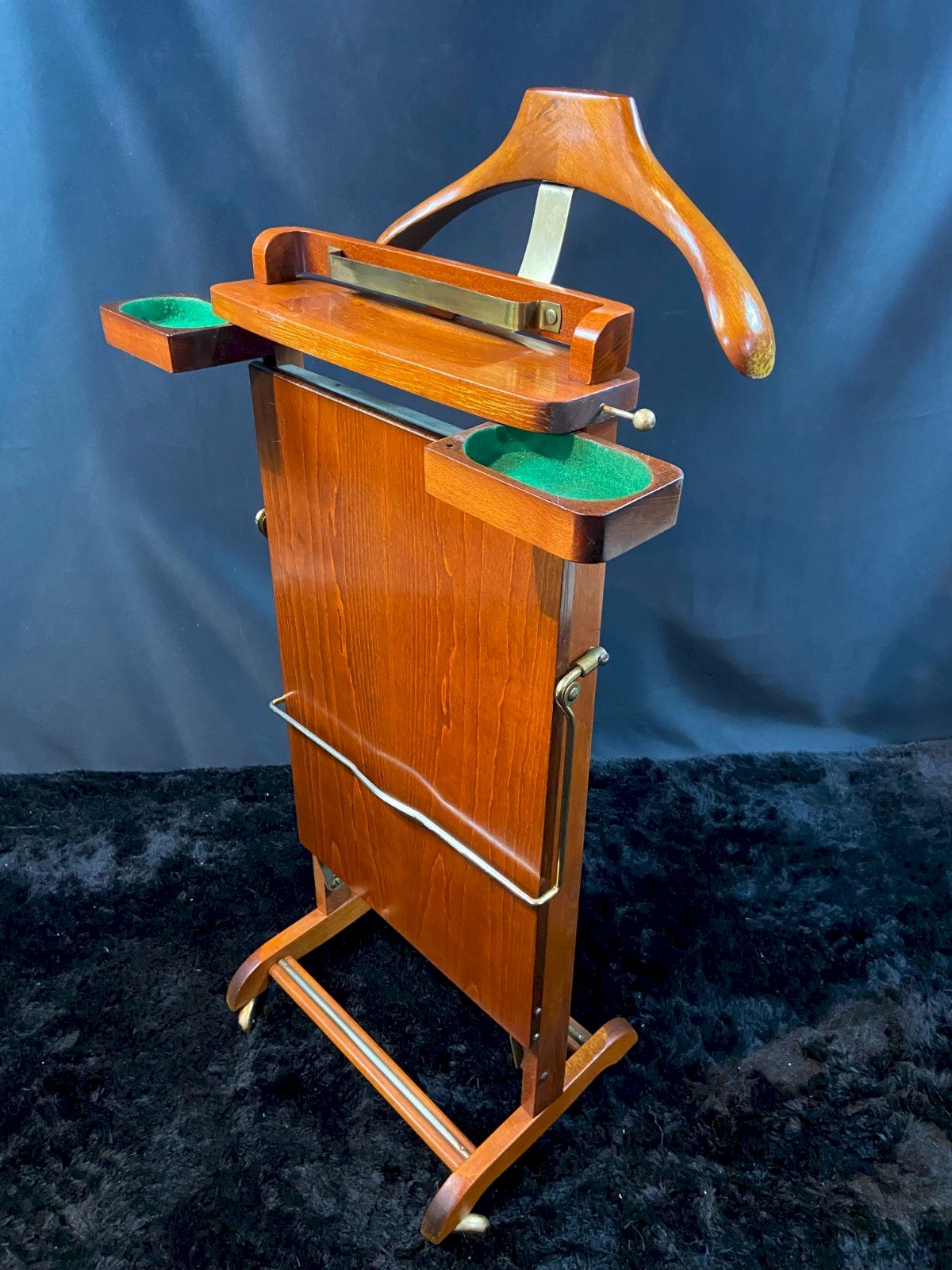 Night valet, vintage valet – 1970s. Structure made of varnished wood with a hanger, top shelf, two side pockets covered in green felt, and an articulated metal trouser holder. Elegant model, functional and typical of 1970s men’s furniture. Large carved wooden hanger for jacket/shirt. Top shelf for watches, wallets, glasses… Two side pockets lined with green felt. Foldable trouser holder. Stable base mounted on four small, discreet and efficient wheels. Generally in good condition for its age. Note: · Visible wear on the varnish in some areas: cracks and micro-alterations due to time. · Some normal signs of use but no structural fragility. · Felt is clean and in good condition. · Functional mechanisms (articulated trouser holder, wheels, sliding pockets). Max dimensions: Height 108 x span 43.2 x depth 35.3 cm · Typical masculine design of the 1970s · Scandinavian / Modernist inspiration · Elegant slim silhouette. Free pickup possible in the historic center of Bourges (Notre-Dame Church). - Orders are dropped off at the foot of your home. - Dimensions are always specified: no disputes will be accepted if the furniture does not fit in your staircase or if your ceiling is too low... for example. - Specific delivery rates apply to islands: Corsica, Sardinia, Sicily, Balearic Islands......... - Delivery times are generally very short for all large metropolitan areas. - These may be extended for extremely isolated destinations that are particularly poorly served: do not hesitate to contact me in advance. Color: Wood Type: Valet Period: 20th-century design Origin: Italy Country of origin: Italy Style: 1970 Material: Beech.