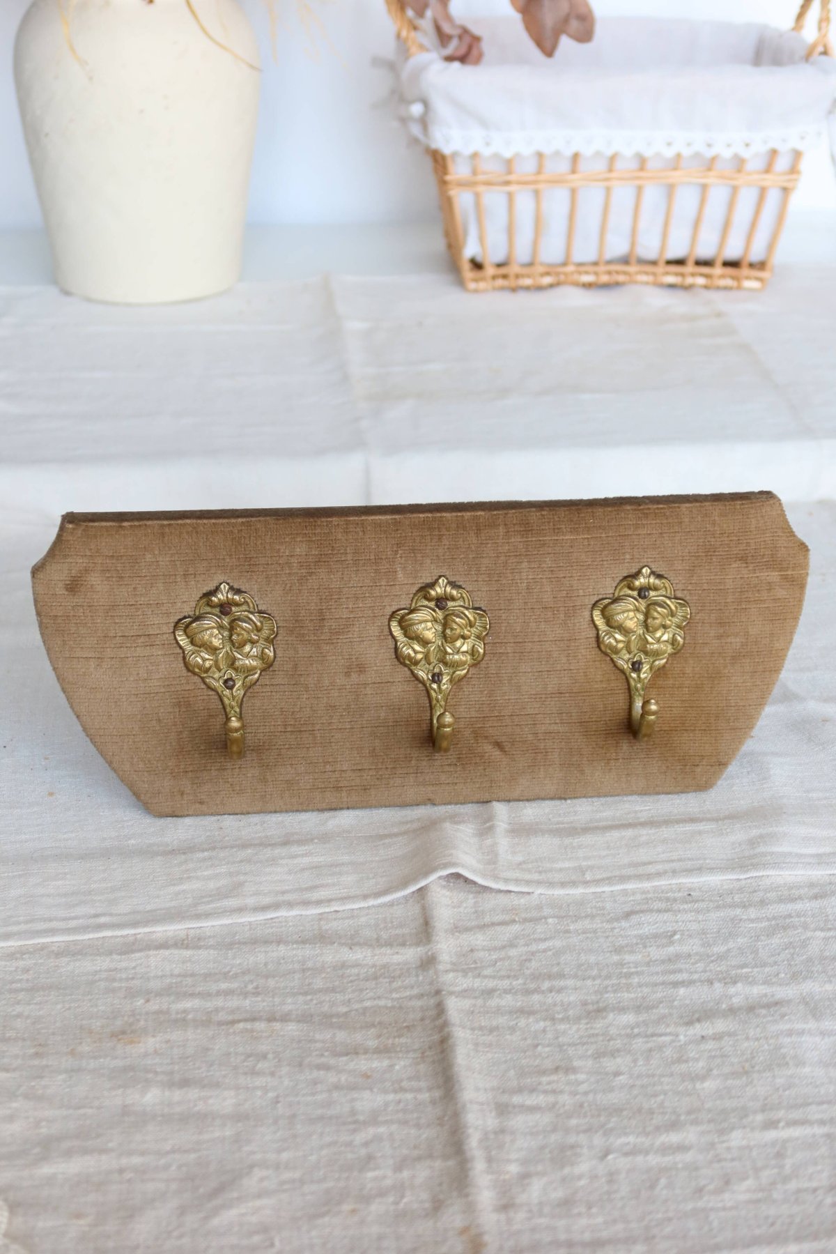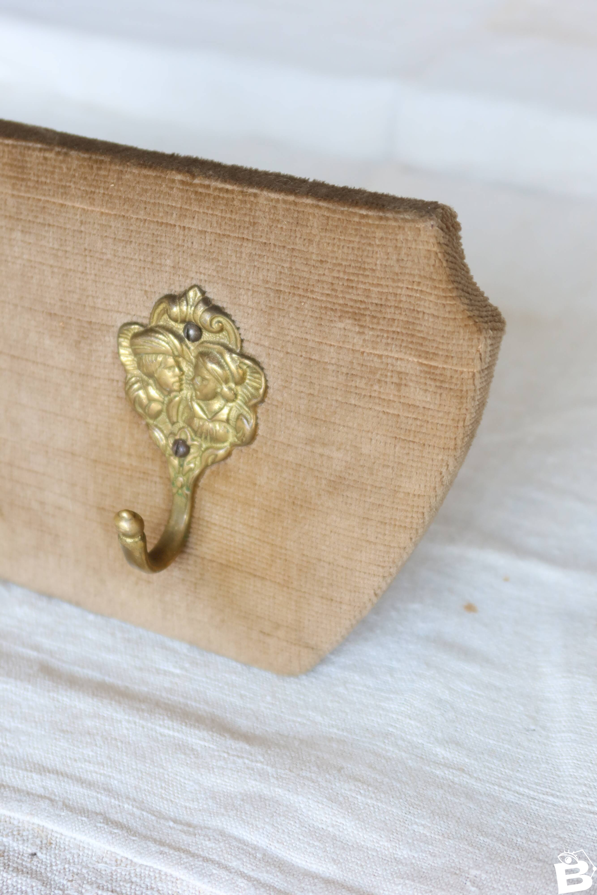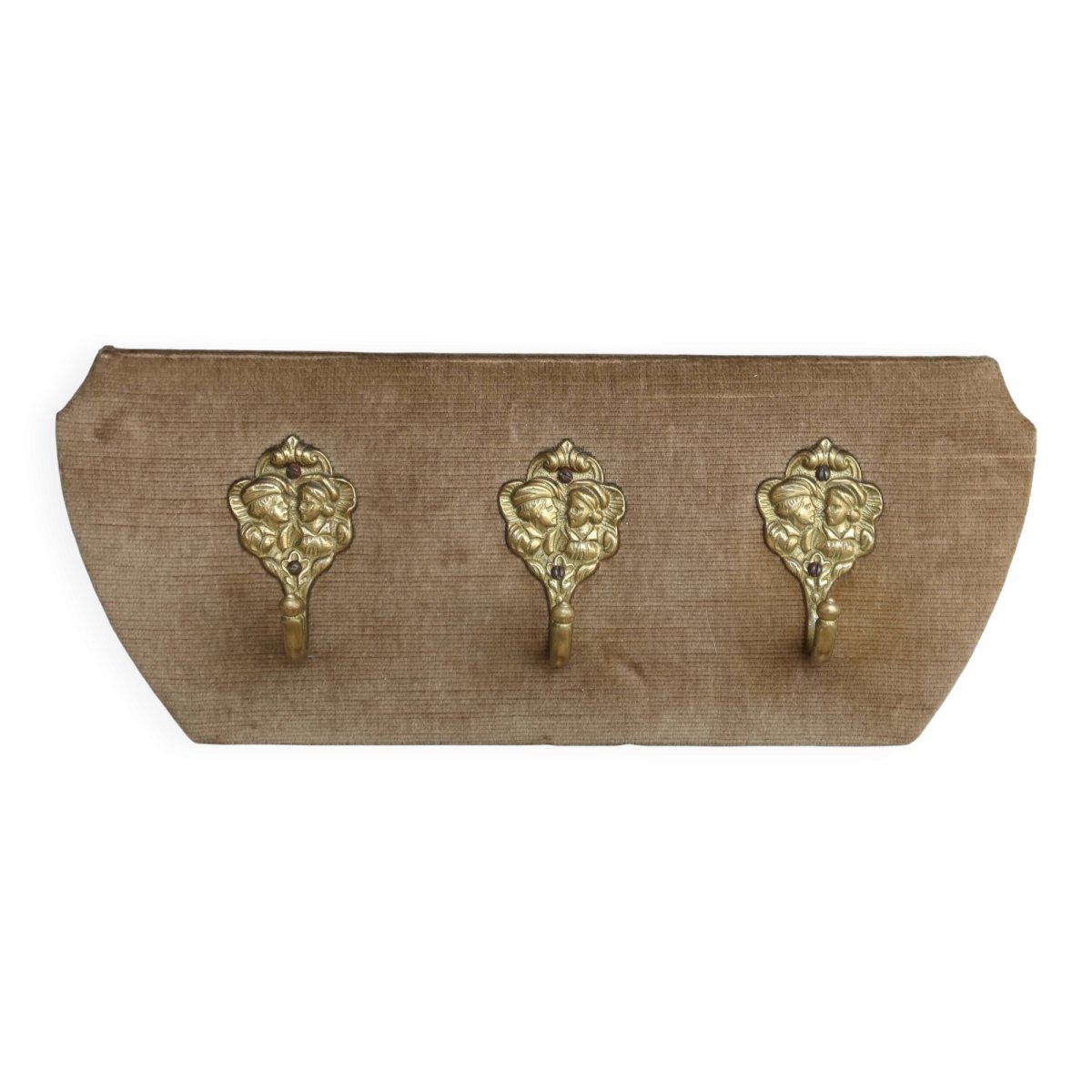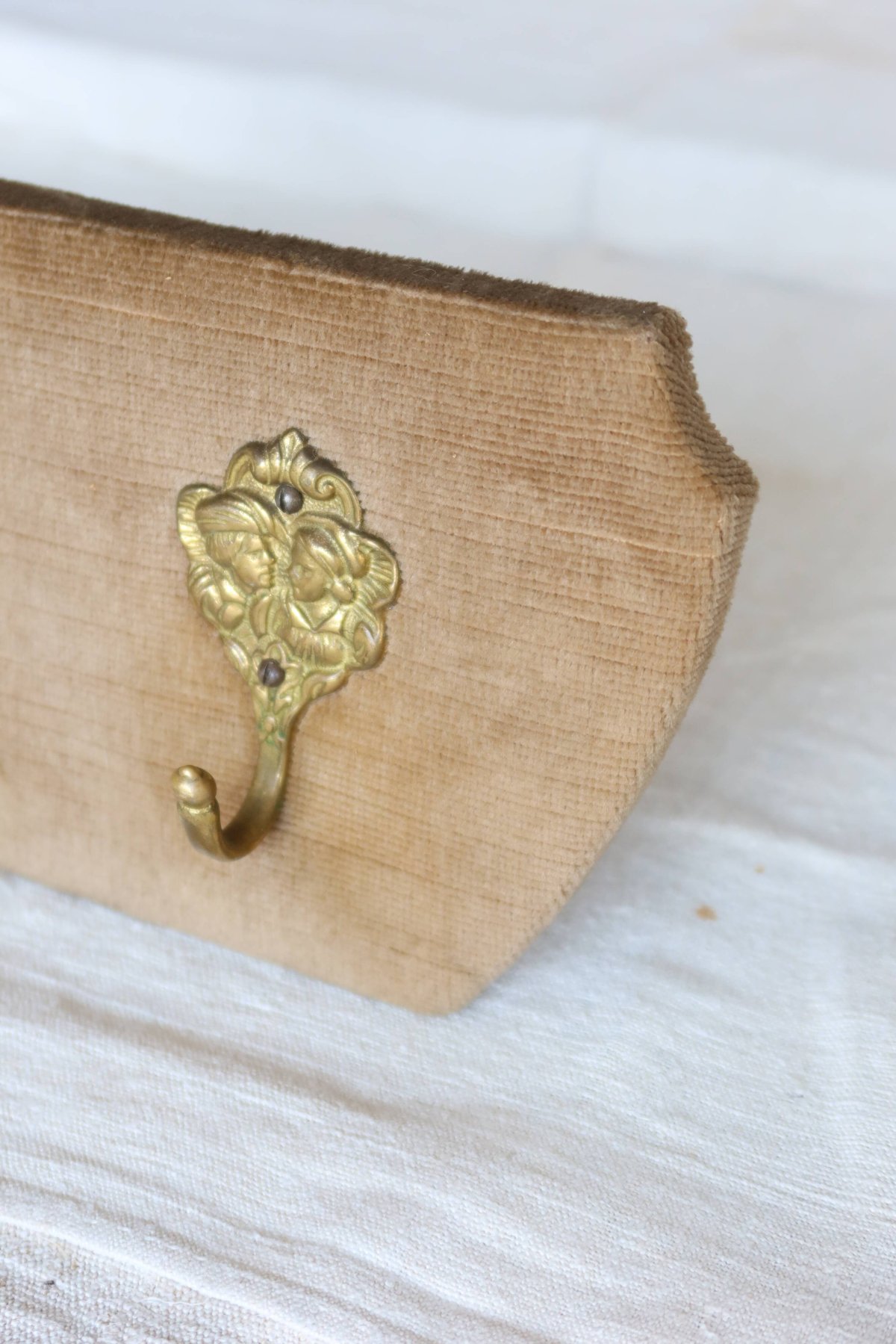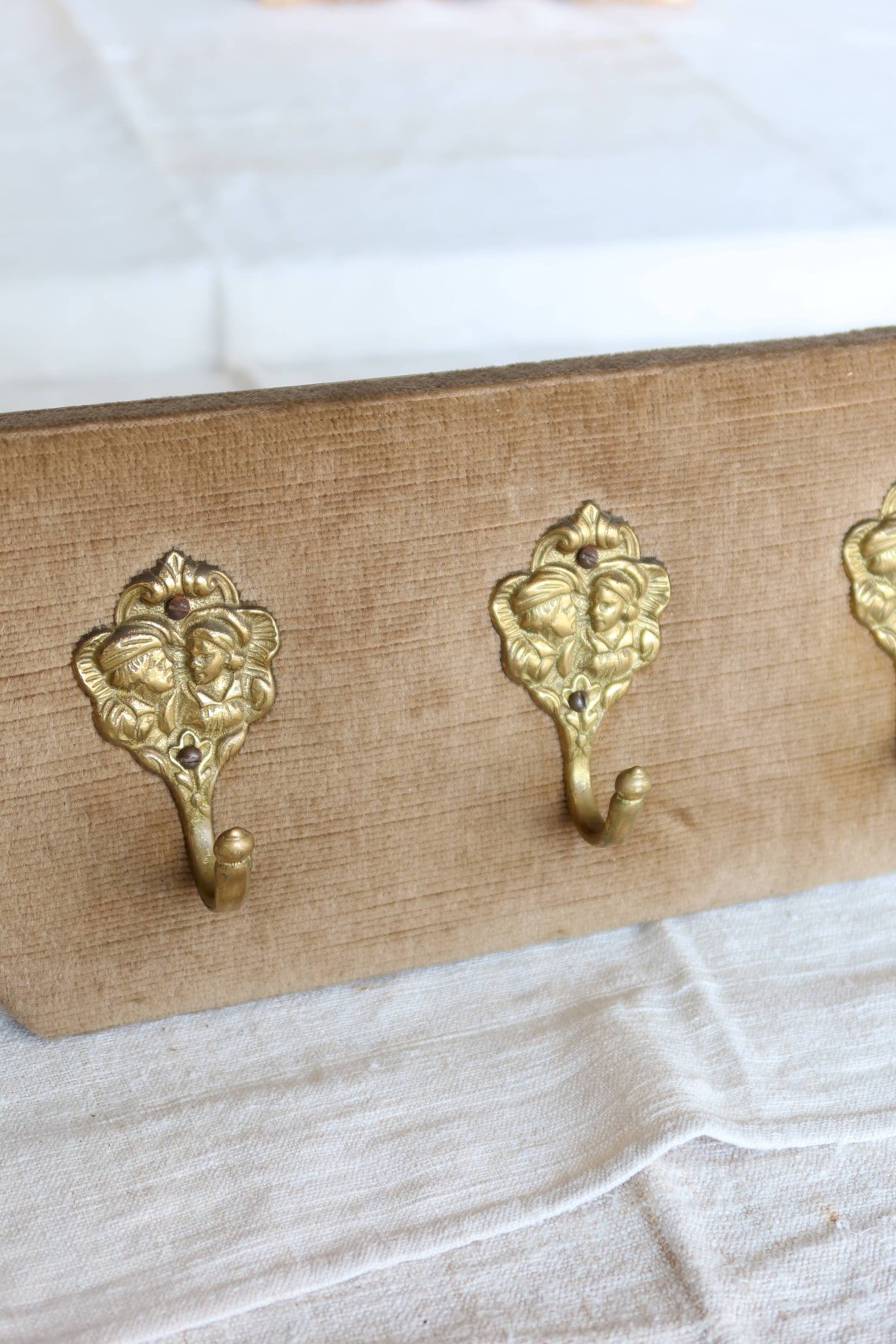 Charming wall-mounted coat rack covered in khaki velvet, adorned with three intricately designed brass hooks with a romantic look.