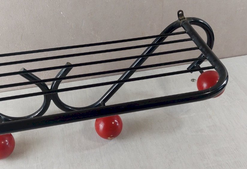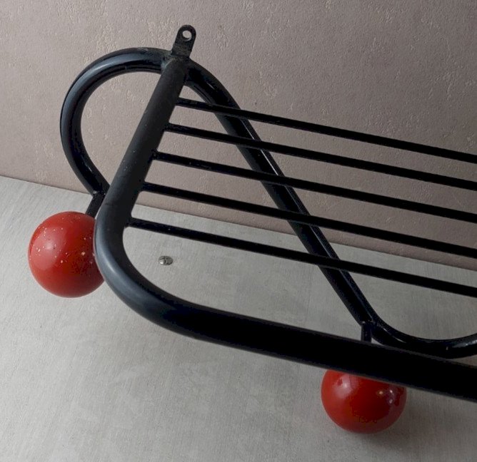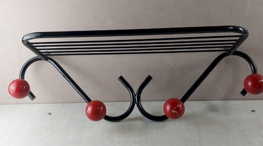 Vintage wall-mounted coat rack, made of iron + wooden balls, by Roger Feraud, 1950s, unsigned, in good condition, with paint wear. Total dimensions: 72 cm x 20 cm, depth 24 cm. See photos. Check out my other items! Reduced shipping costs for combined purchases. Authenticity: Original.