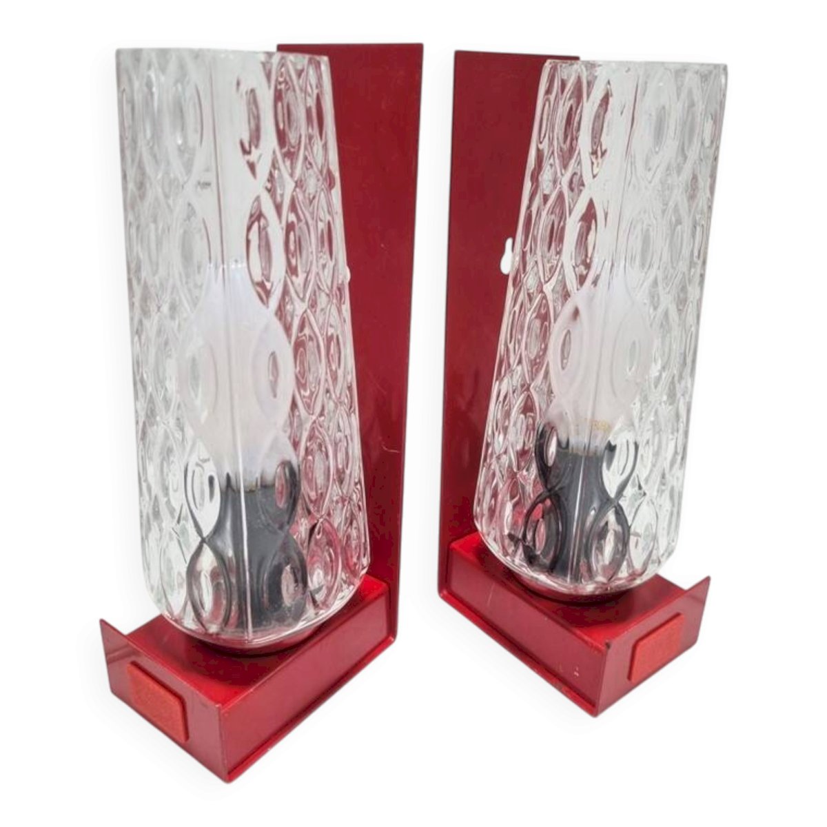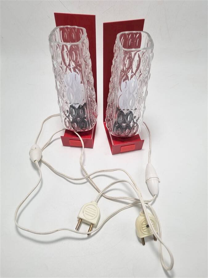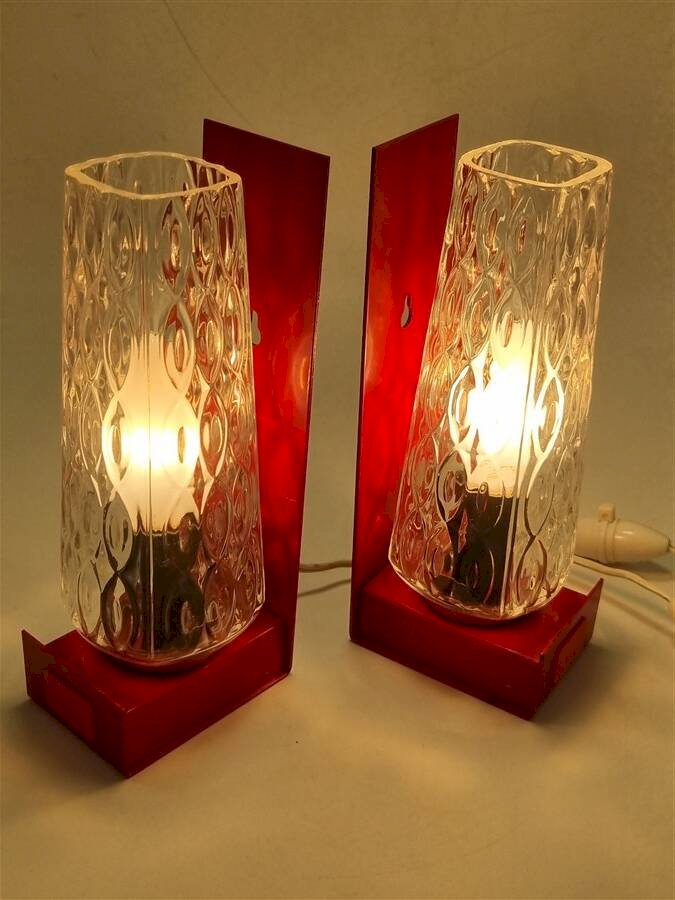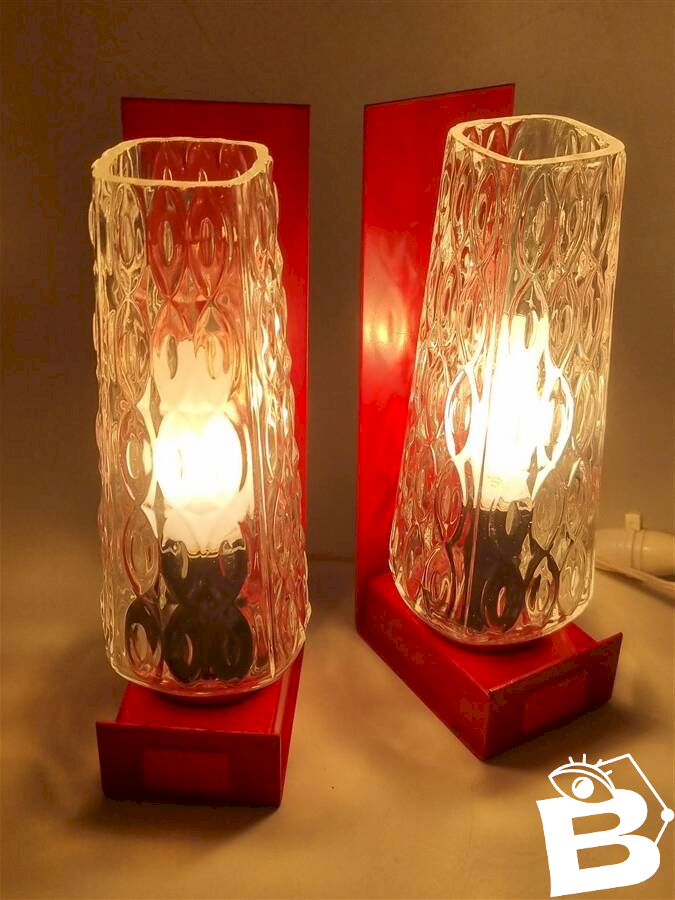 They were designed to be versatile: bedside lamps (simply placed on their base) or wall sconces (thanks to the notches in the bases). Some signs of wear on the bases. E14 sockets. Dimensions: 6 X 8.5 X 21 cm. Weight of the pair: approximately 1.4 kg.