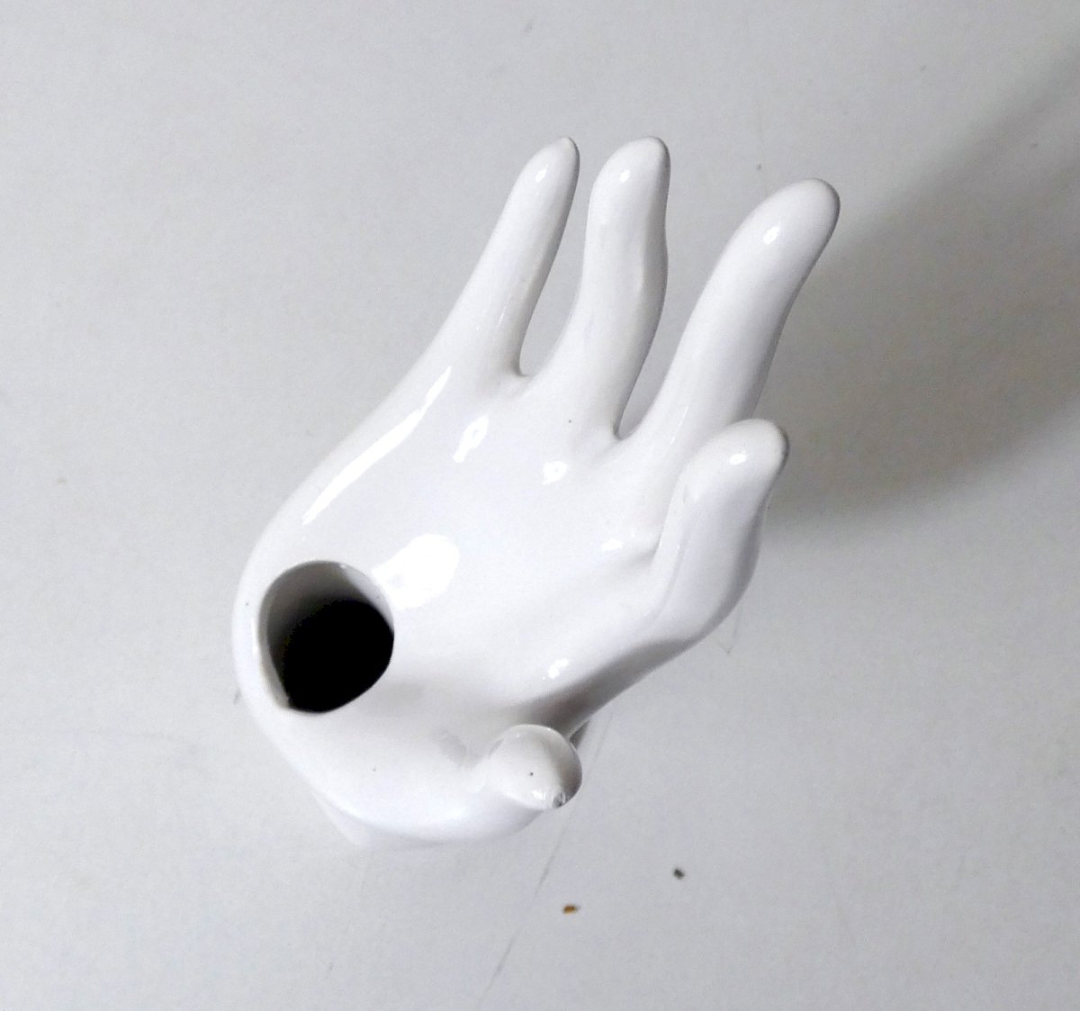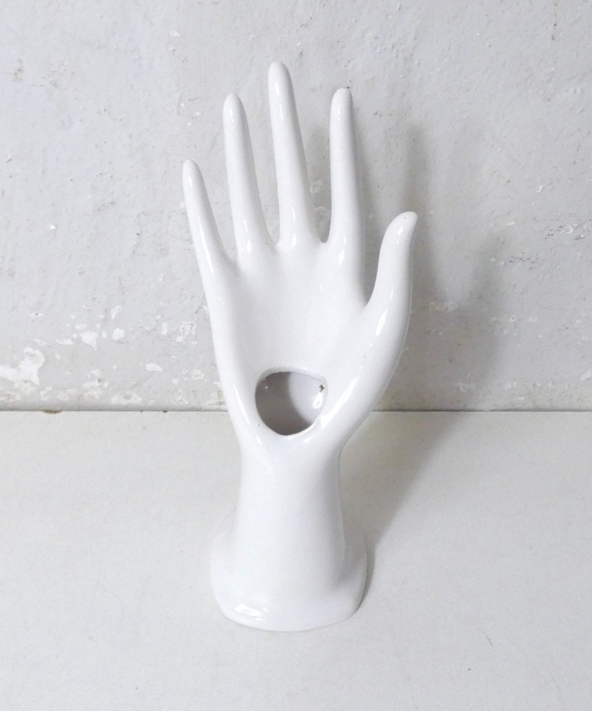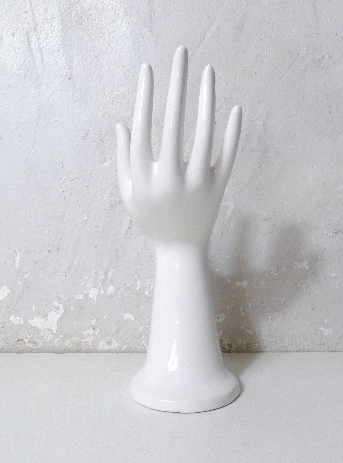 White ceramic hand, vintage ring holder. Can also serve as a small solo vase. Height: 20 cm. In excellent condition. Condition: Used item. Item has been used. Item shows some superficial signs of wear, fully operational and functioning properly. It may be a display model or an item returned to the store after a short period of use. Any possible imperfections. Type: vase. Material: Ceramic.