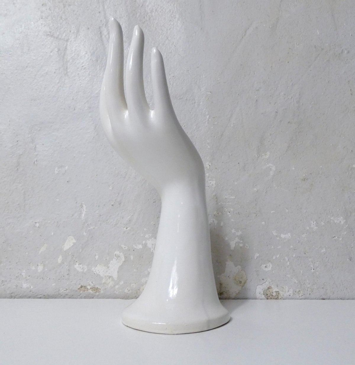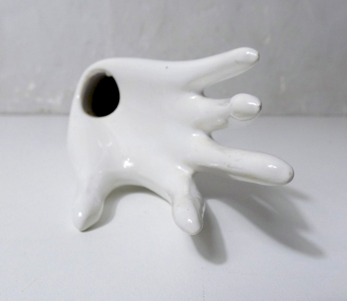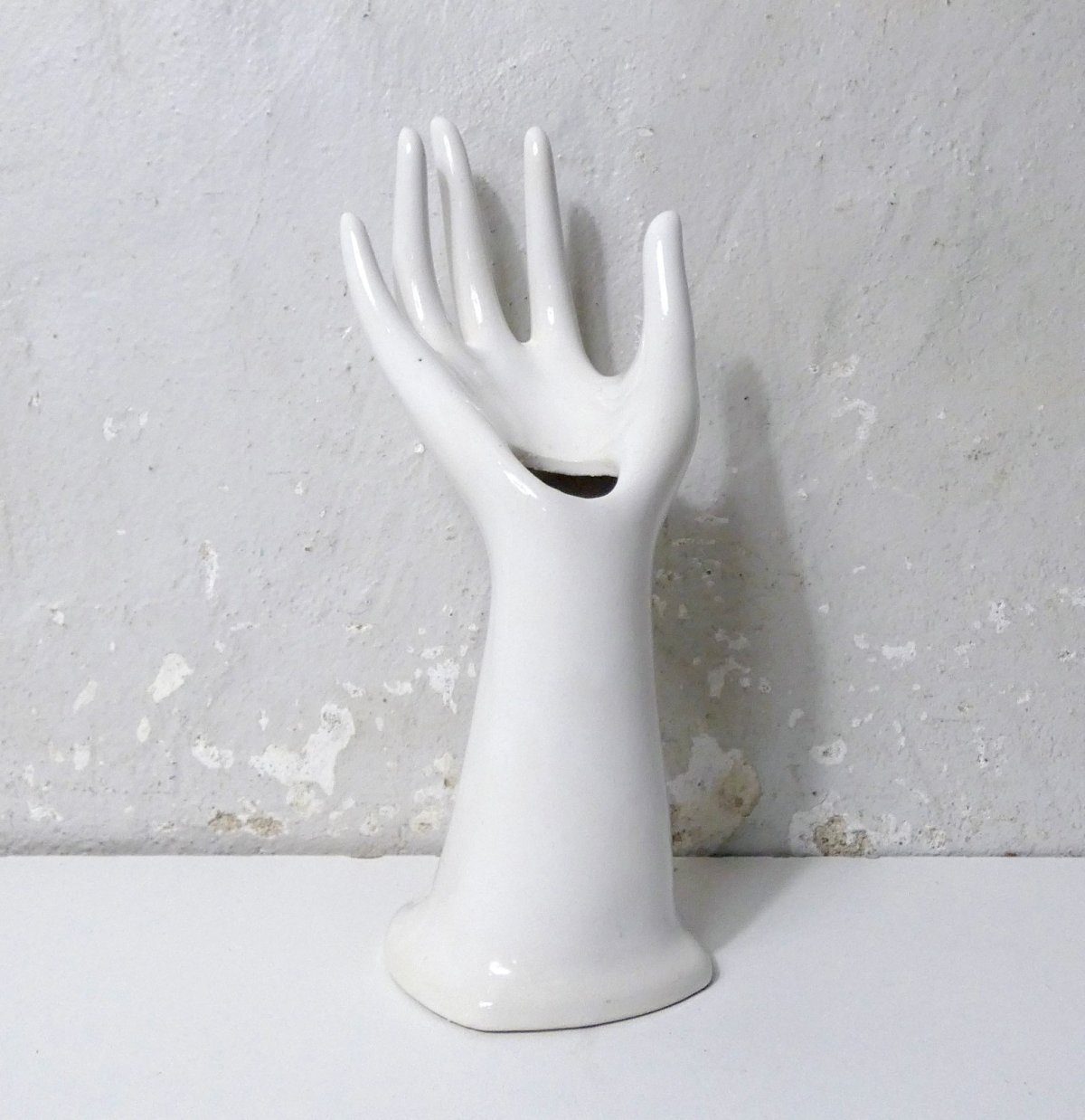 White ceramic hand, vintage ring holder. Can also be used as a small bud vase. Height: 19 cm. In excellent condition.