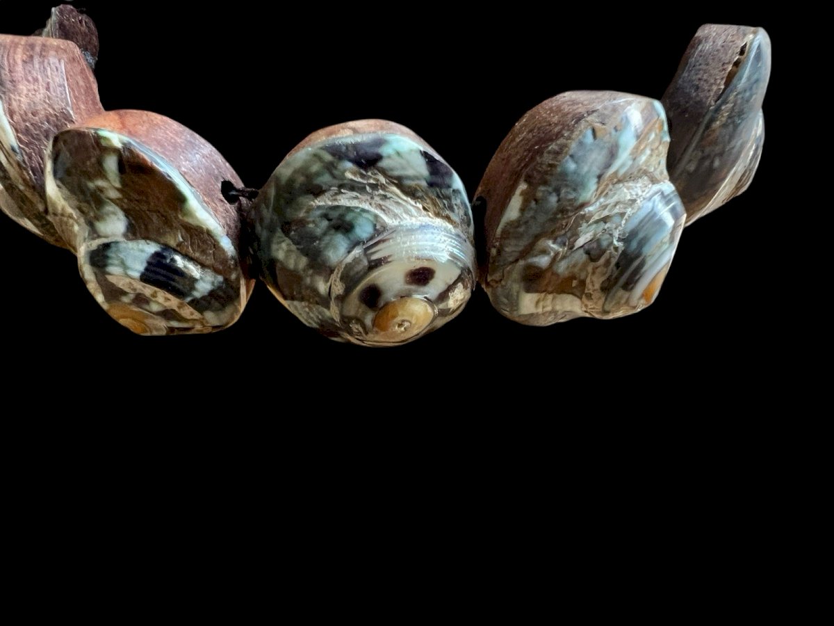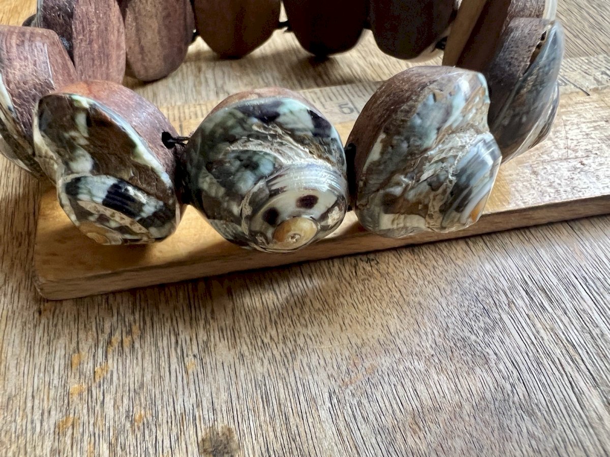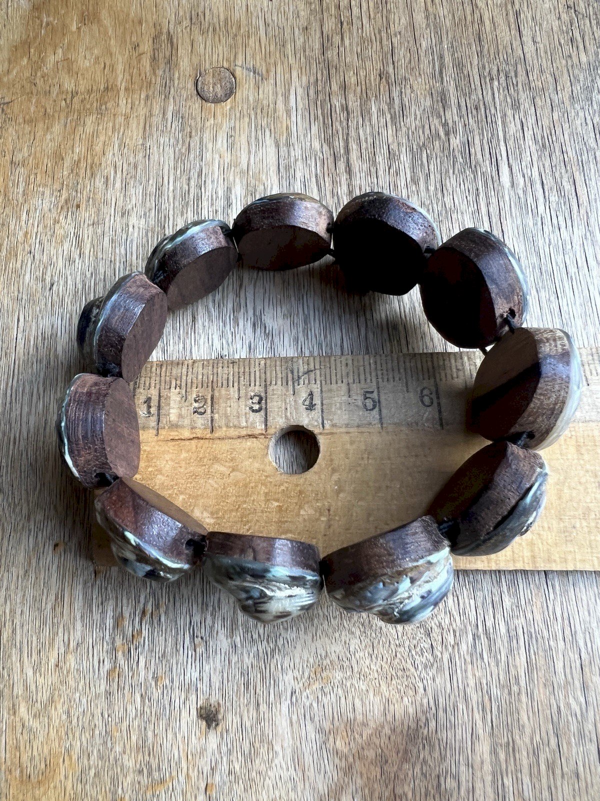 Vintage wood and shell bracelet on elastic, decorative charm collection. Diameter of the bracelet without stretching is about 6 cm, approximately 2 cm. The elastics hold, but need to be changed. Condition: Used; item has been worn...Used; item has been worn. Any potential imperfections. Style: Bracelet Material: Wood