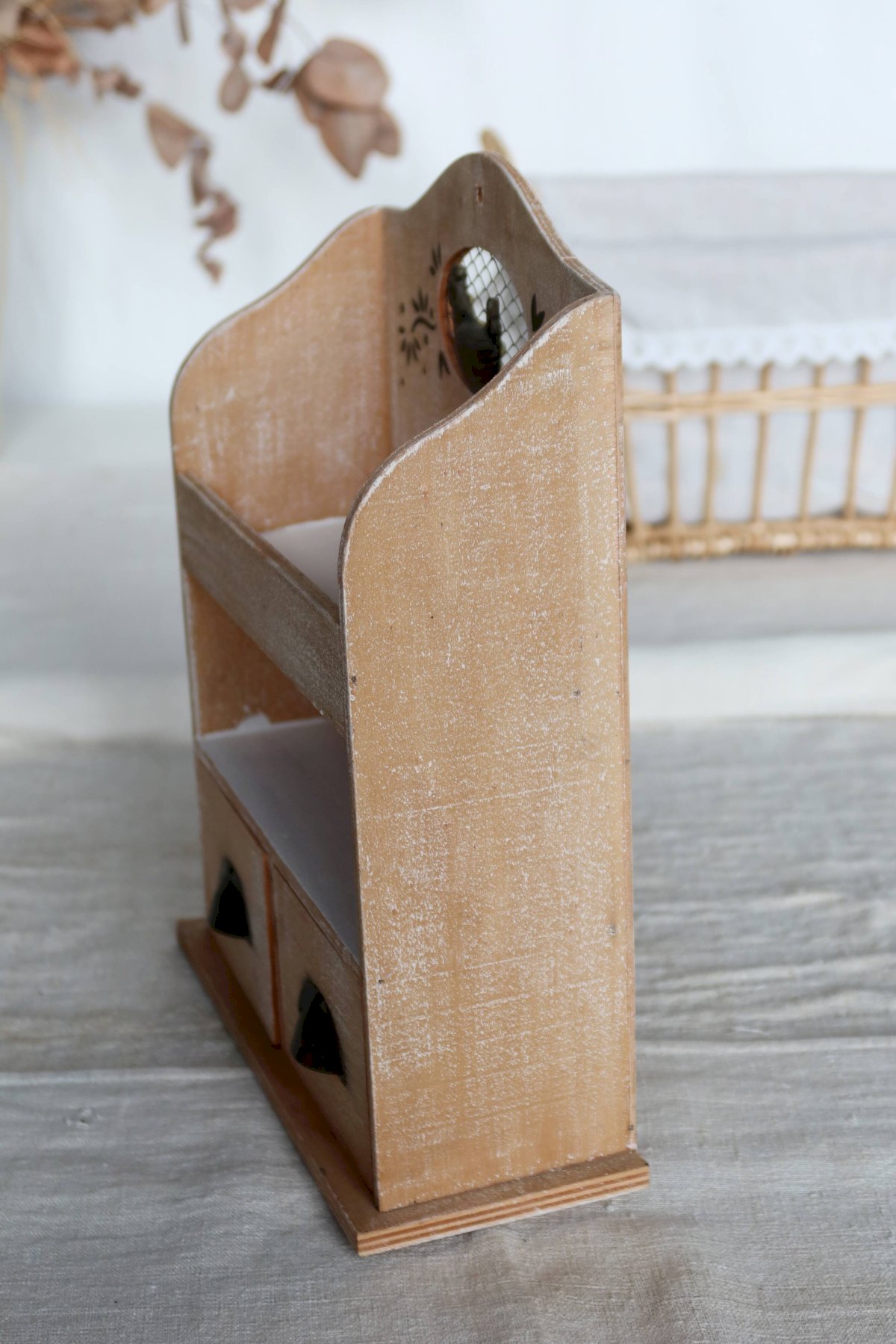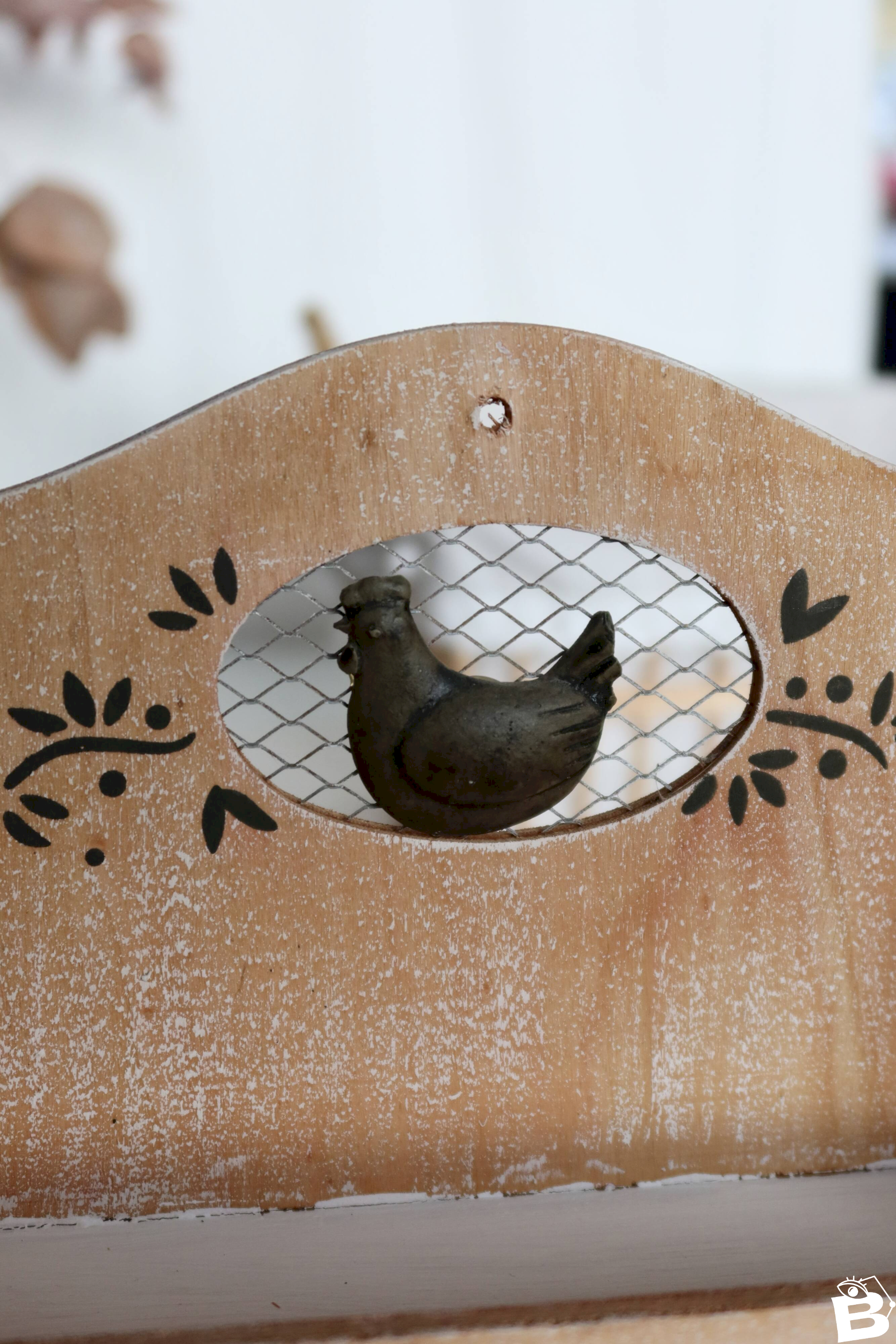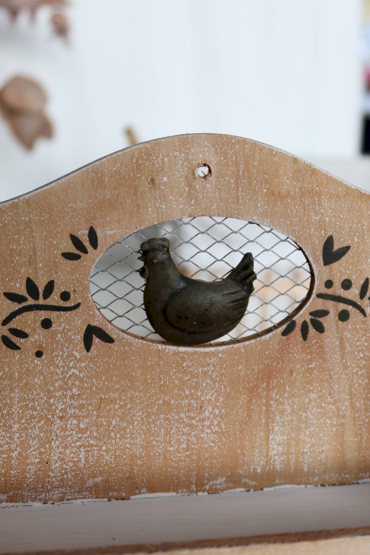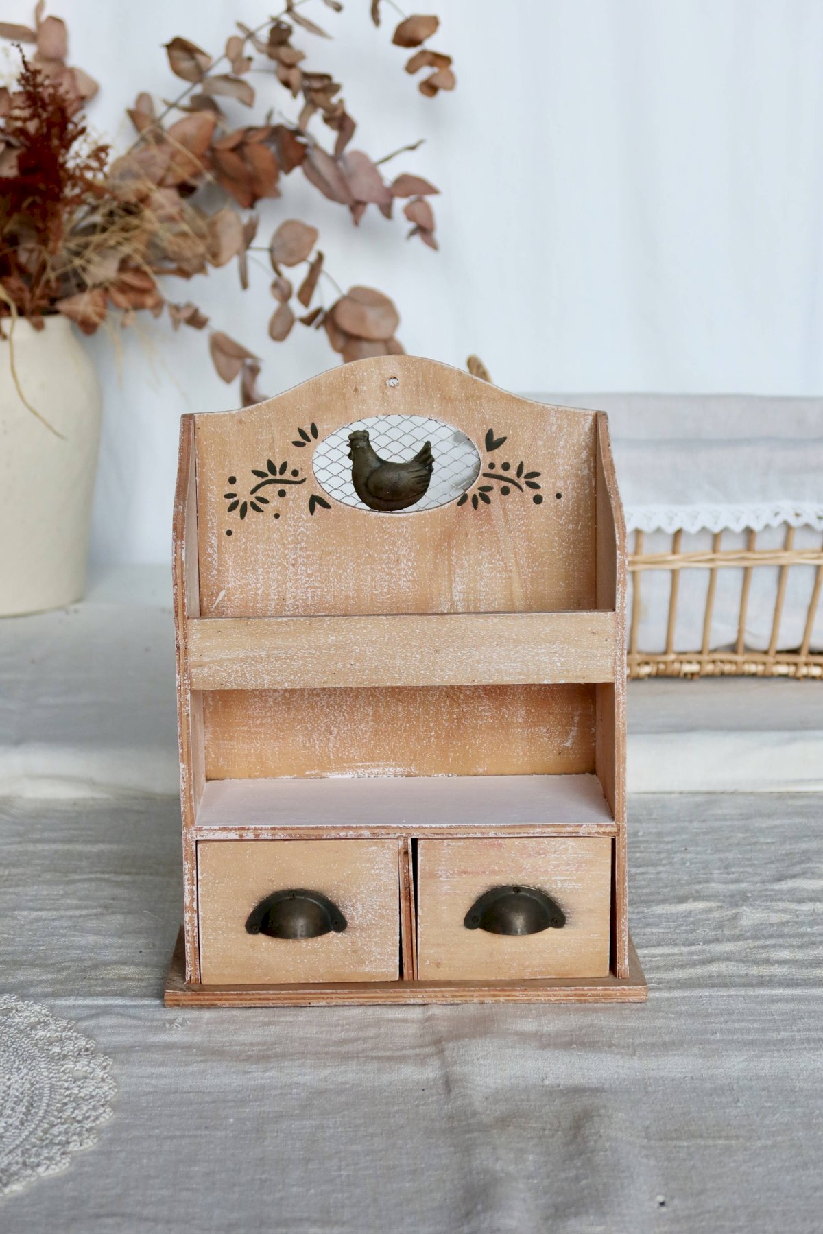 Small rustic shelf made of stained and bleached wood, the front decorated with a chicken behind an oval grid, featuring two open shelves for spices, cups, or trinkets.