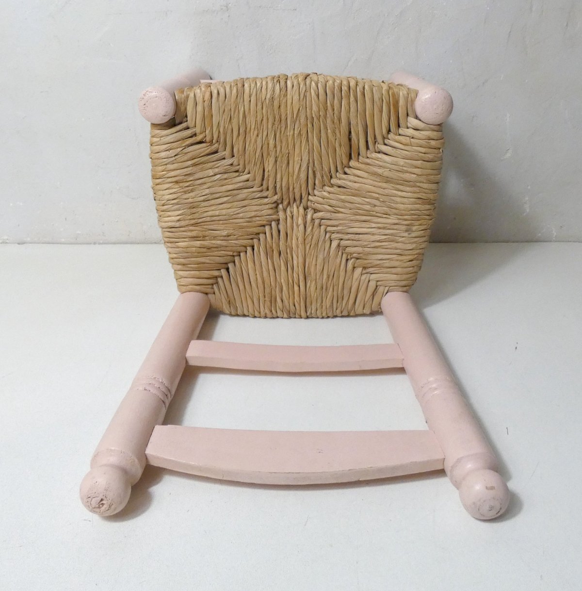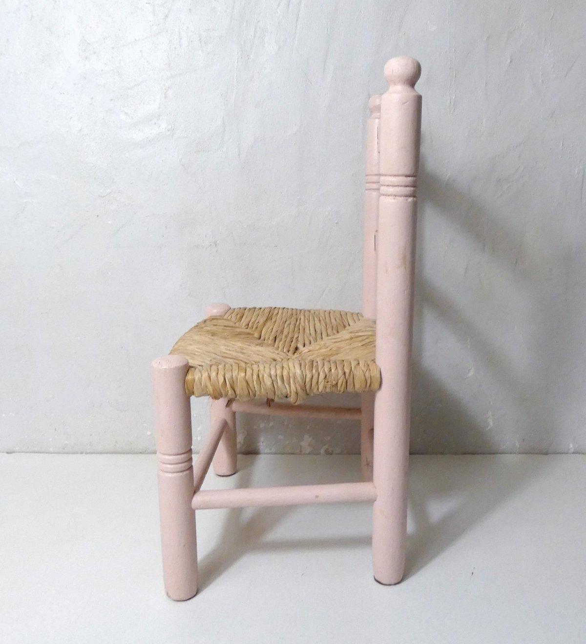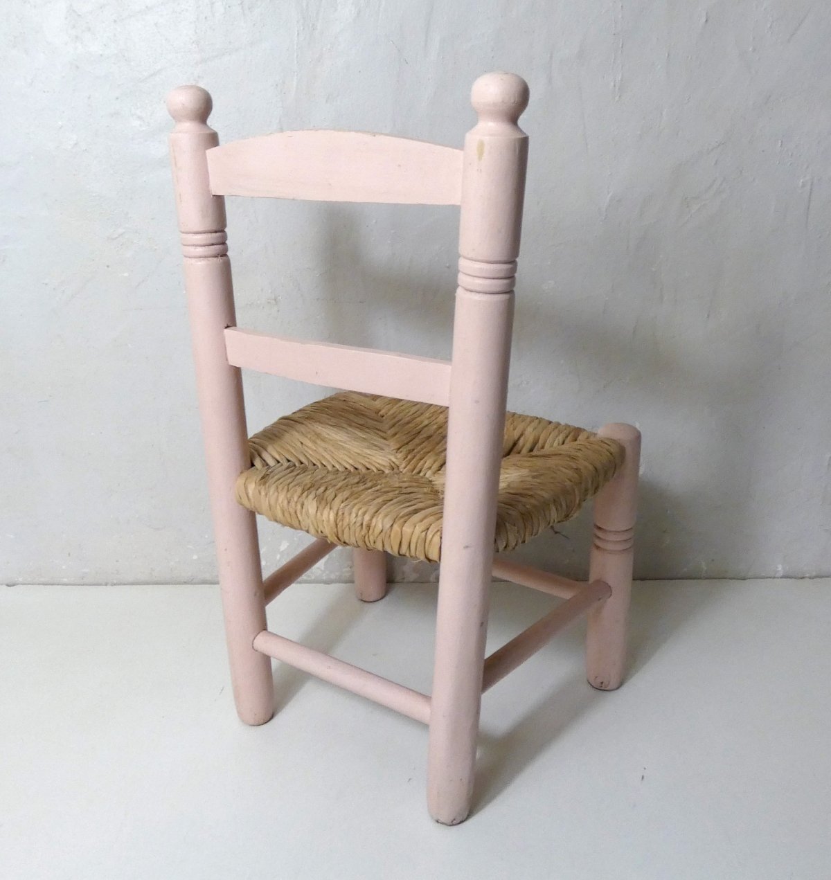 Old pink little chair for children. Wooden structure, straw seat. Height: 53.5 cm. Width: 30.5 cm. Depth: 25 cm. Seat height: 24.5 cm. It is in very good condition, stable, and functional.