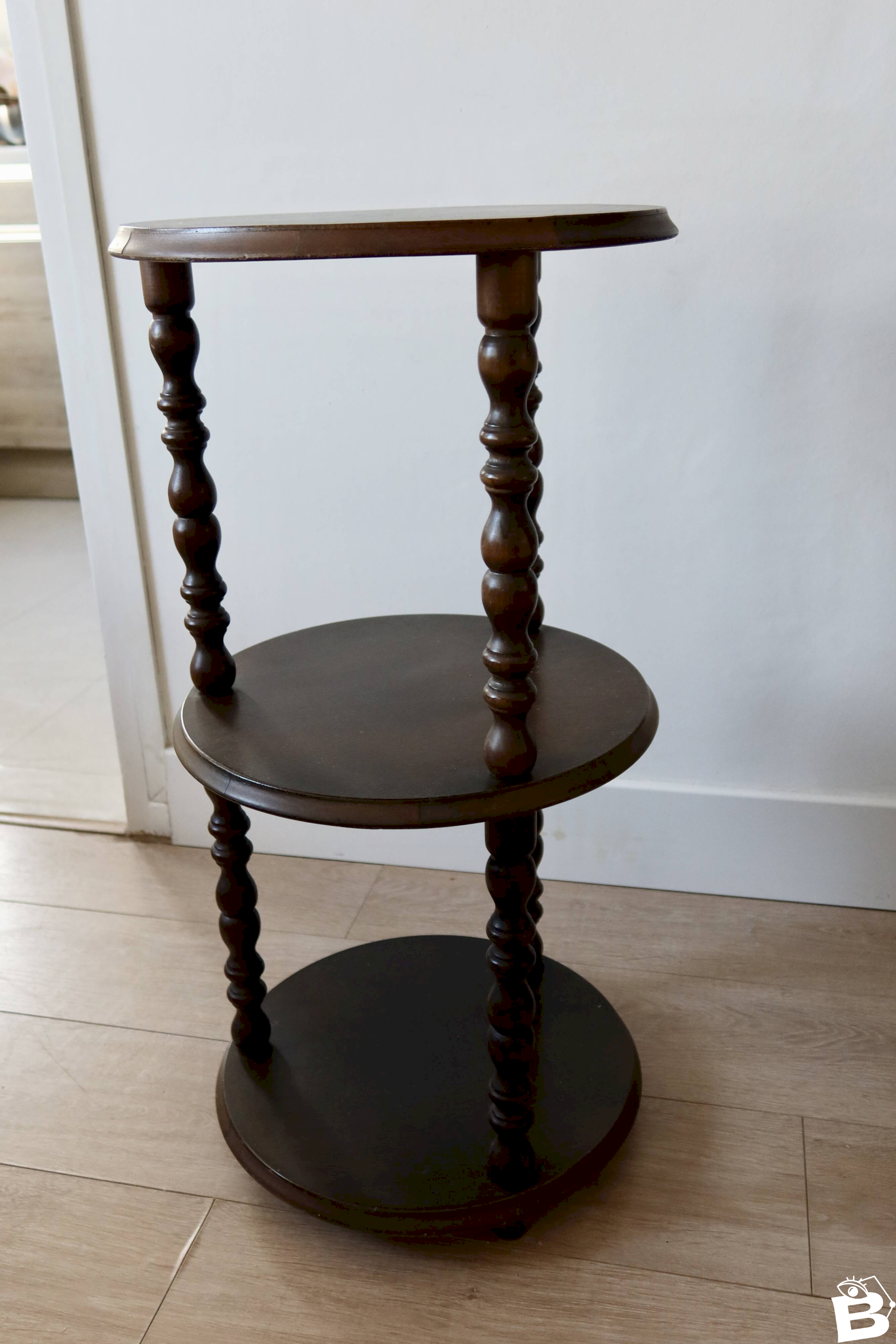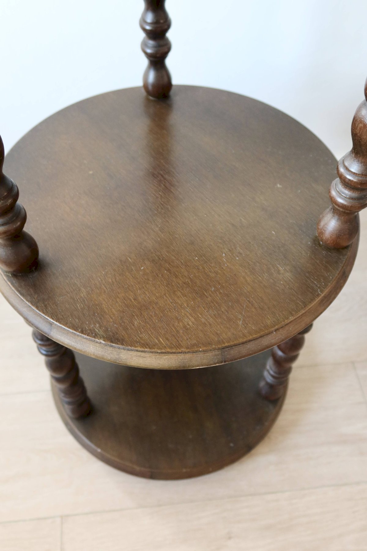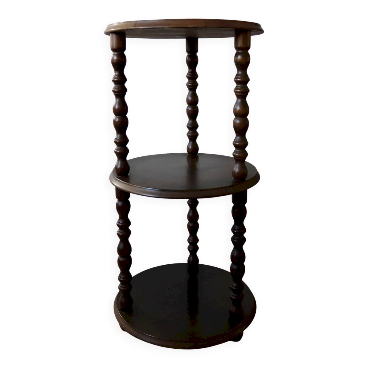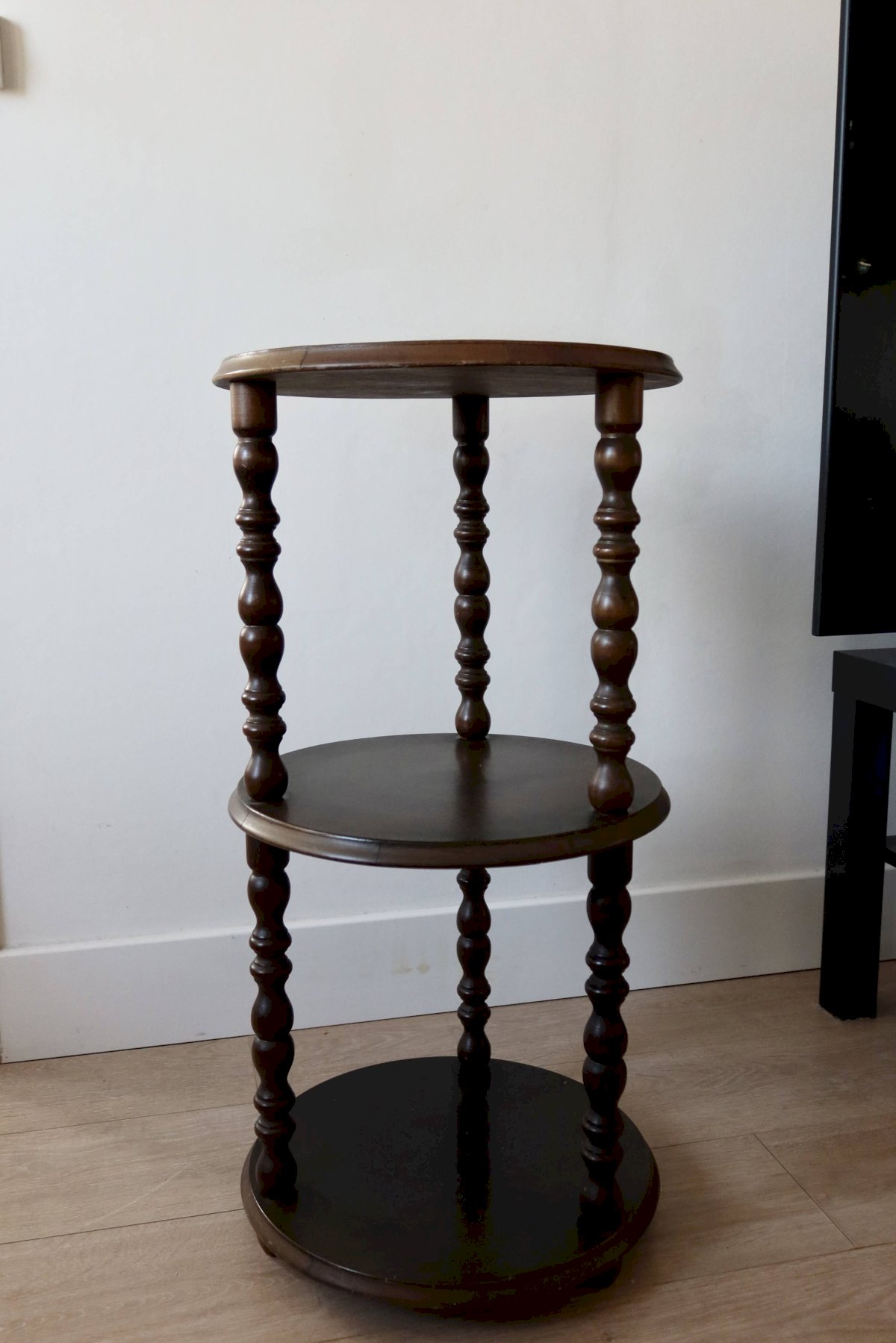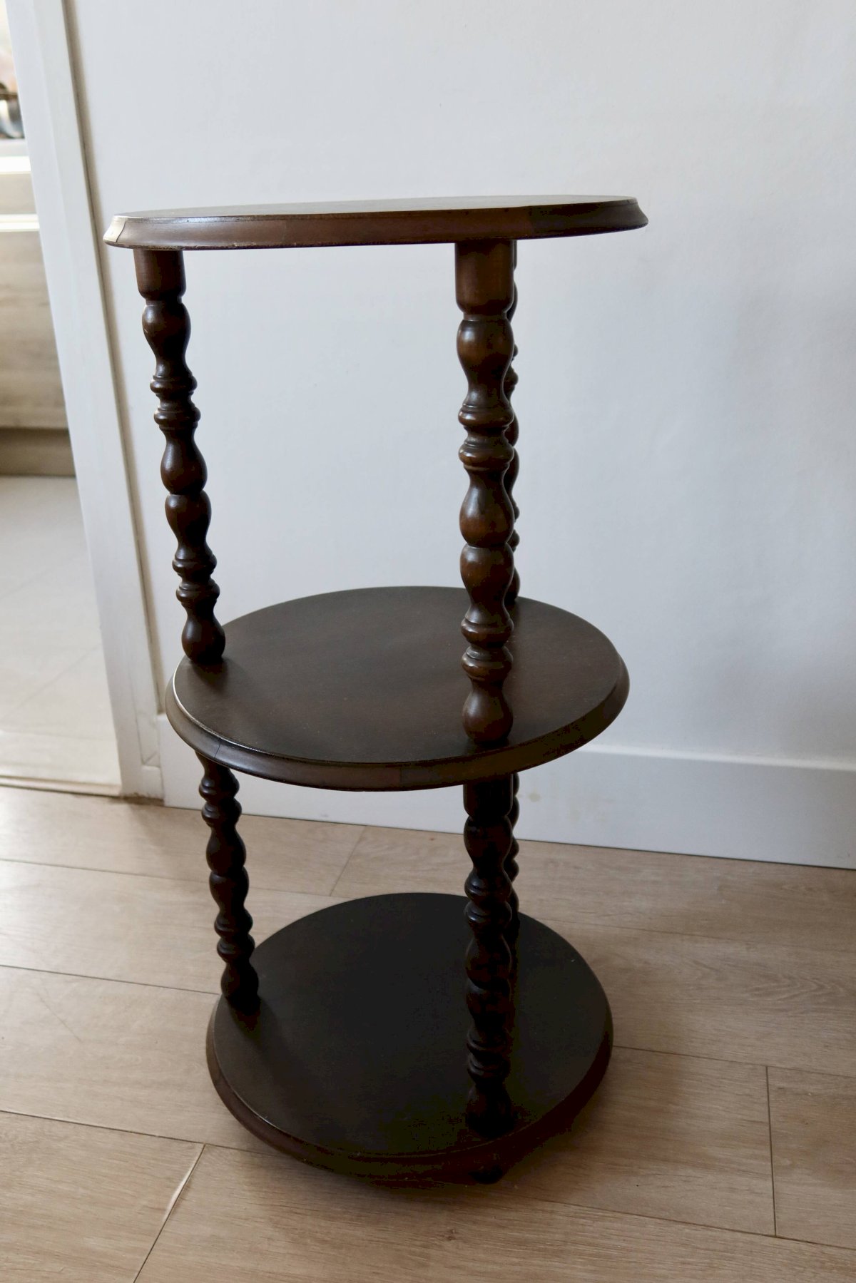Vintage dark wood side table, consisting of three round trays connected by turned legs, with a classic and timeless charm.