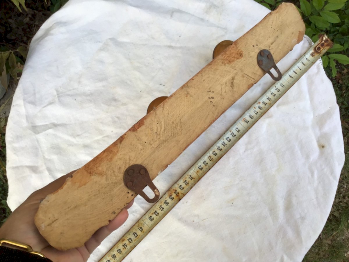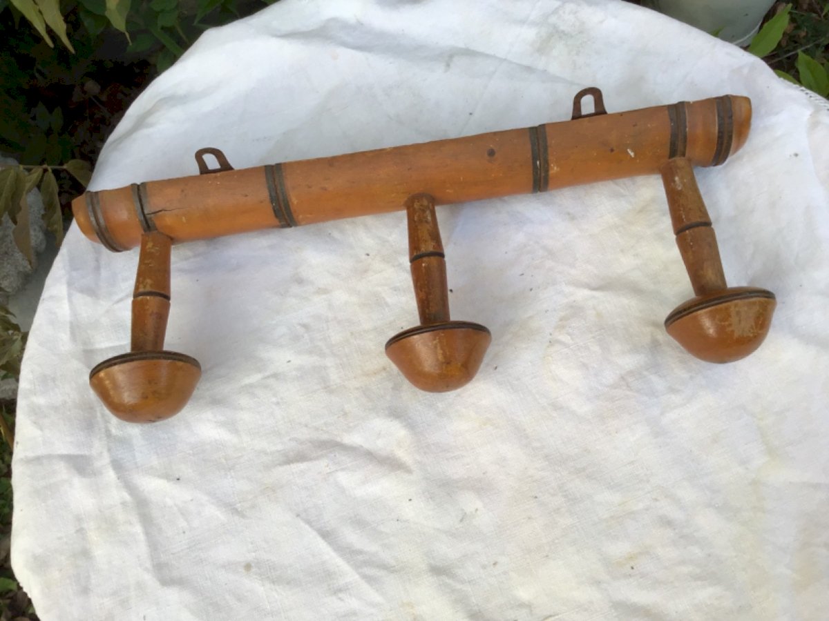 Wall-mounted coat rack with 3 hooks, made of wood. Length: In good condition. Color: Brown. Material: Wood. Style: 1940-1960.