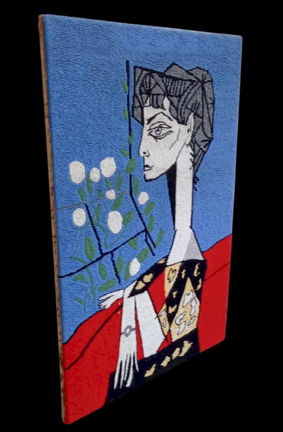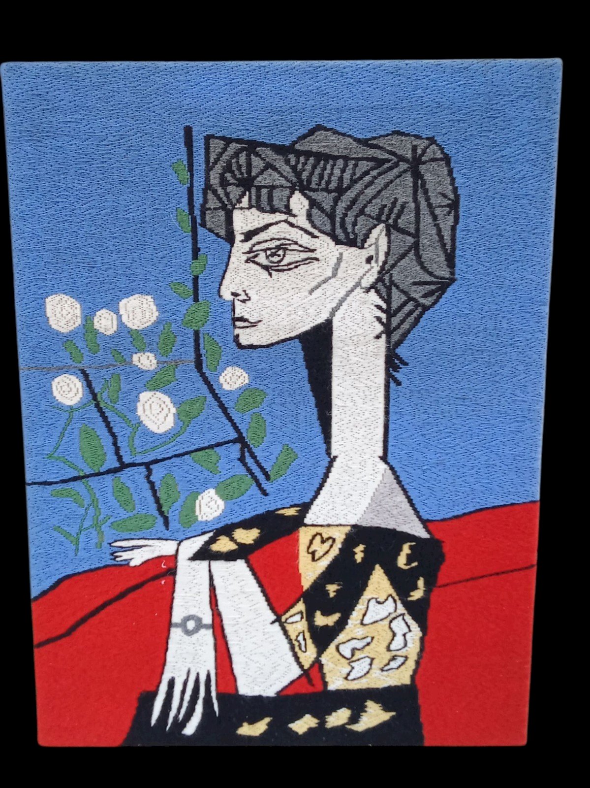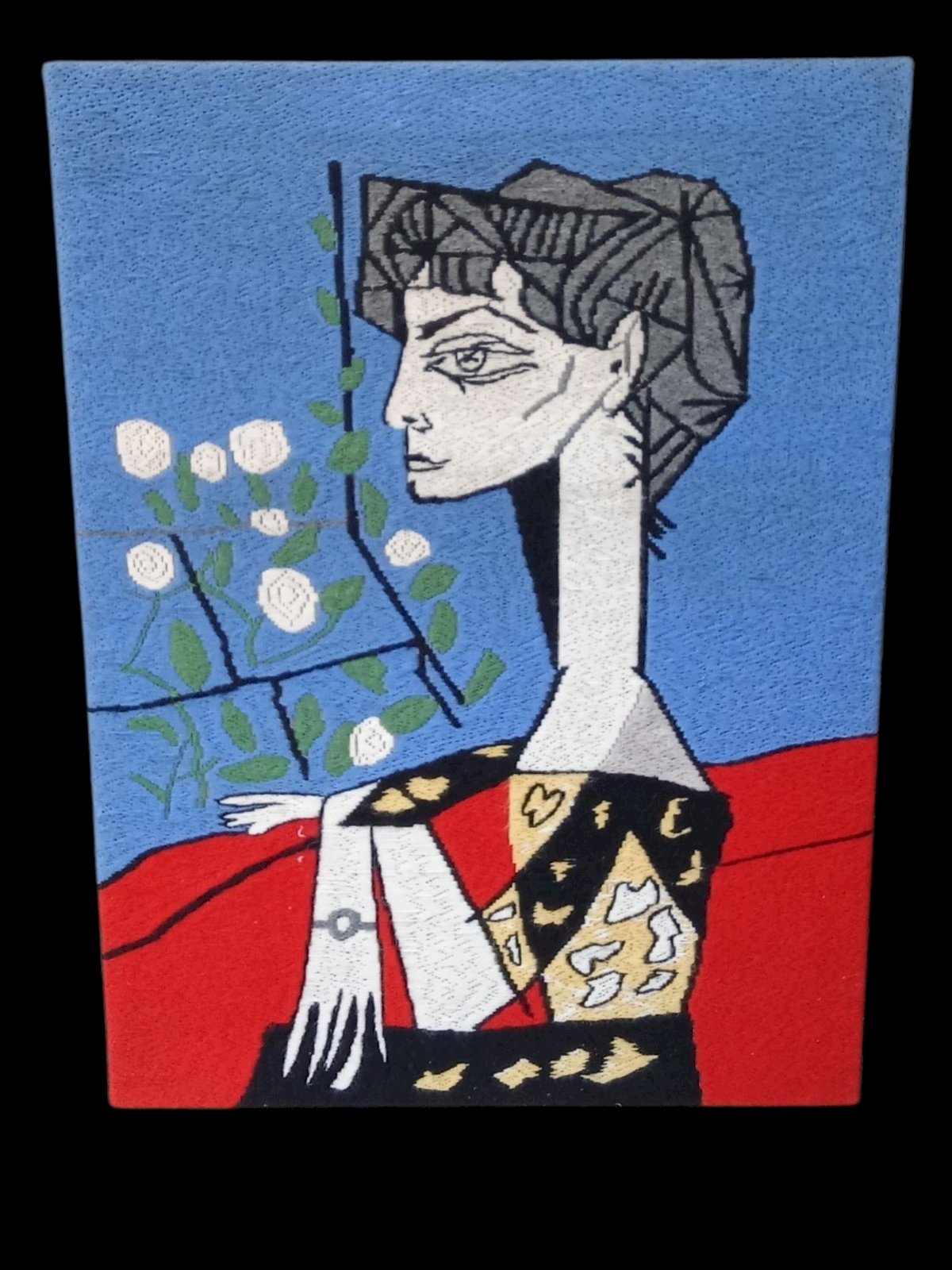 Vintage Large Tapestry Wool Embroidered Needlework Reproduction of the painting Jacqueline with Flowers by Pablo Picasso Pure 1970s Very nice colors Good condition. Picasso Dimensions 58.3 cm x 78 cm