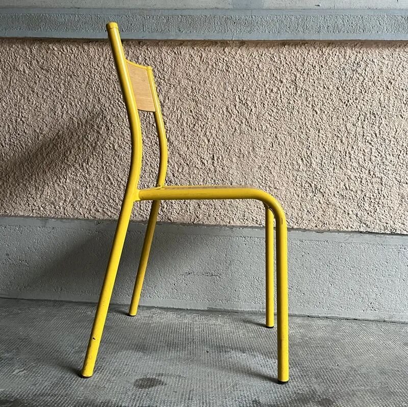 Its yellow lacquered metal legs bring a touch of dynamism and modernity, perfectly balanced by the warmth of its light wooden seat and backrest.