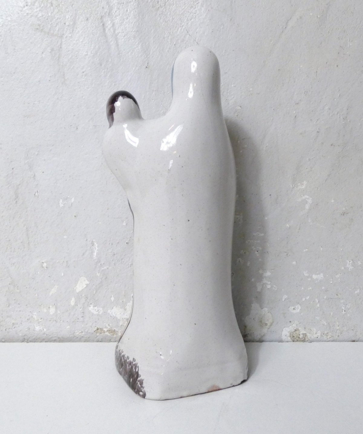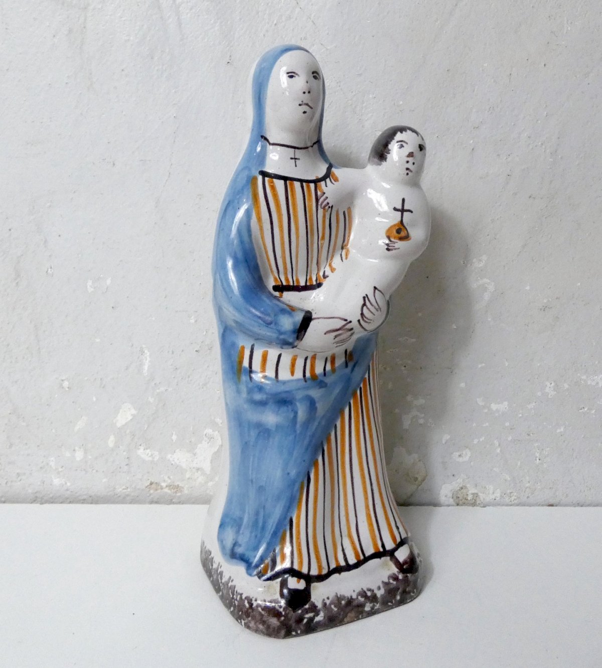 Virgin and Child, an ancient faience figurine. Manufacture to be determined. Probably made in the tradition of Nevers faience. The piece is modeled and decorated by hand. The underside is left raw with a vent hole, typical of regional faience factories. The whole exhibits a beautiful patina and remains in good overall condition, with slight manufacturing irregularities. Height: 22 cm. Width: 9 cm. Depth: 7.5 cm. It is in very good condition, with some defects in the manufacturing: air bubble on Jesus' nose, and hair during firing, at the back of the figurine. Nice luster of the faience, no chips, no wear. Authenticity: Original Type: Statue, Sculpture Country of origin: France Material: faience Style: Unspecified Theme: Character