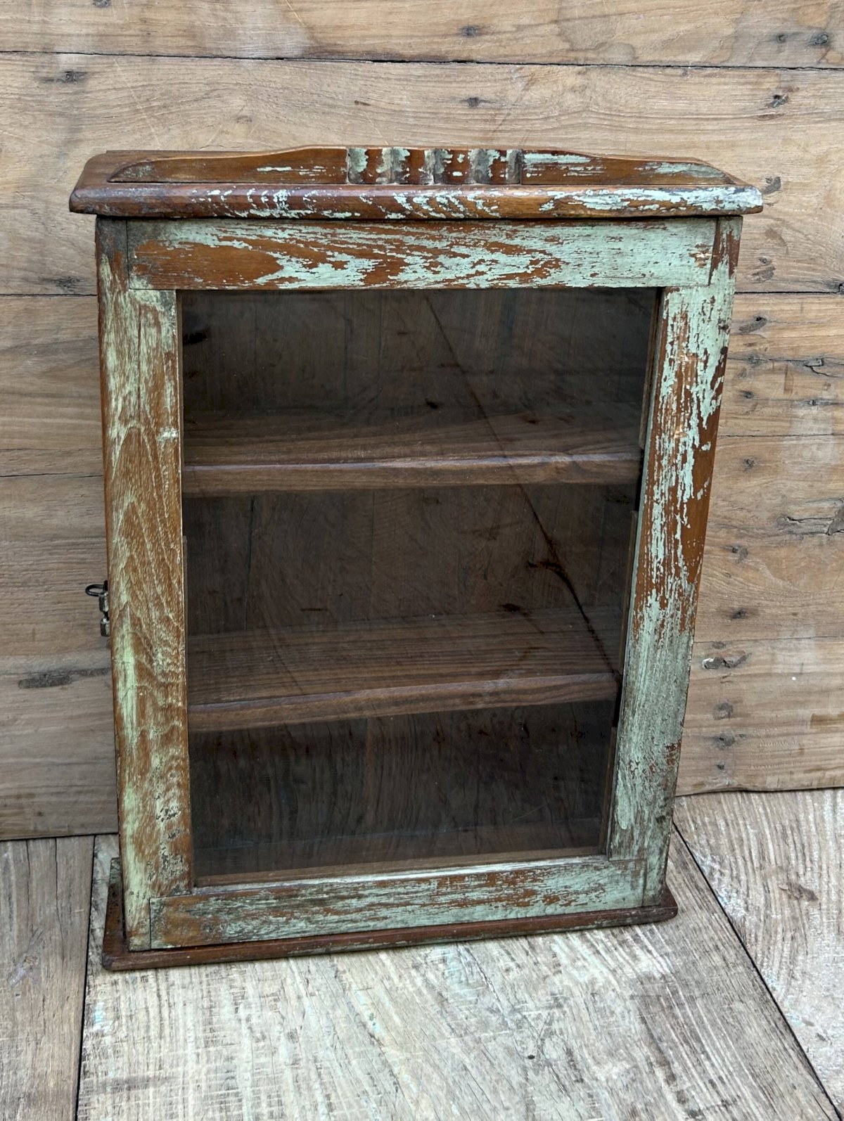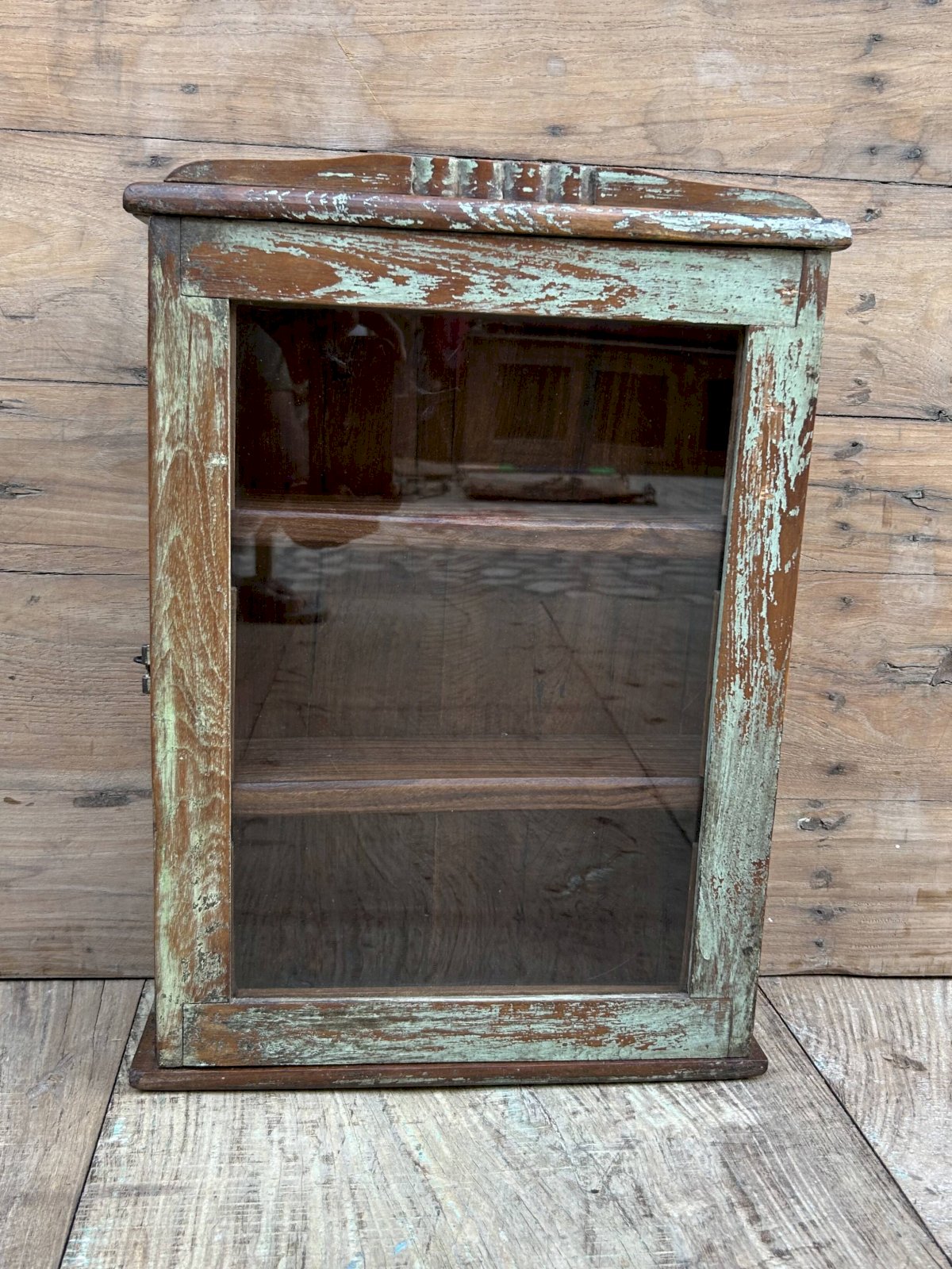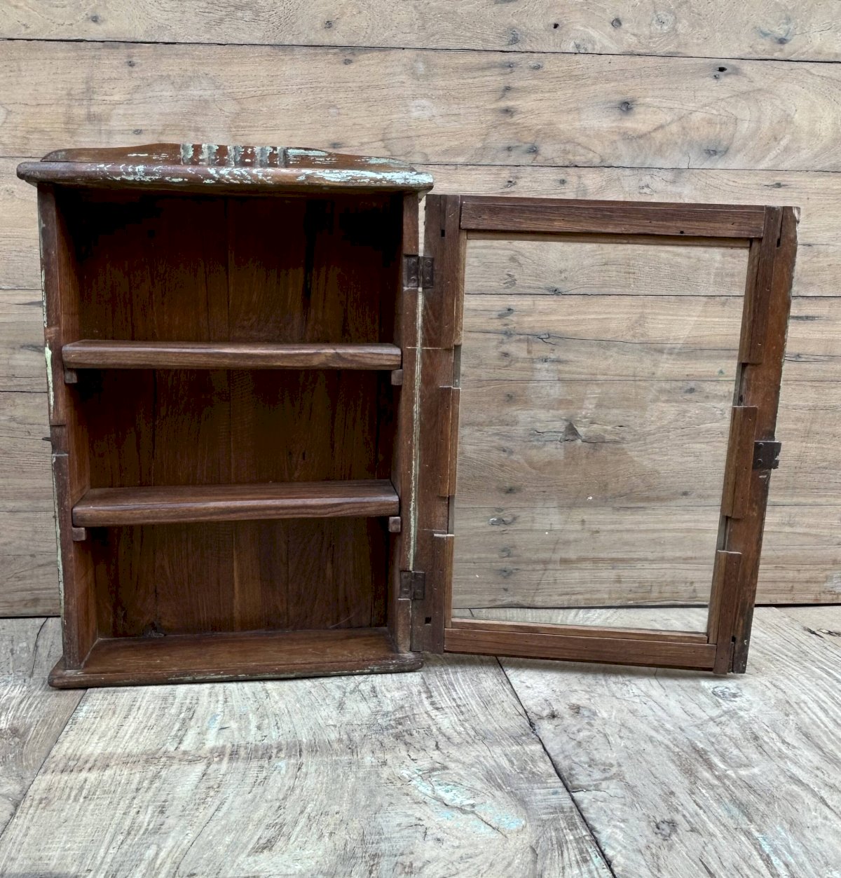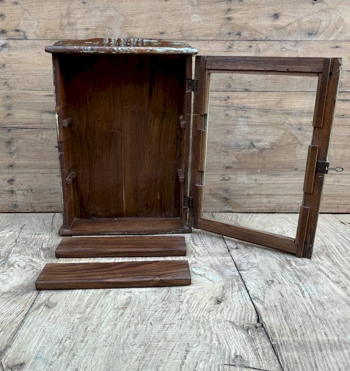 Burma teak wall display cabinet with original patina