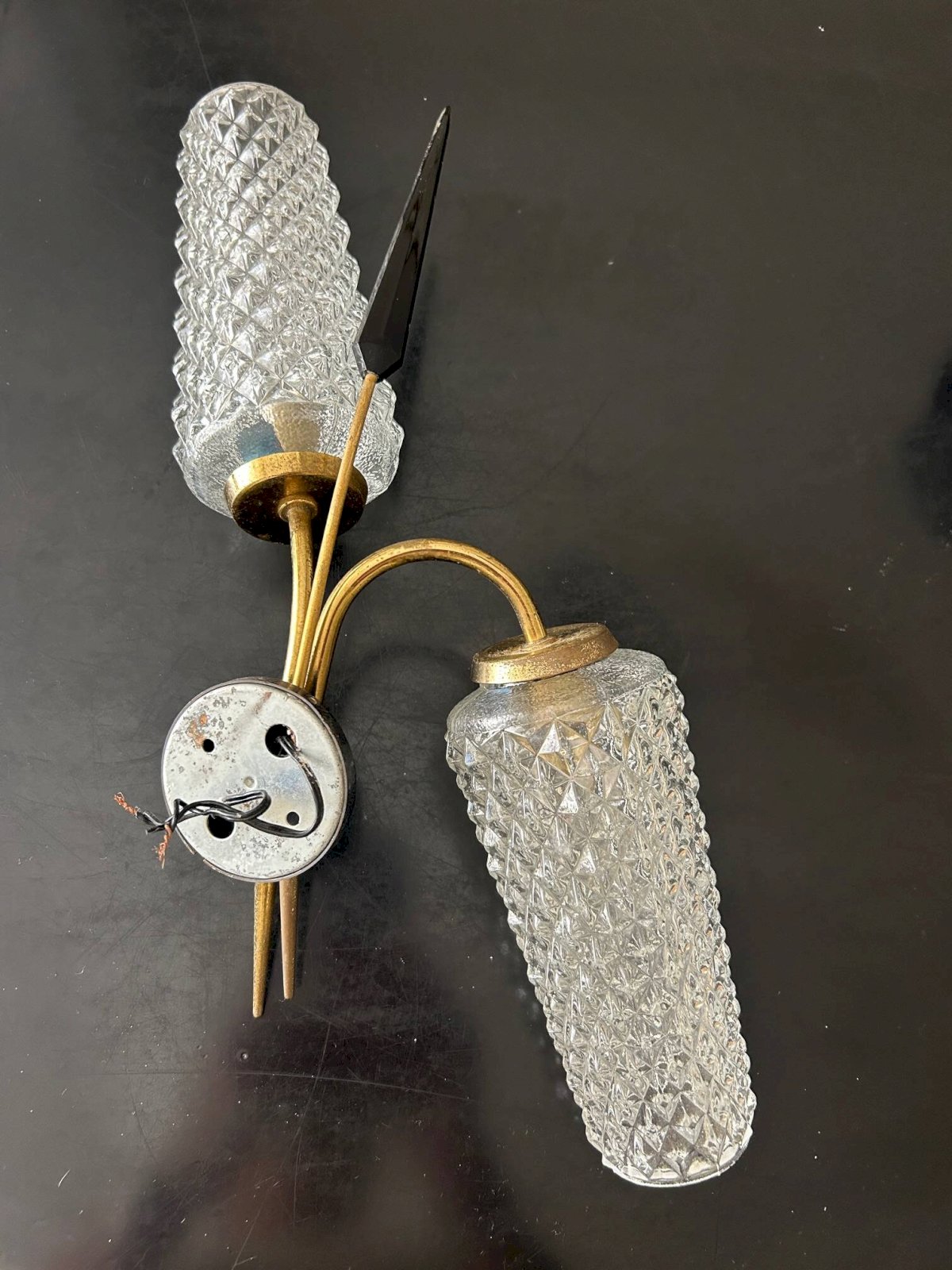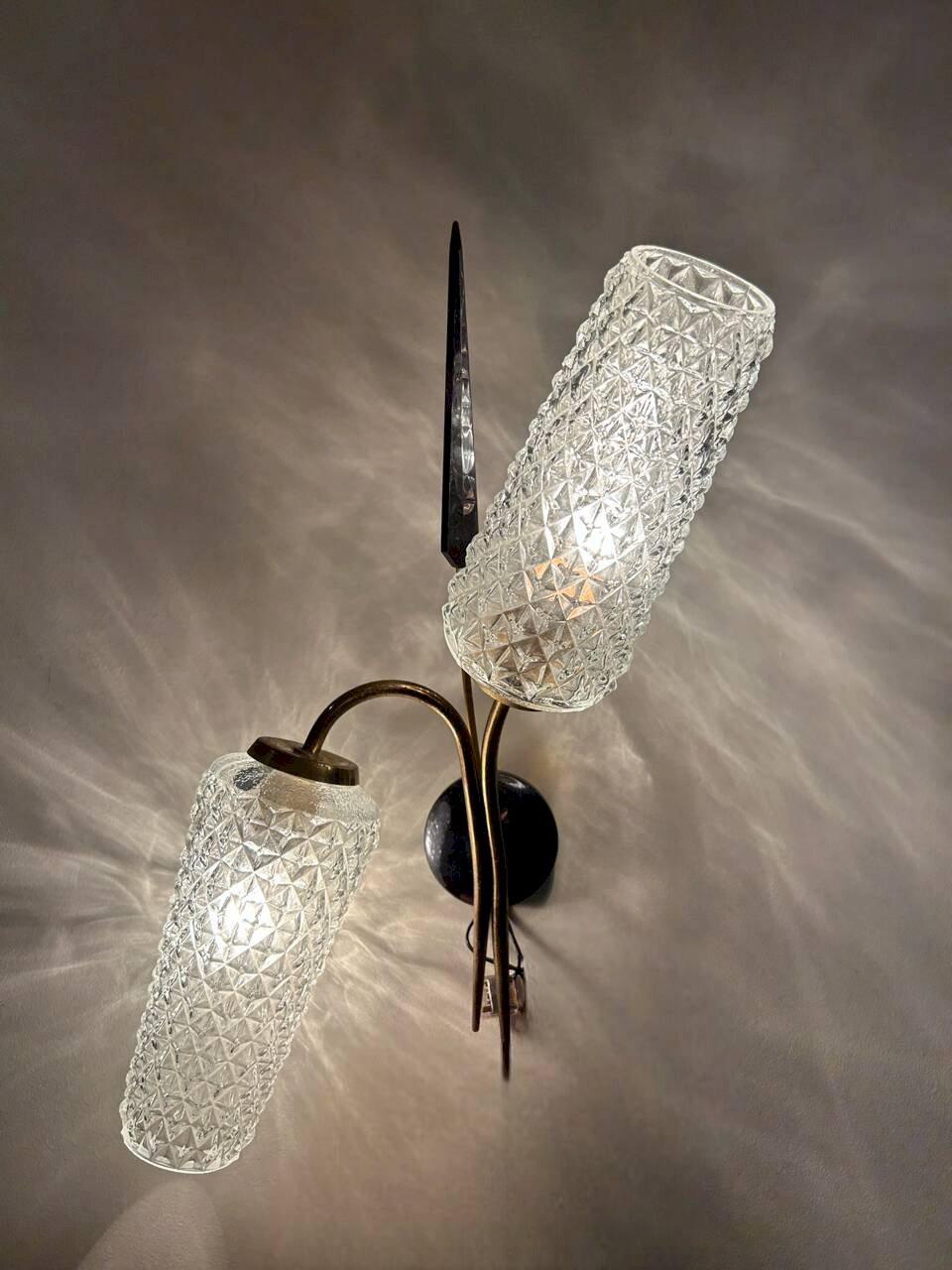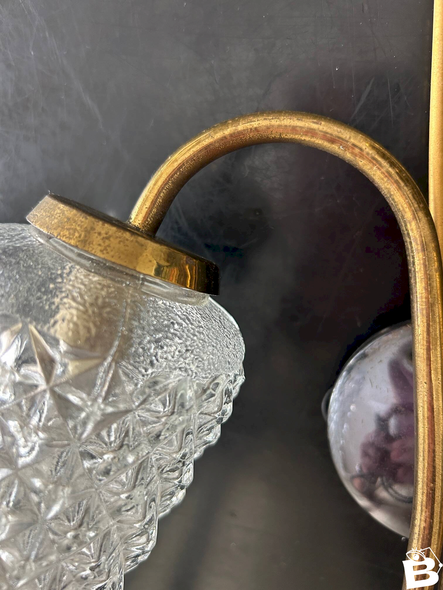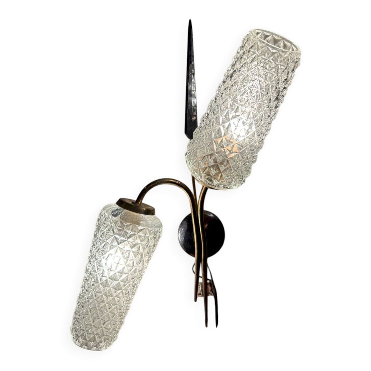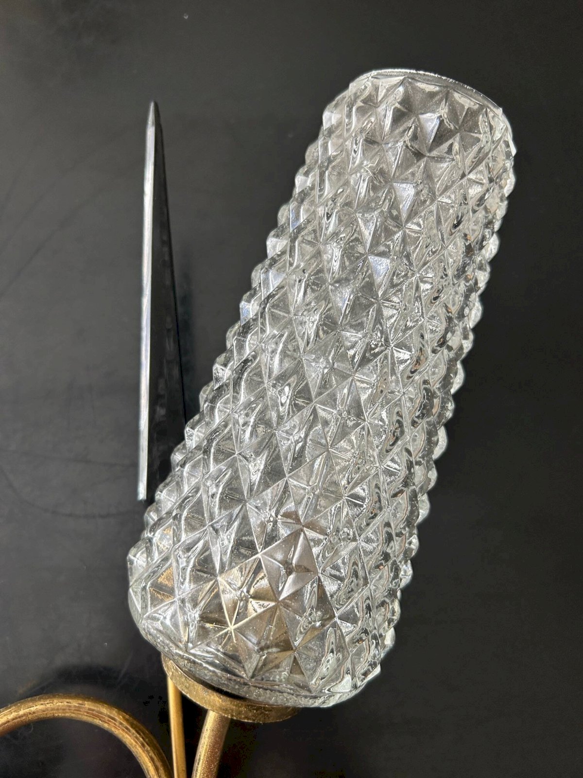 Double-light wall lamp on a brass base with cut glass reflector. L: 25 W: 12 H: 40
