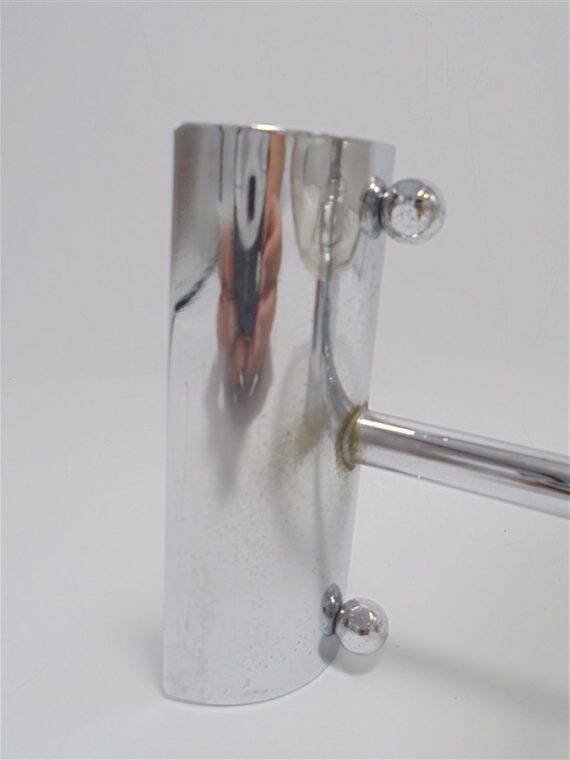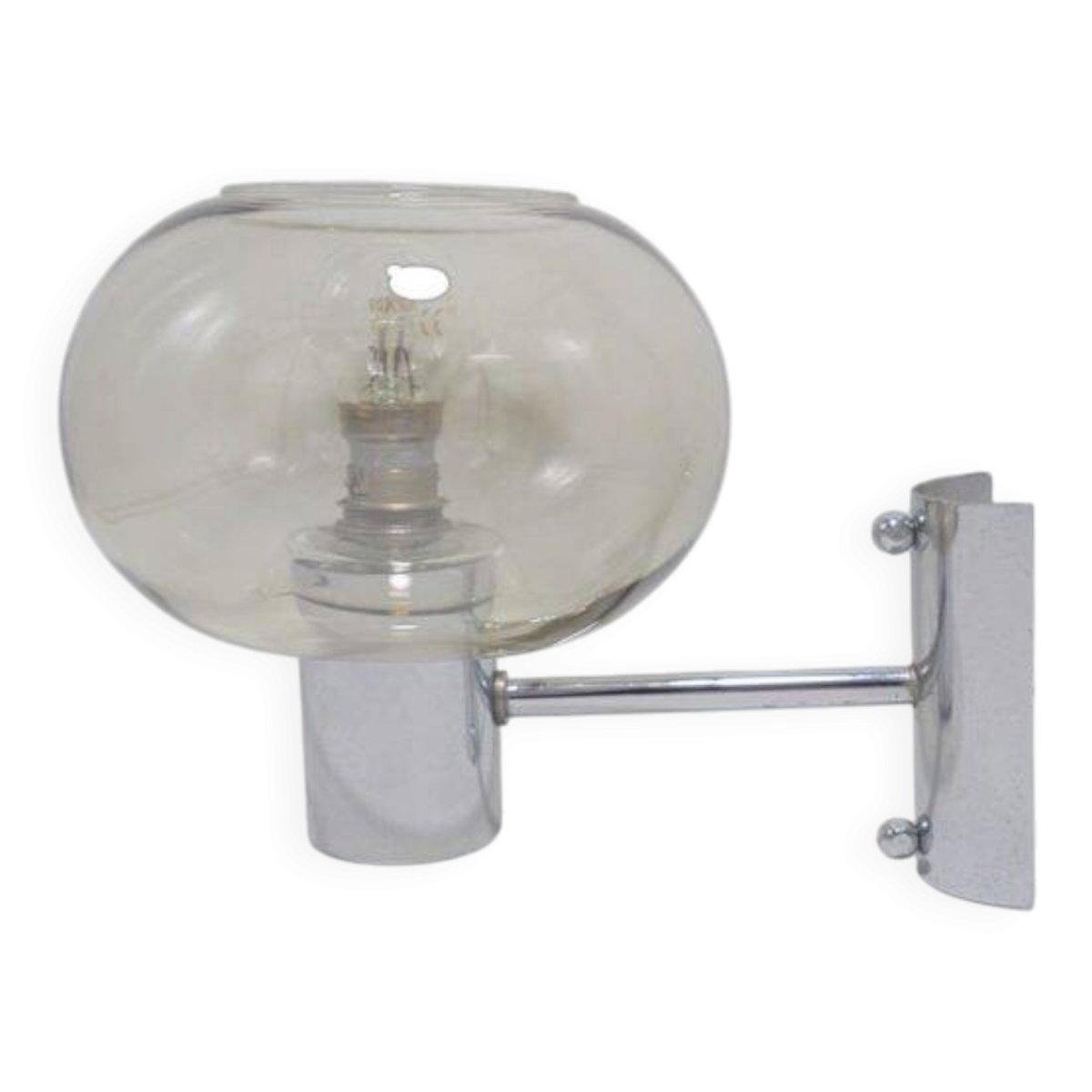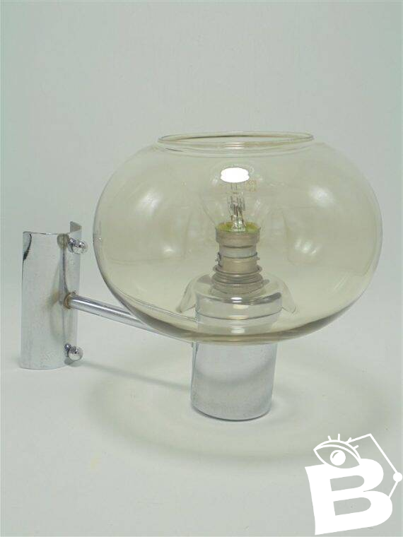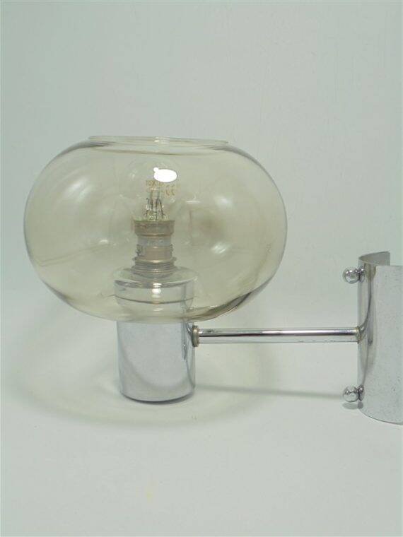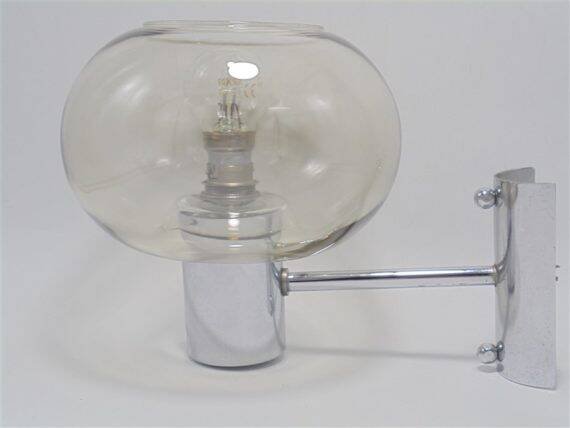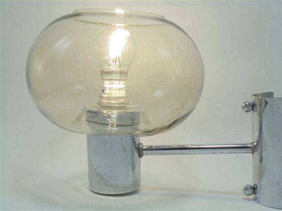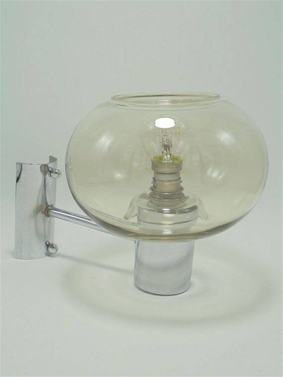 Wall light from Sciolari with a chrome metal structure, featuring slight signs of oxidation, and a smoke glass globe. E27 socket (LED bayonet bulbs are readily available). Dimensions: H16.5 x W17 x D25 cm. Weight: 700 g. L: 17 W: 25 H: 16.5