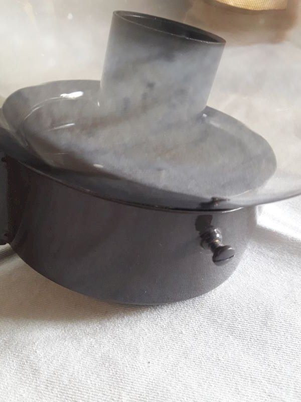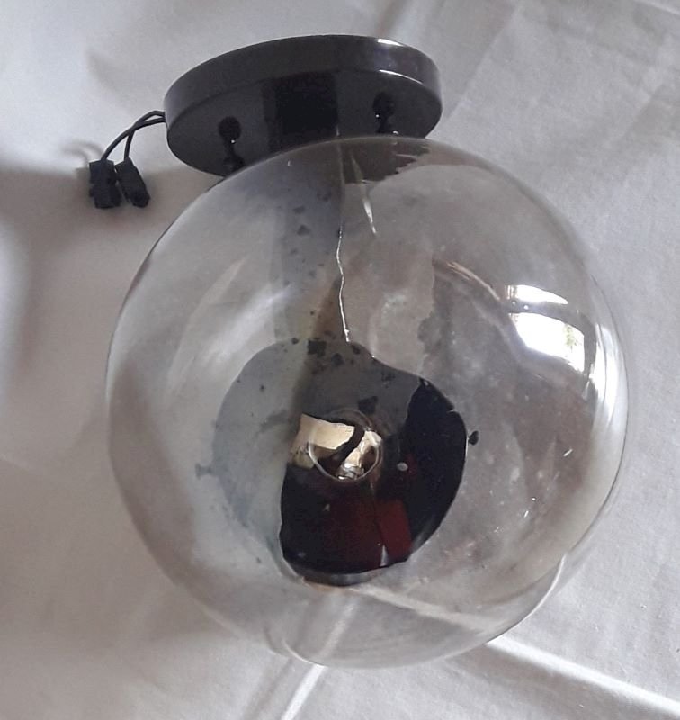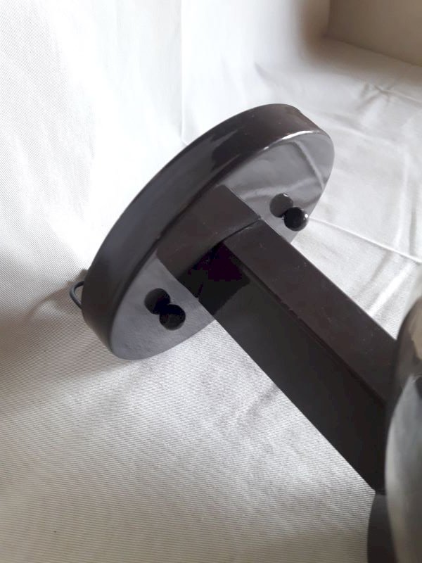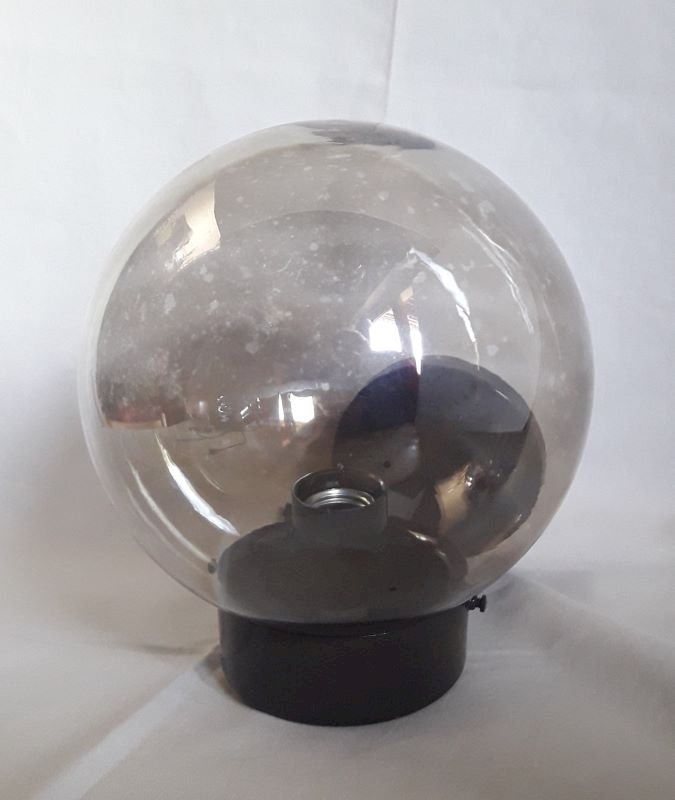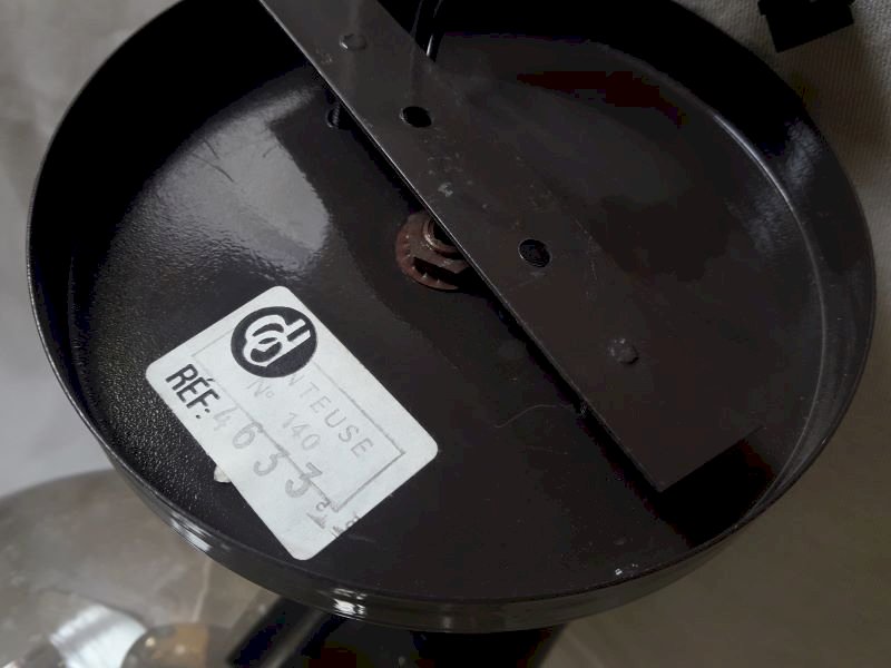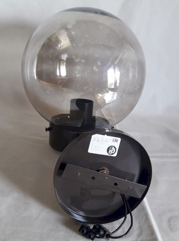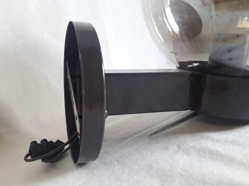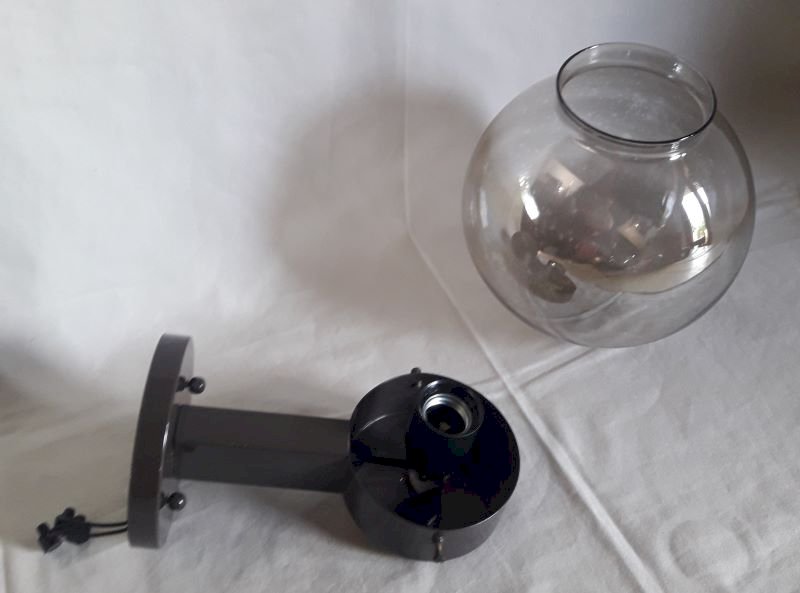 Wall lamp from the 1970s, with its dd mounter label n°140 Ref: 4633, by Disderot and Delmas. Structure in painted metal (dark brown), glass globe (concentric circles visible on the surface at the end) very lightly smoked with transparent marks. Good condition, some paint missing and light scratches. Complete hanging system, bulb not supplied. The electrical assembly works. Its total height once fixed is approximately 28cm, maximum depth approximately 27cm, and its width: 18.5cm (diameter of the globe). Weight: 1,140kg.