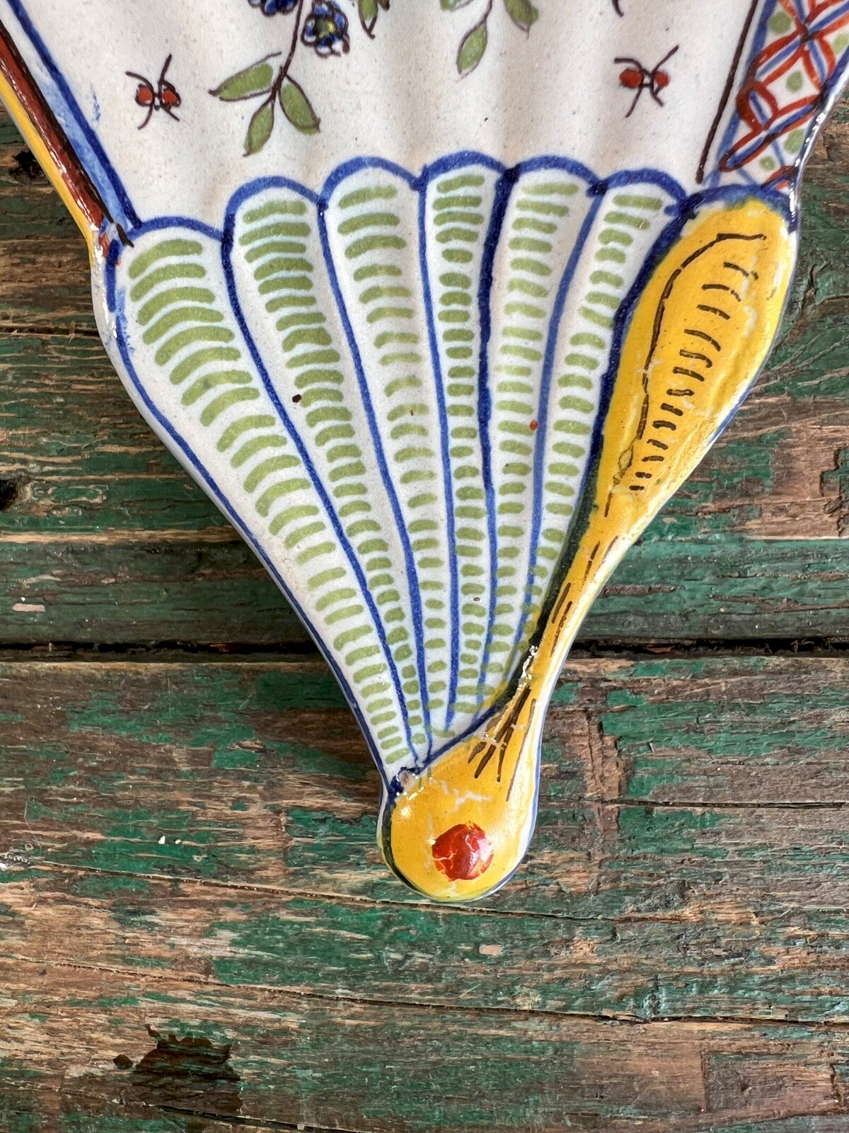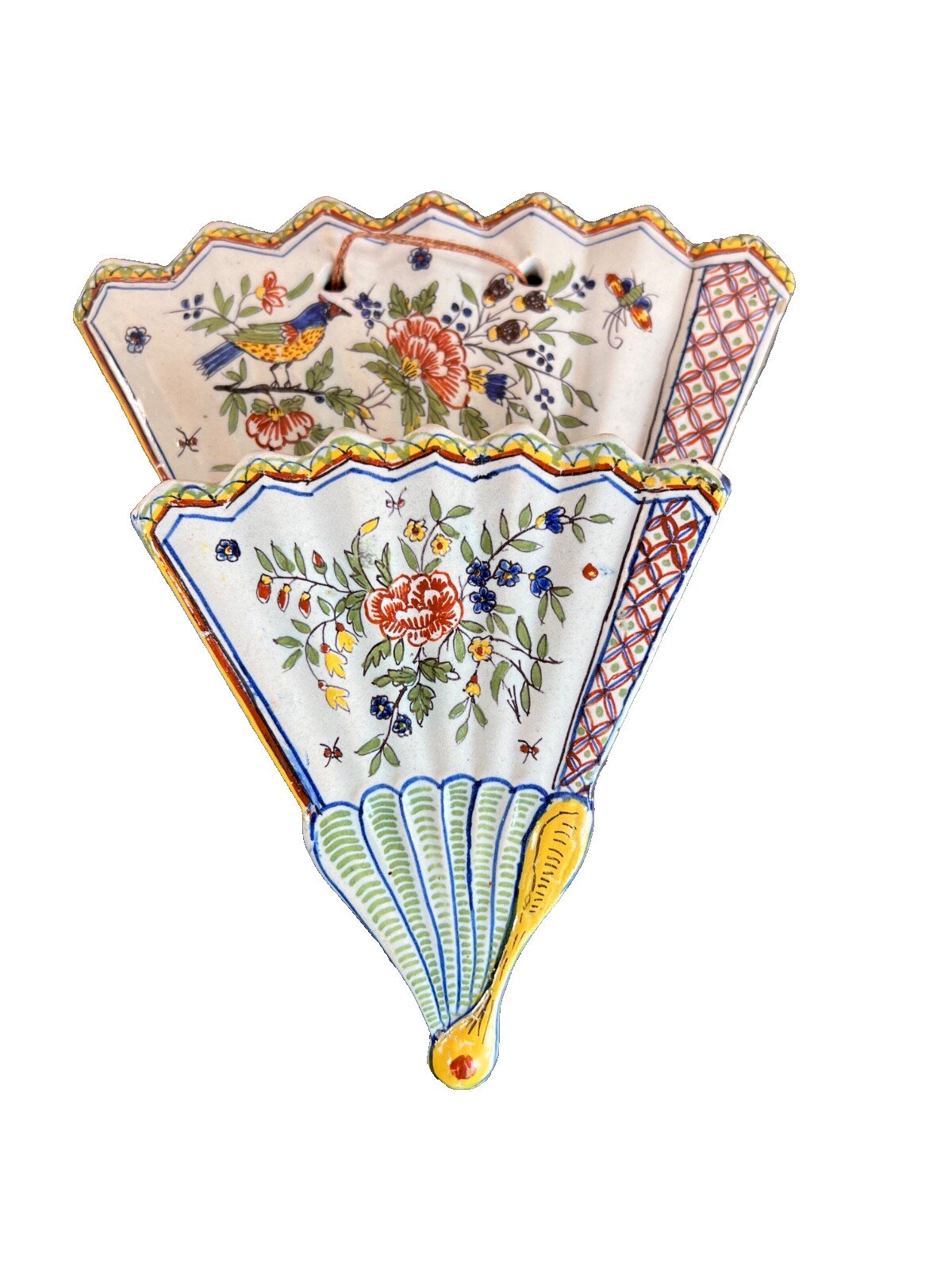 Stunning wall bouquet holder in the shape of a fan – Polychrome earthenware hand-decorated – France, 20th century Charming wall bouquet holder made of glazed earthenware, in an original fan shape, entirely hand-painted. Its polychrome decoration features a bird perched at the center of a rich bouquet of flowers and foliage, highlighted by colorful geometric patterns. This piece is typical of French artisanal productions from the second half of the 20th century, in the spirit of the pottery works of Samadet or Desvres. The back is signed under blue enamel. Two original perforations allow for easy hanging (cord included). Dimensions: Height: 24 cm – Width: 21 cm – Depth: 6 cm (9.4 in x 8.3 in x 2.4 in) Condition: Excellent overall condition, with no chips or cracks. Shiny enamel, intact decoration. A piece full of poetry, ideal for wall decoration in a kitchen, living room, or veranda.