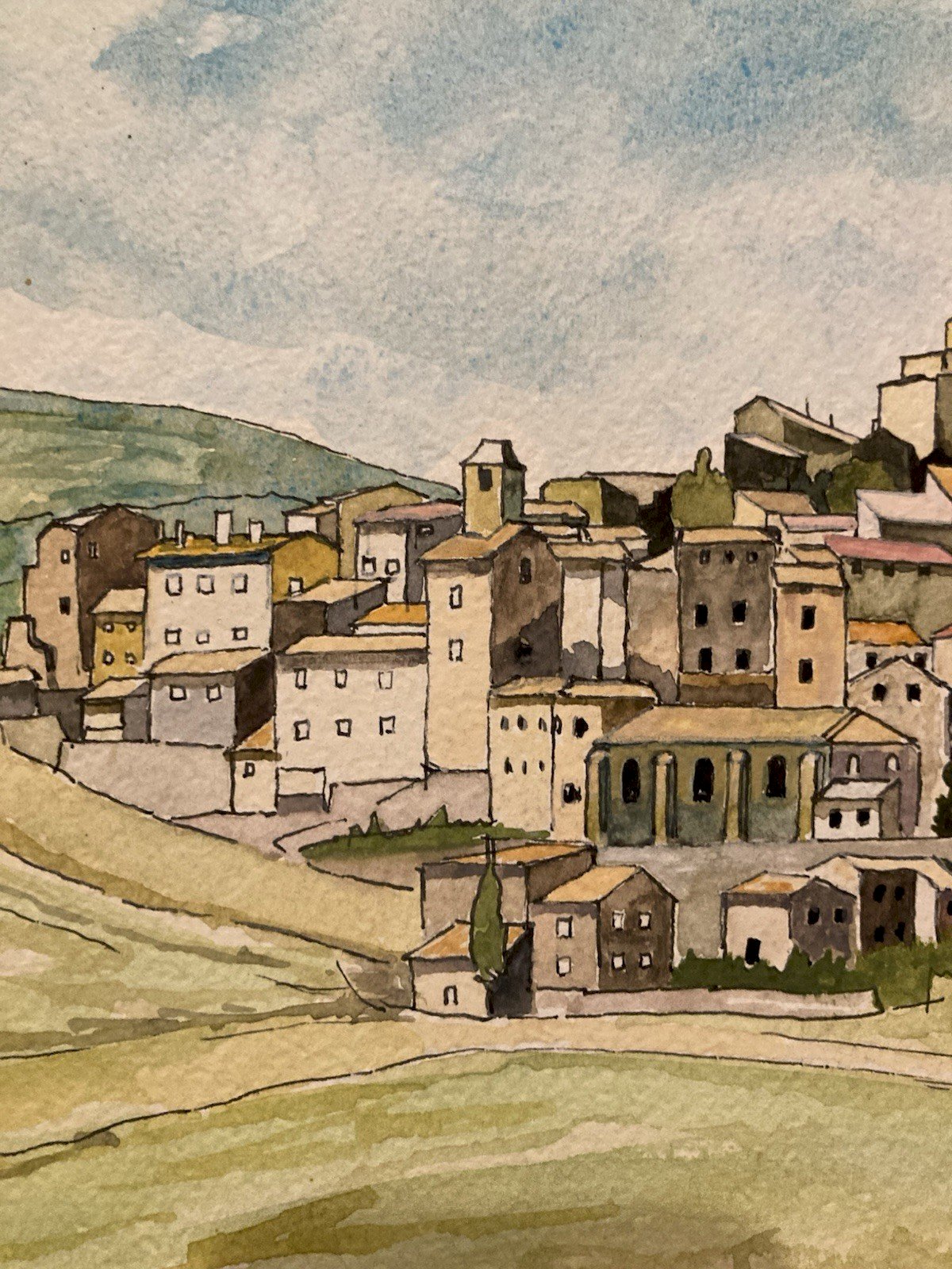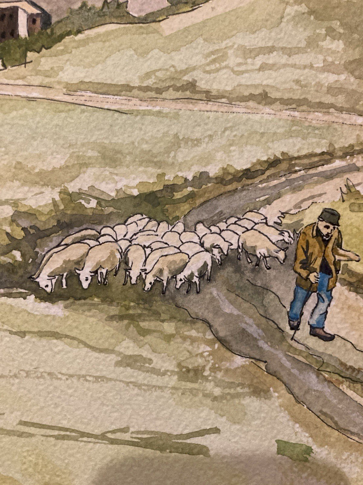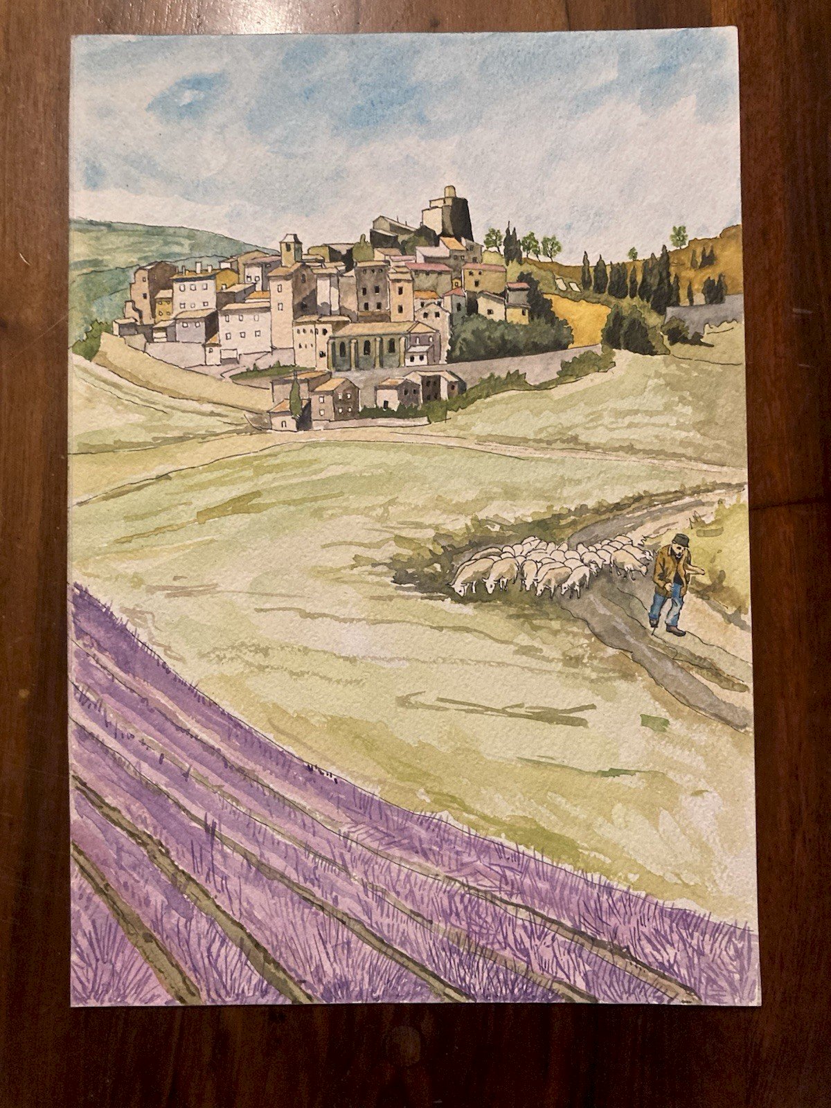 Watercolor Drawing Landscape Painting 1980 Lavender Provence Shepherd Sheep
