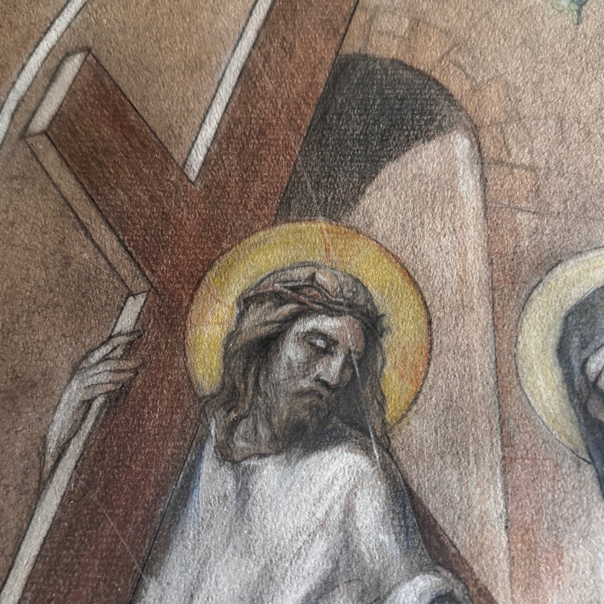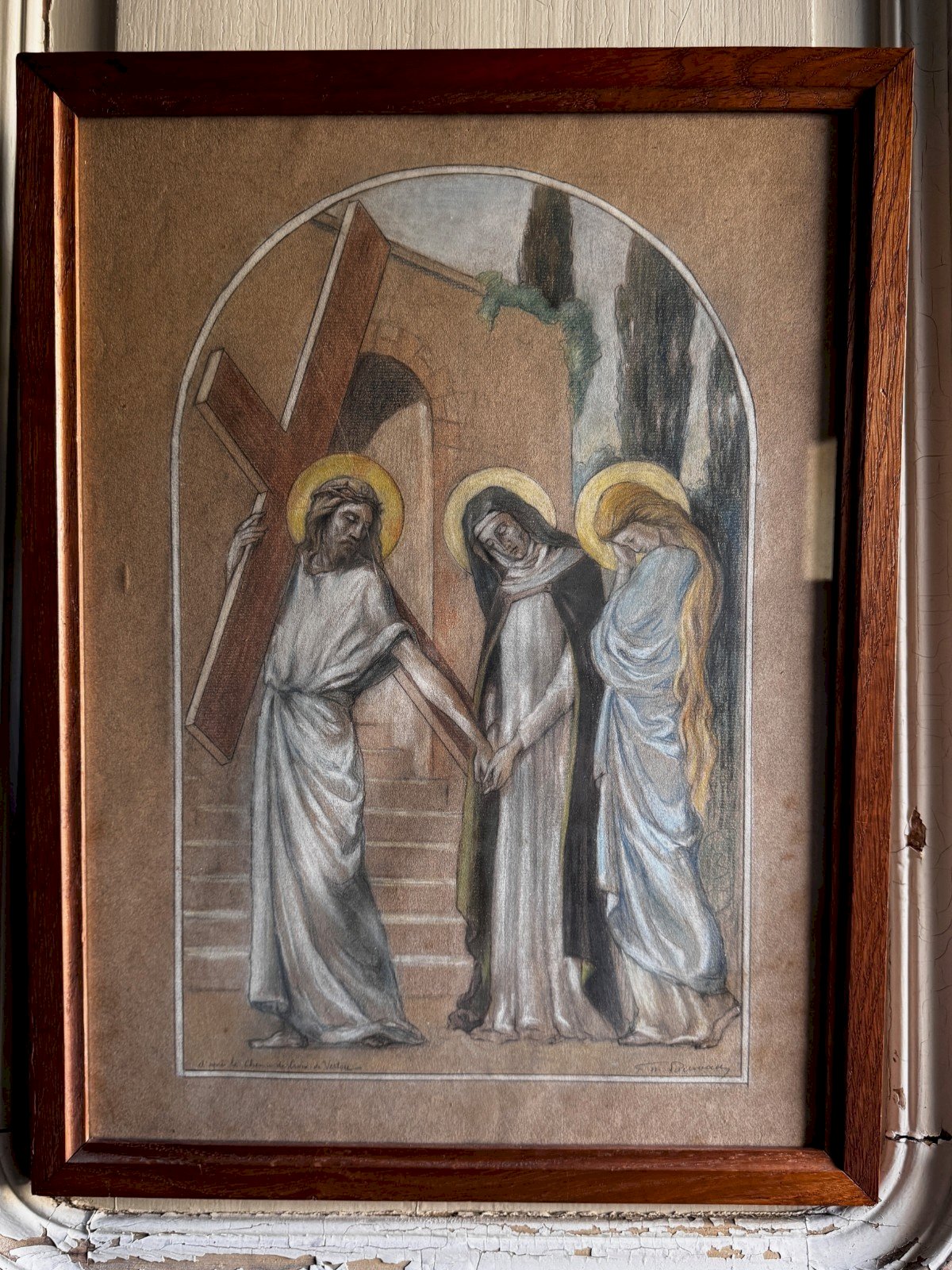 Watercolor on paper, early 20th century, depicting a station of Christ based on the Stations of the Cross by Vertoux A5748. This watercolor on paper is from the early 20th century. We have been unable to identify the artist. The frame is original. Please note that the glass is scratched, and there are small spots in places on the watercolor; the artwork is slightly wavy in some areas. Our photos allow you to appreciate the quality of the work. For the condition, please refer to the detailed photos. Feel free to zoom in. The photos are an integral part of the description. Dimensions: - Frame Height: 51.3 cm Width: 39 cm Depth: 1.5 cm - Artwork Height: 46.3 cm Width: 34 cm P: 1616915 I remain at your disposal for any questions. Country of origin: France Authenticity: Unknown Weight: Unknown Type: Watercolor Height: 51.3 cm Style: Unspecified Genre: Unknown Length: cm Features: Framed, Signed Width: 39 cm Theme: Religion, Mythology