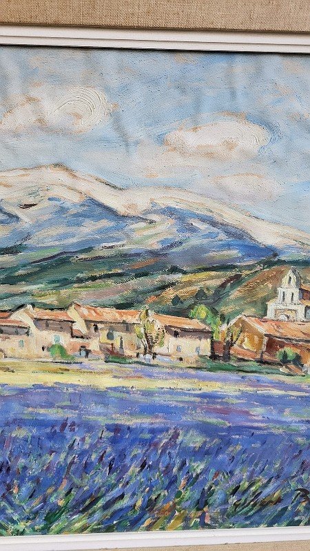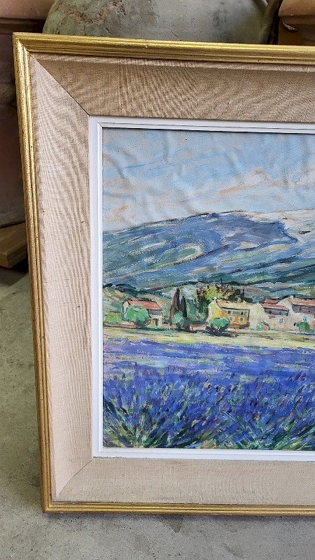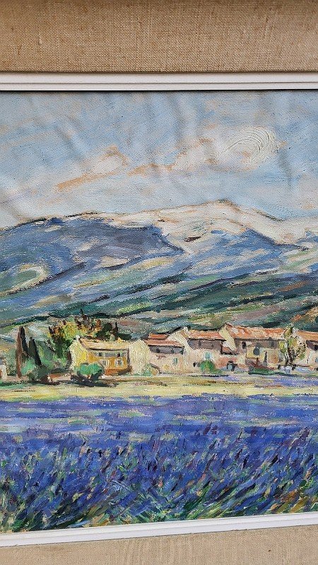 superb watercolor painting of a lavender field by Gilbert Blanc; it is a watercolor on paper glued to plywood. It is in good condition, with only the paper not being well adhered, causing some bubbles. The frame is original and in very good condition. The frame measures 81 cm wide by 65 cm high, while the painting measures 64 cm wide by 48 cm high. Type: Watercolor Country of origin: Metropolitan France Features: Framed, Signed Theme: Landscape