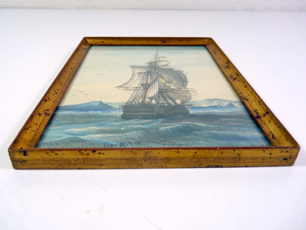 Watercolor WORLD TOUR THE FRIGATE LA NOVARA IN FRONT OF SAINT PAUL ISLAND signed SIRON 1873. The Austrian frigate La Novara is the last ship to have made a scientific voyage around the world. Very good general condition, see photos. Watercolor dimensions: 20 x 15 cm, Frame drawing: 21.5 x 16.5 cm. Type: Watercolor Artistic movement: Austrian School Height: 21.5 cm Genre: Realism Features: Framed, Signed Theme: Marine landscape, Boat