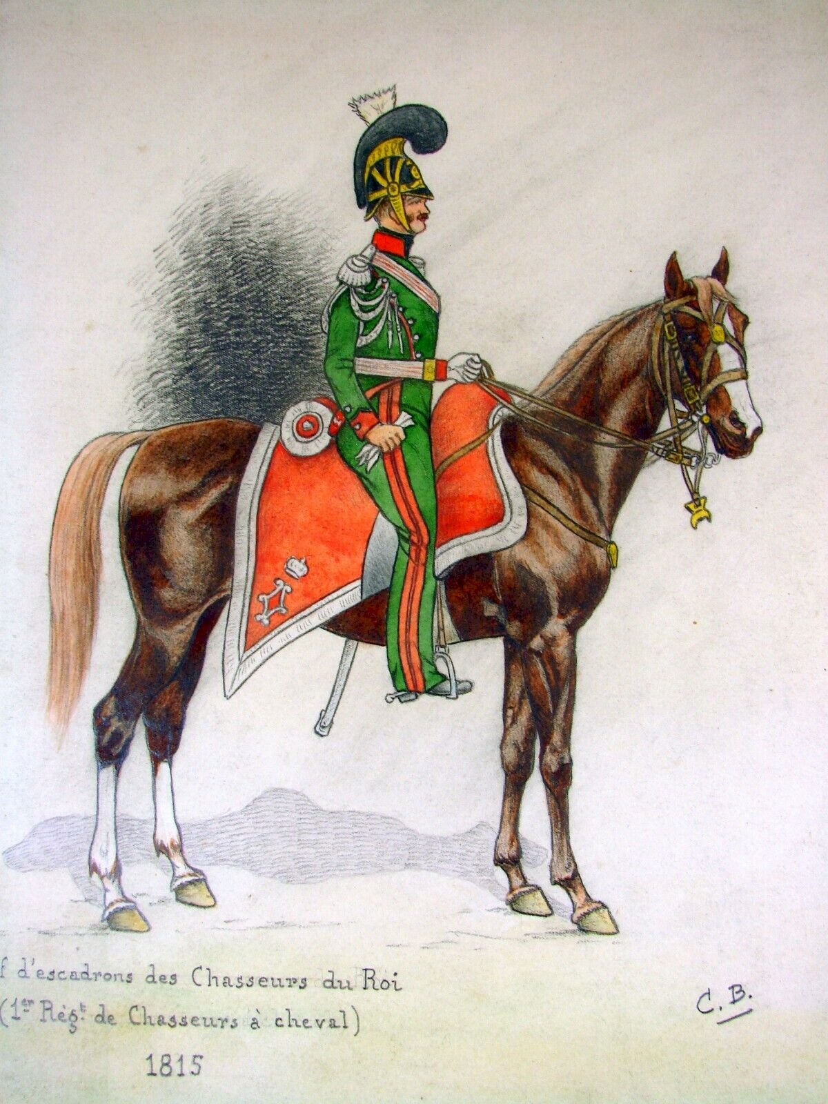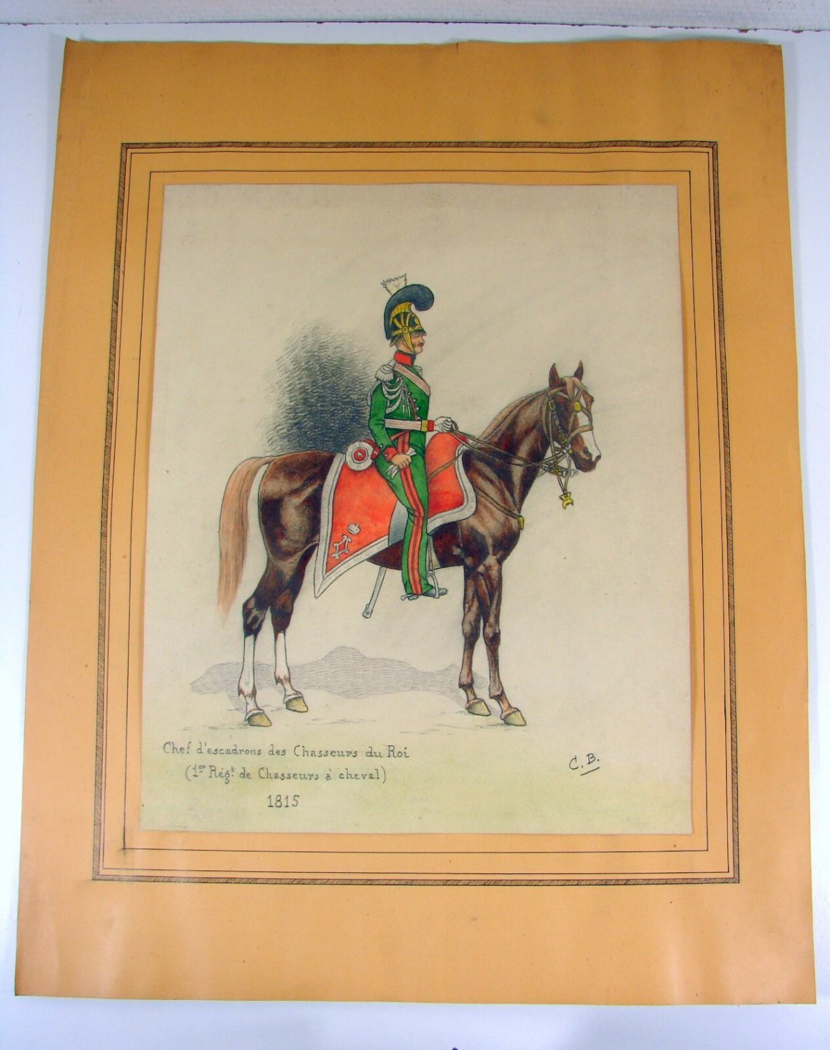 Watercolored Drawing on Paper Support Napoleonic Army Soldier, Signed with Monogram C.B., Charles Louis Bazin (1802 - 1859). Very good overall condition, small tears on the paper support, top side, see photos. Drawing dimensions: 37 x 30 cm, Support dimensions: 55 x 43 cm.