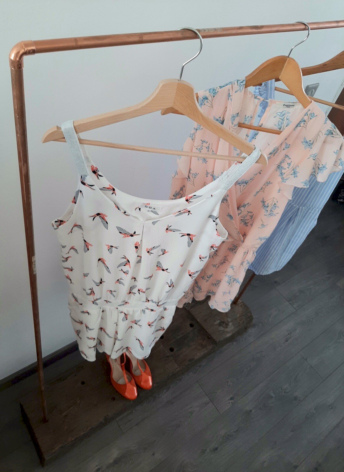 Clothes Rack in Vintage Industrial Style. Condition: "Used" 122x26xh164 Solid wood base and copper structure Delivery possible throughout France (for example 60 euros for Paris and the surrounding area). Dressing, wardrobe, cupboard, unique piece, showcase, store, display, clothes, garments, clothing, children, layout, baby, woman, decorator, interior designer, industrial, loft, designer, retro, modern, design. Condition: Used: Item that has been used. Item showing some superficial wear marks, ...Used: Item that has been used. Item showing some superficial wear marks, fully operational and functioning correctly. It may be a demonstration model or an item returned to the store after a short period of use. any possible imperfections. Type: Clothes Rack