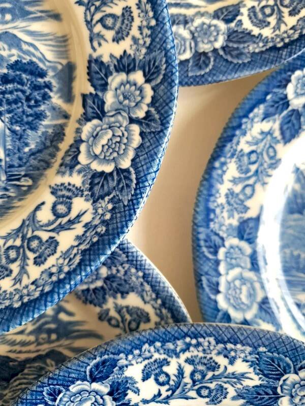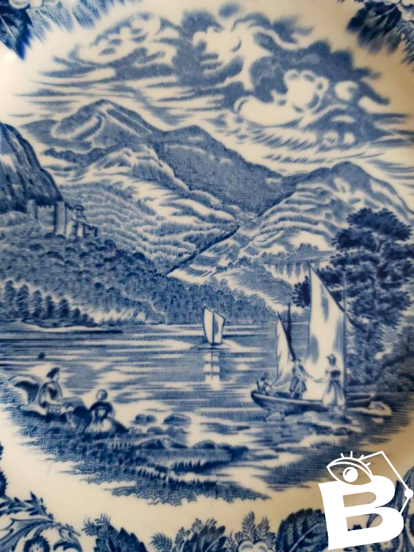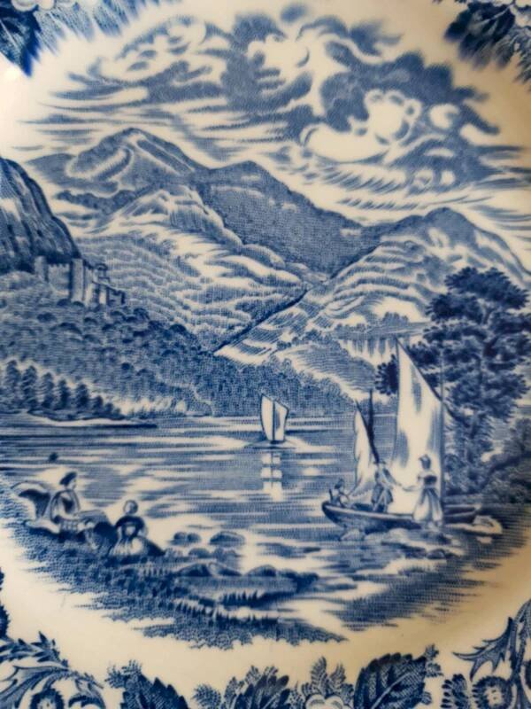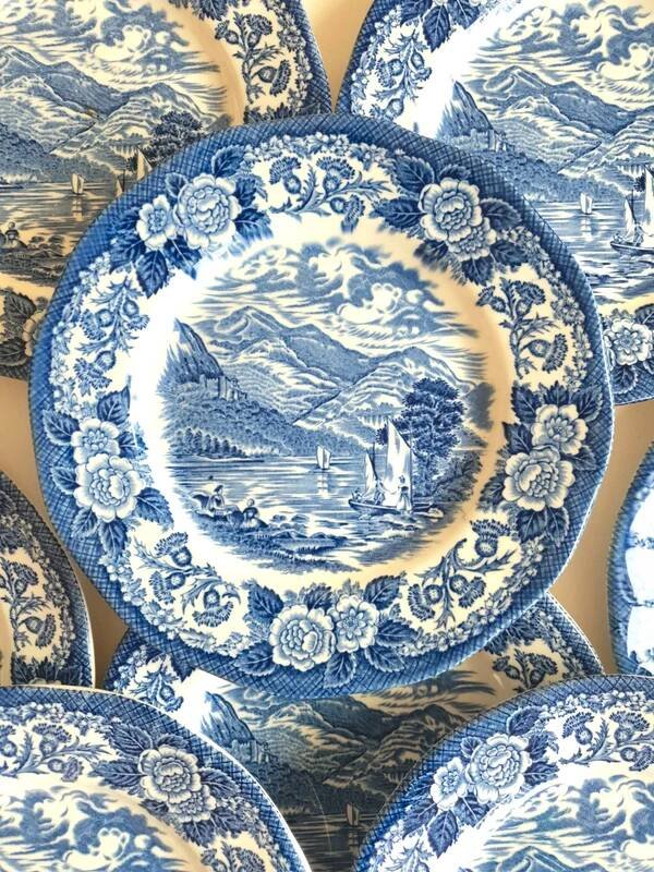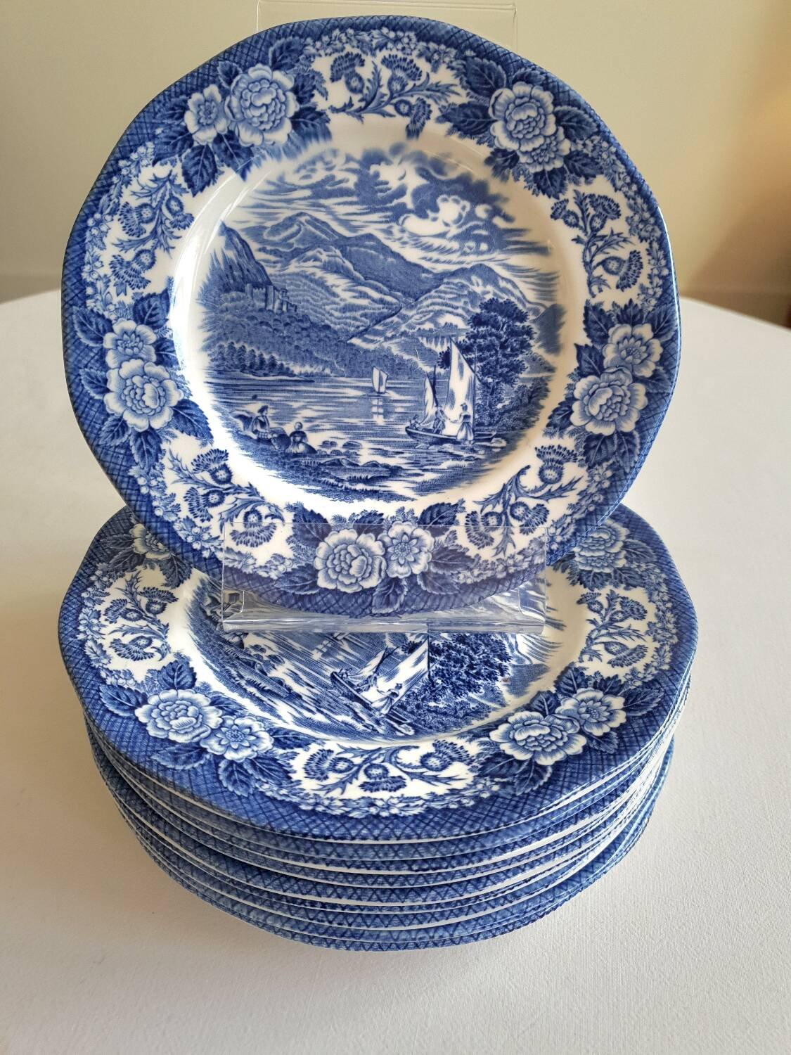 Magnificent set of 10 dessert plates in white and blue English pottery from the 60s/70s. Lochs of Scotland series, Enoch Wedgwood. They are in perfect condition, with a very nice shine, no chips or cracks. Diameter 17.2 cm. L: 18 W: 18 H: 20