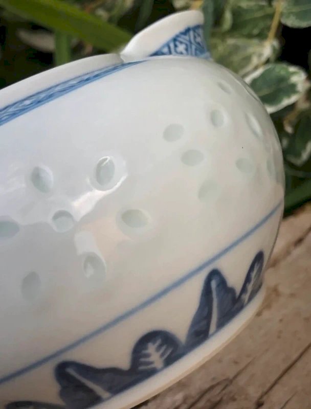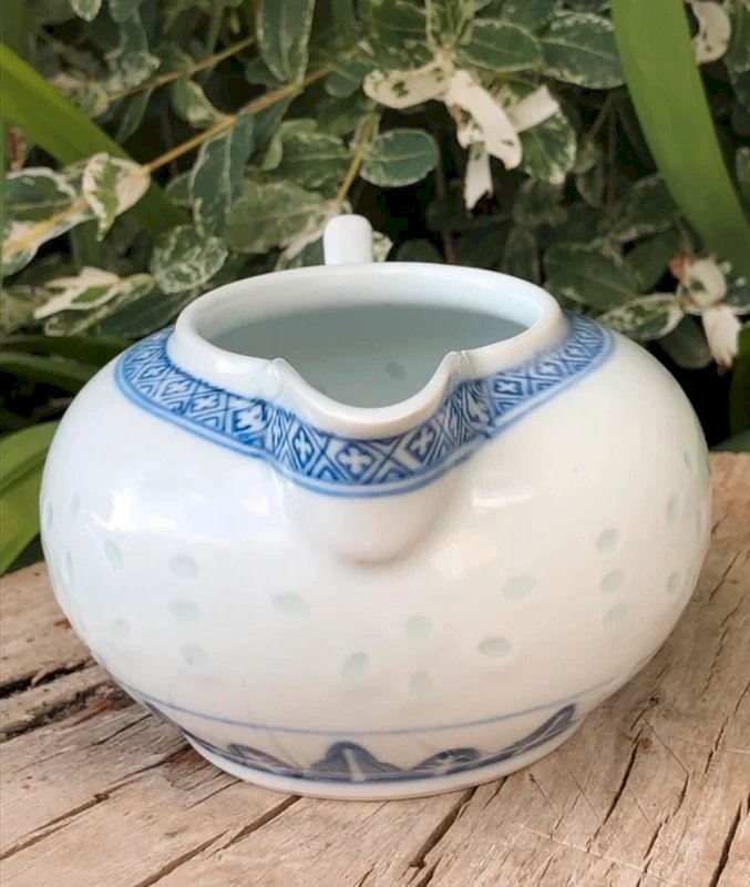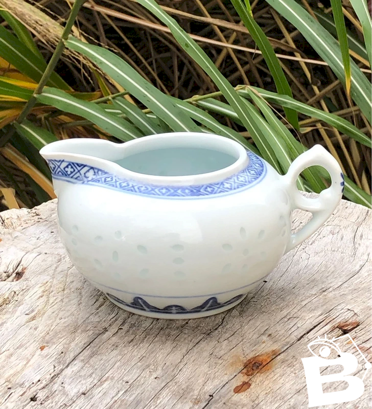 White and blue porcelain creamer in excellent condition Height at spout 7.5 cm