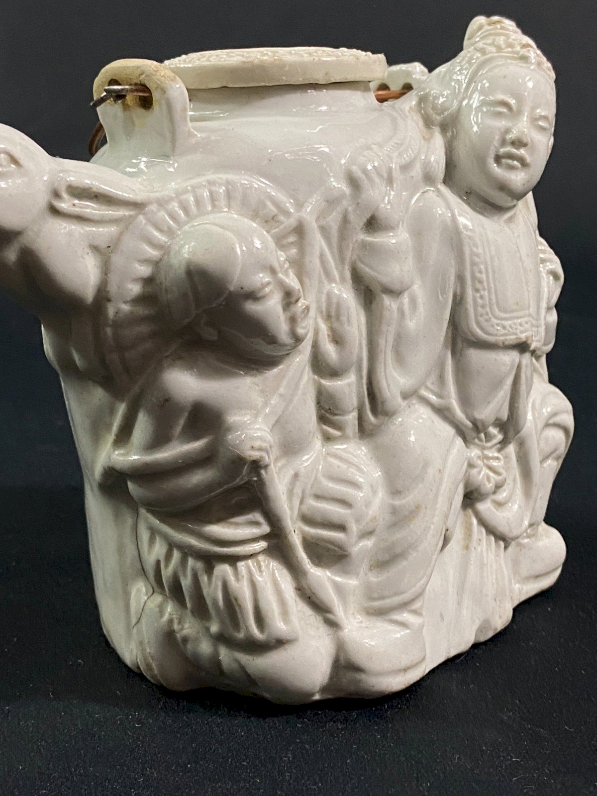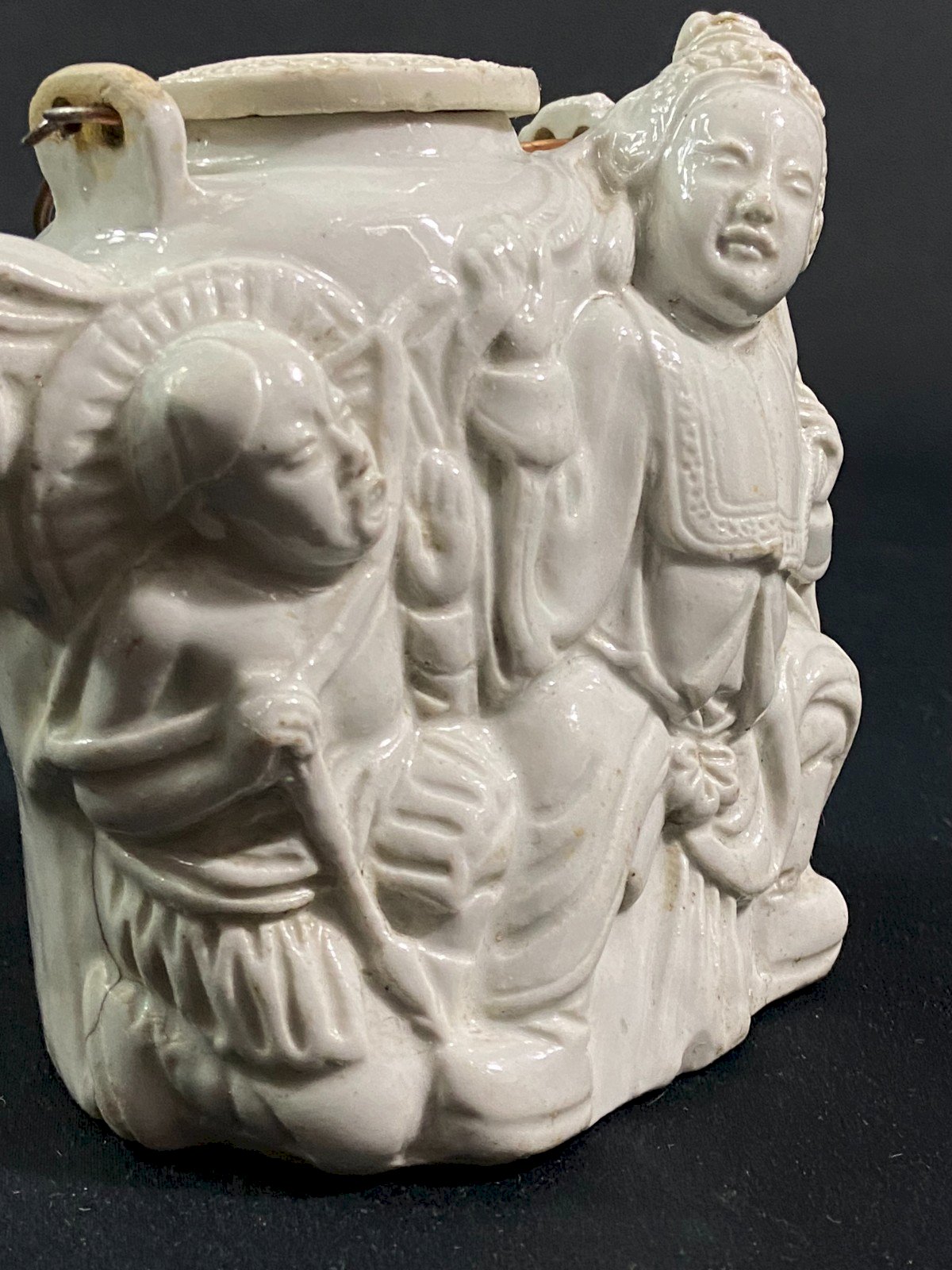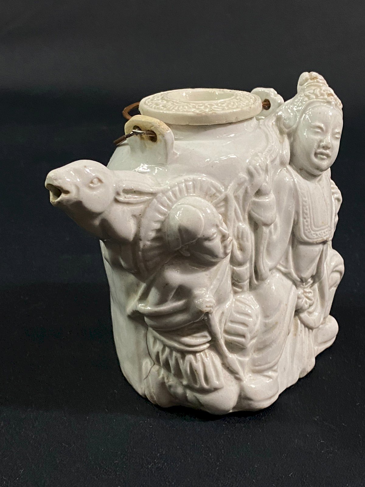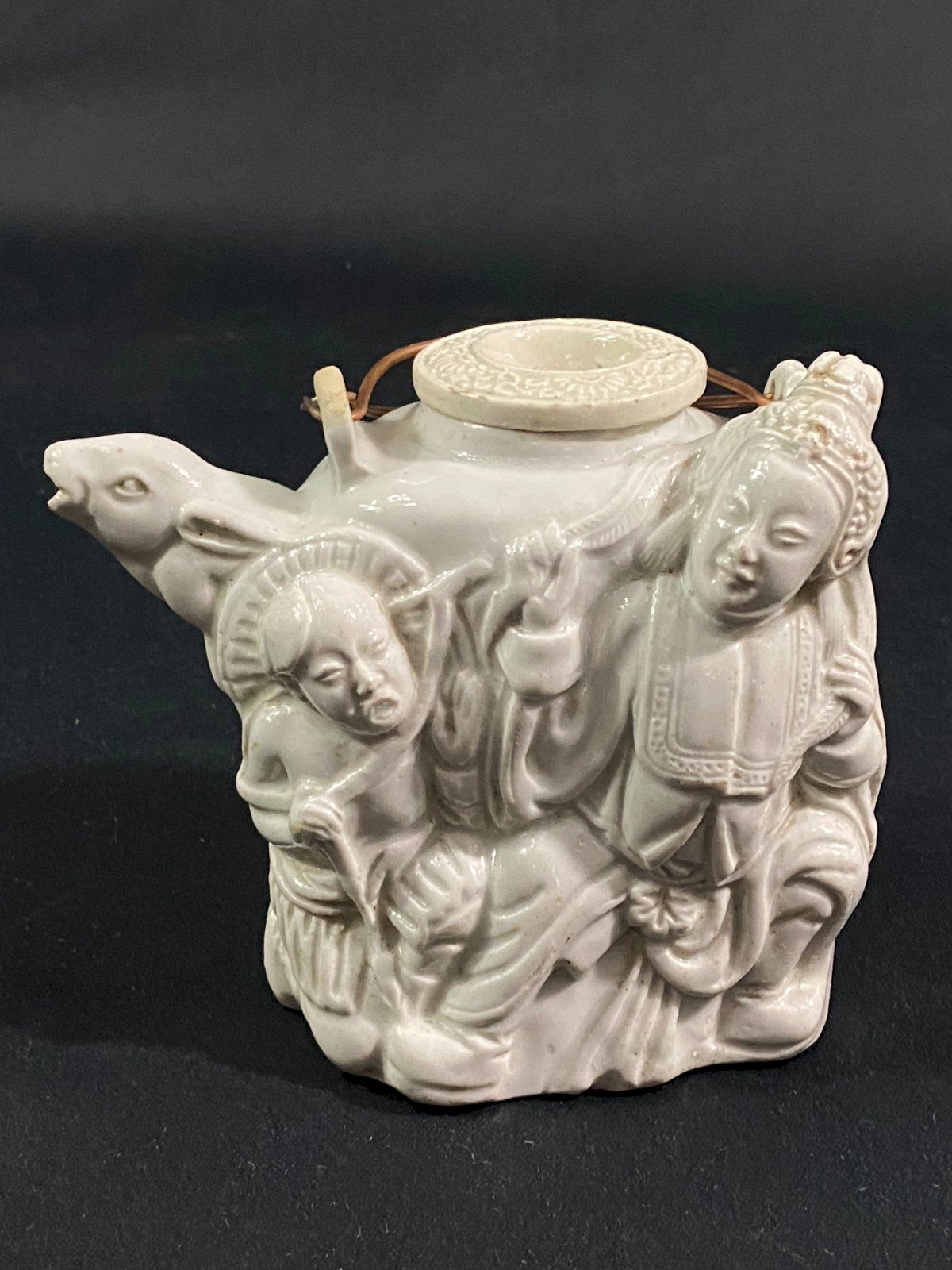 Figurative white porcelain teapot from Dehua, known as "white from China", China 19th century, offered as a ritual gift. Decor of a teaching scene with the sage and the young disciple near a stylized animal forming the spout in the shape of a rabbit. In Chinese iconography, the jade rabbit (Yu Tu) is the lunar animal associated with Chang’e, symbolizing longevity, gentleness, and good fortunes. Lid with a geometric pattern. Maximum dimensions: 13 x 9.2 x Height 11.5 cm. Weight: 324 grams. I note the presence of a restoration at one handle as well as a hairline crack at the base. Very careful shipping worldwide. Materials from: China.