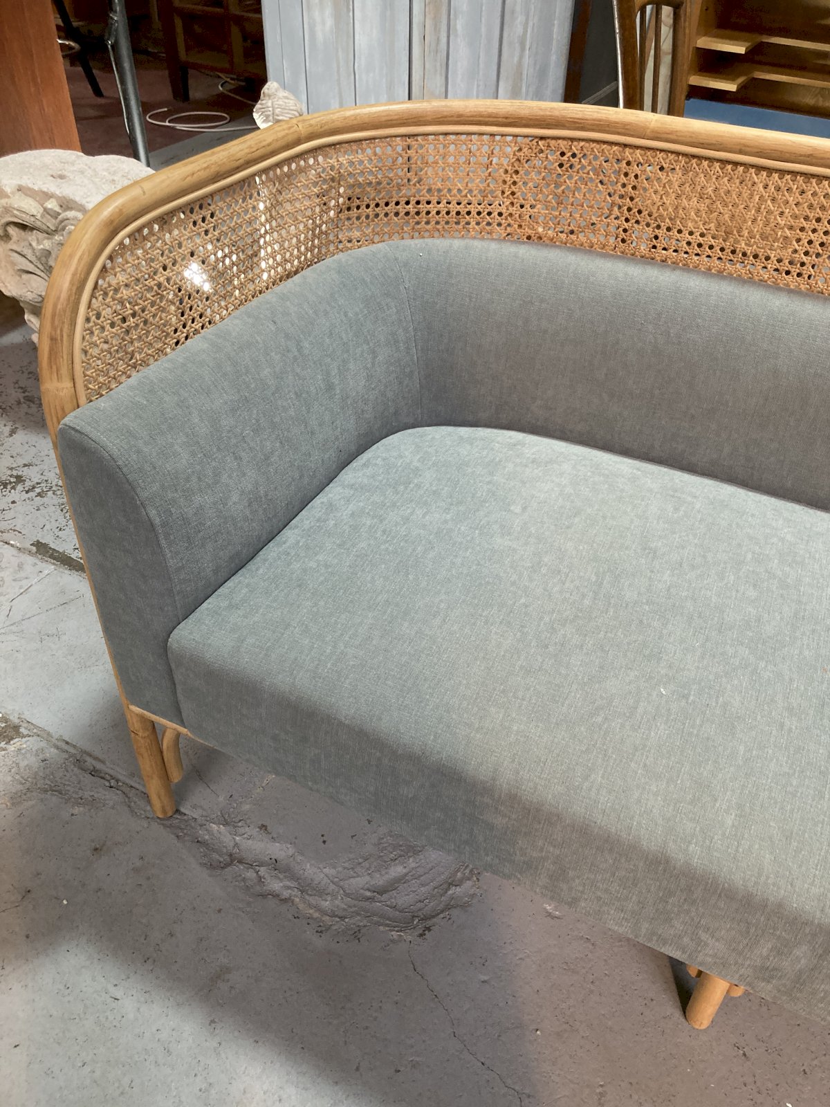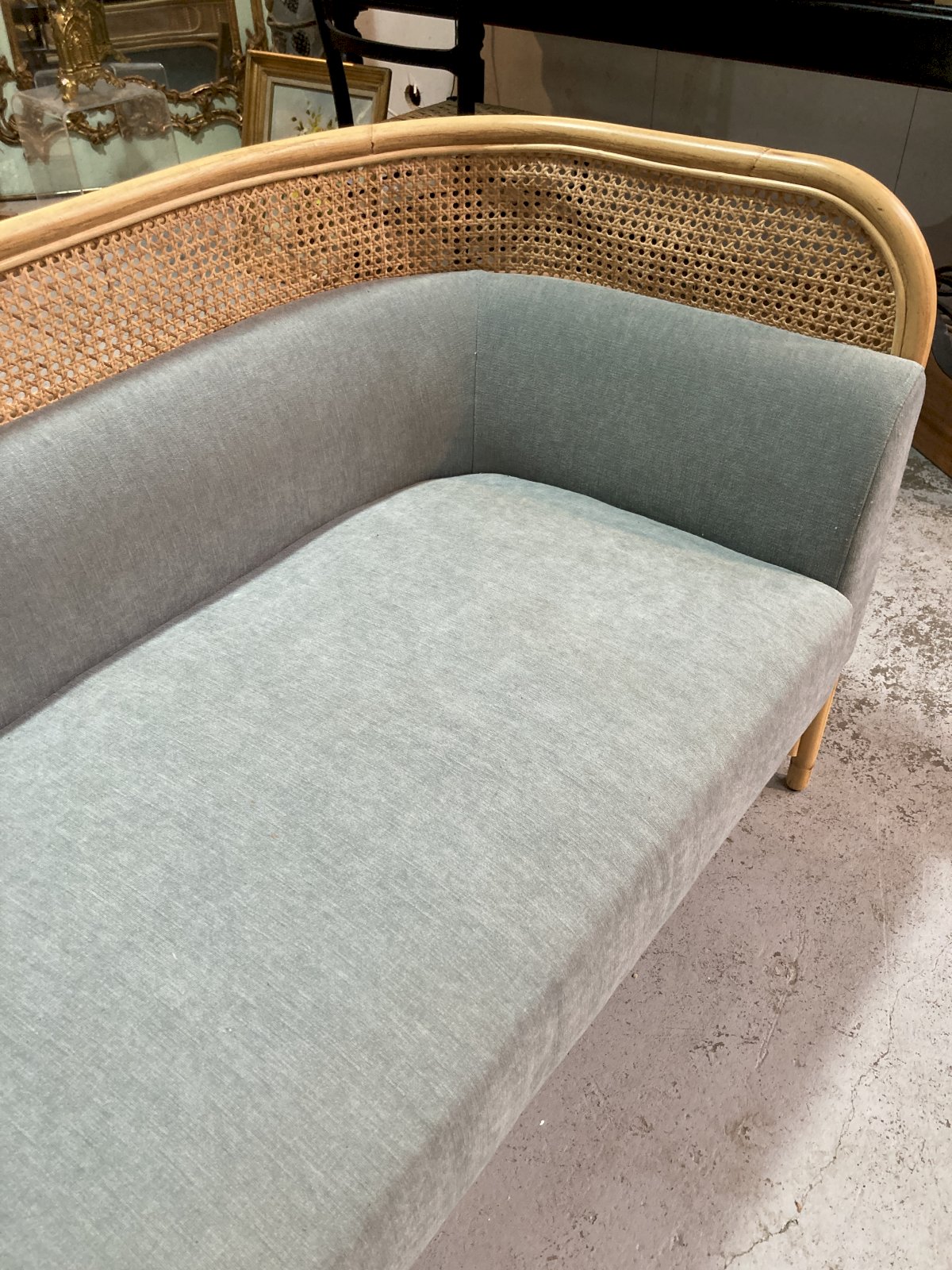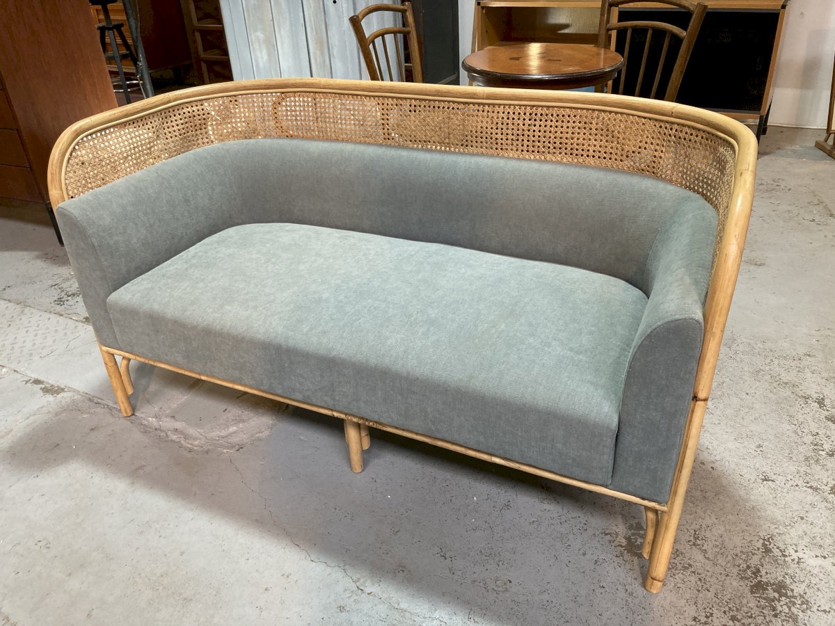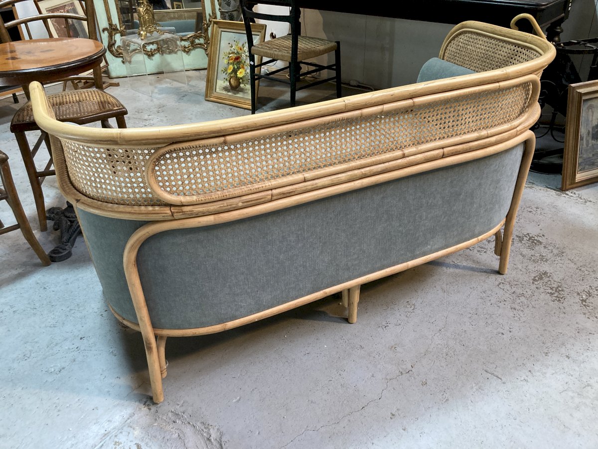 Two-seater sofa, Wiener GTV design, bent beechwood structure supports the large seat cushion and the padded backrest which ends with a border made of Vienna straw where the elliptical element, the plate (targa), is placed, giving its name to the project.