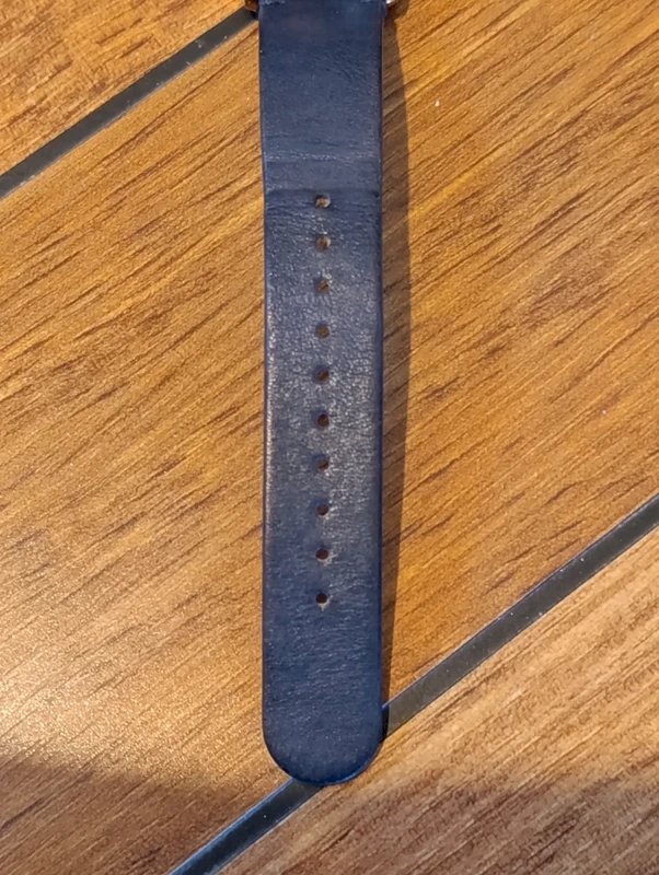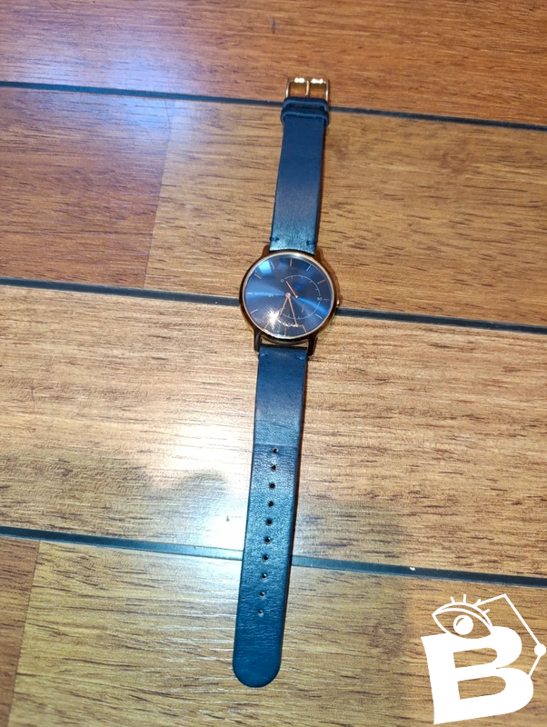 But very low price because two small gold pieces that mark the hours have come off. Can be easily reattached by a watchmaker. New battery. Some normal wear on the strap, see photos. Beautiful watch with its gold frame and navy blue strap.