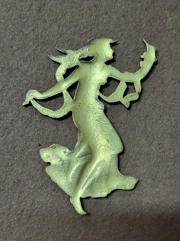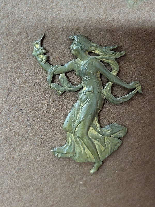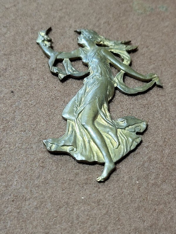 superb Art Nouveau female furniture decoration in brass, it is in very good condition and needs to be fixed only with glue, it is a very beautiful object measuring 6.5 cm high and 5 cm wide. Type: Showcase object, Decorative Period: Art Nouveau Material: Brass Country of origin: France