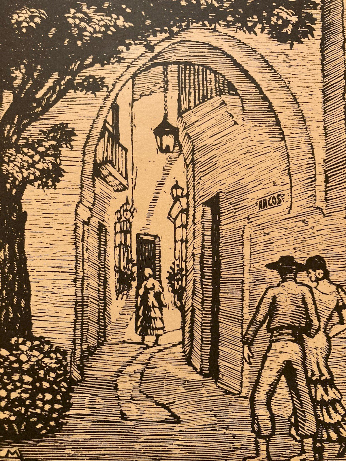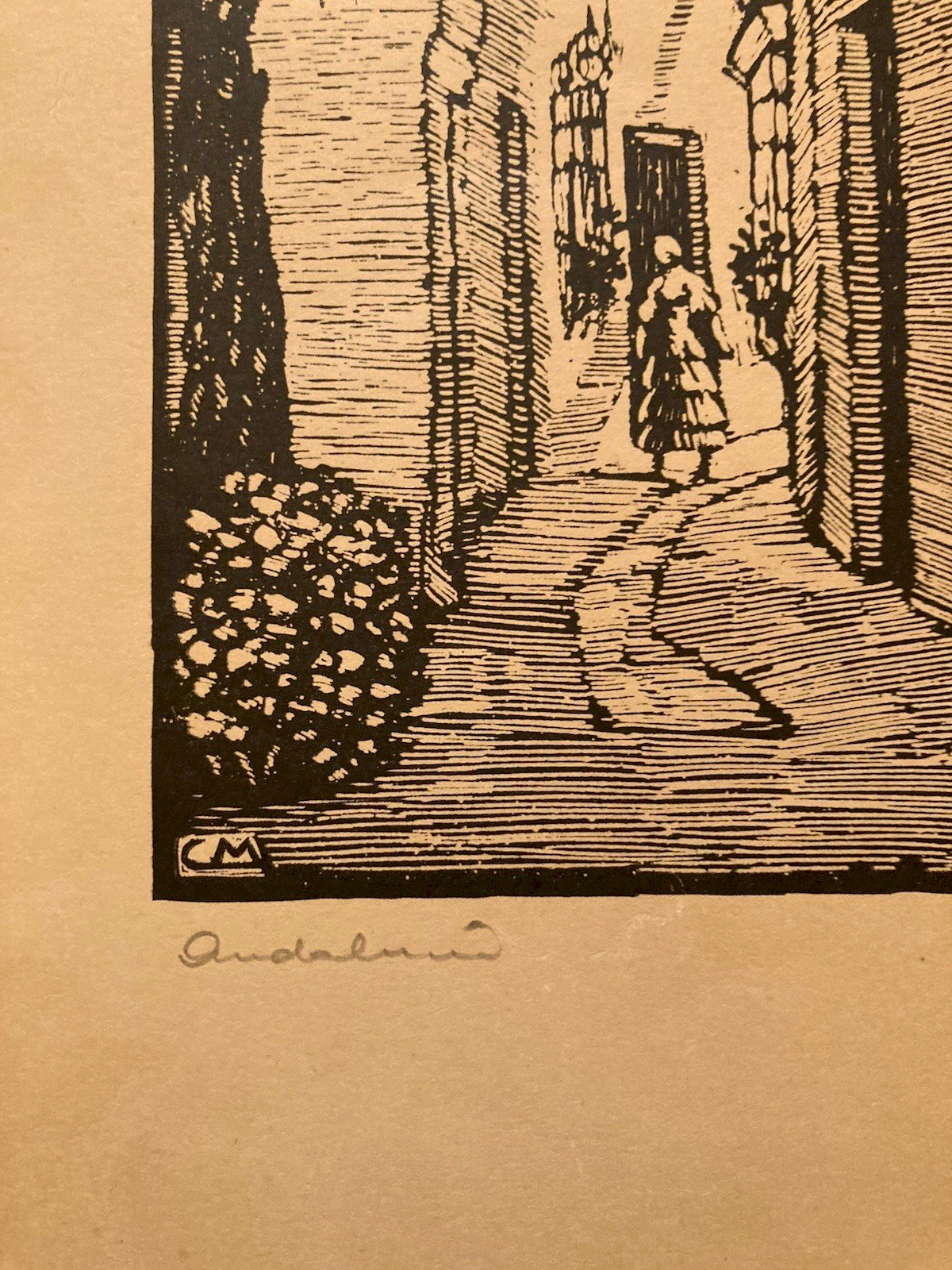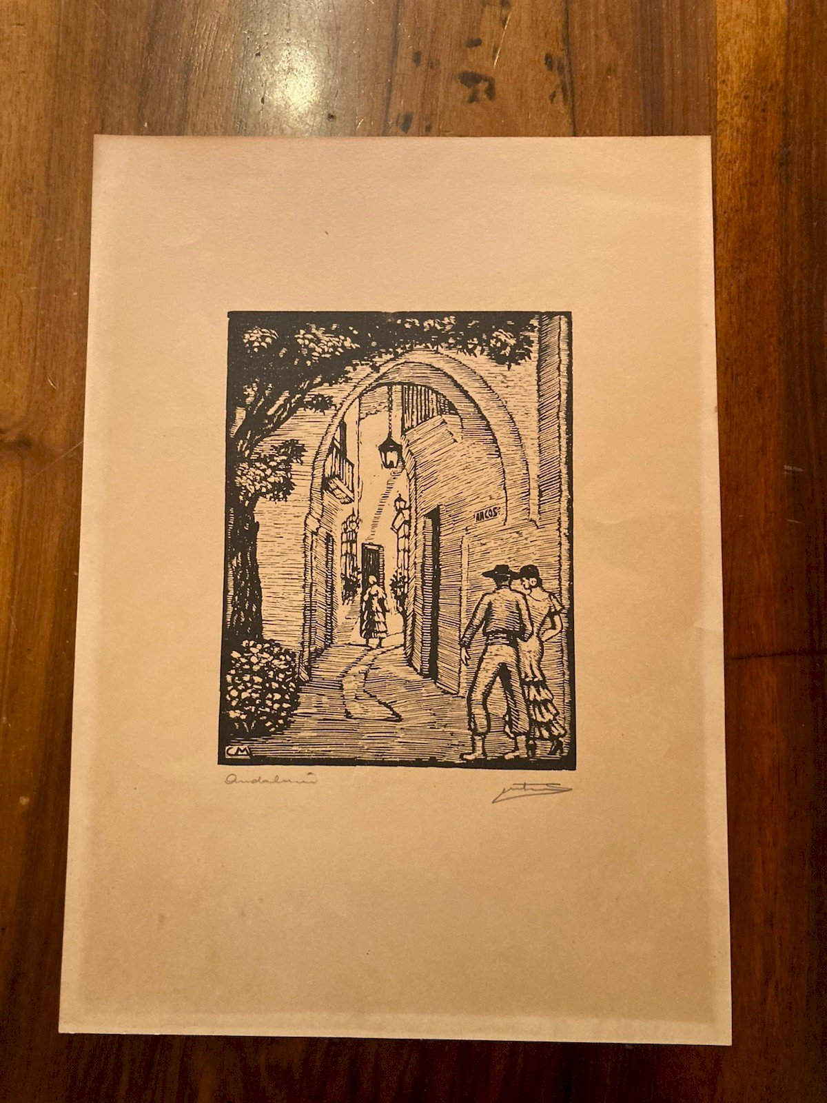 Beautiful Wood Engraving depicting a street in Andalusia, Spain Type: Print Medium: On paper Style: 1940-1960 Theme: Landscape Country of origin: France