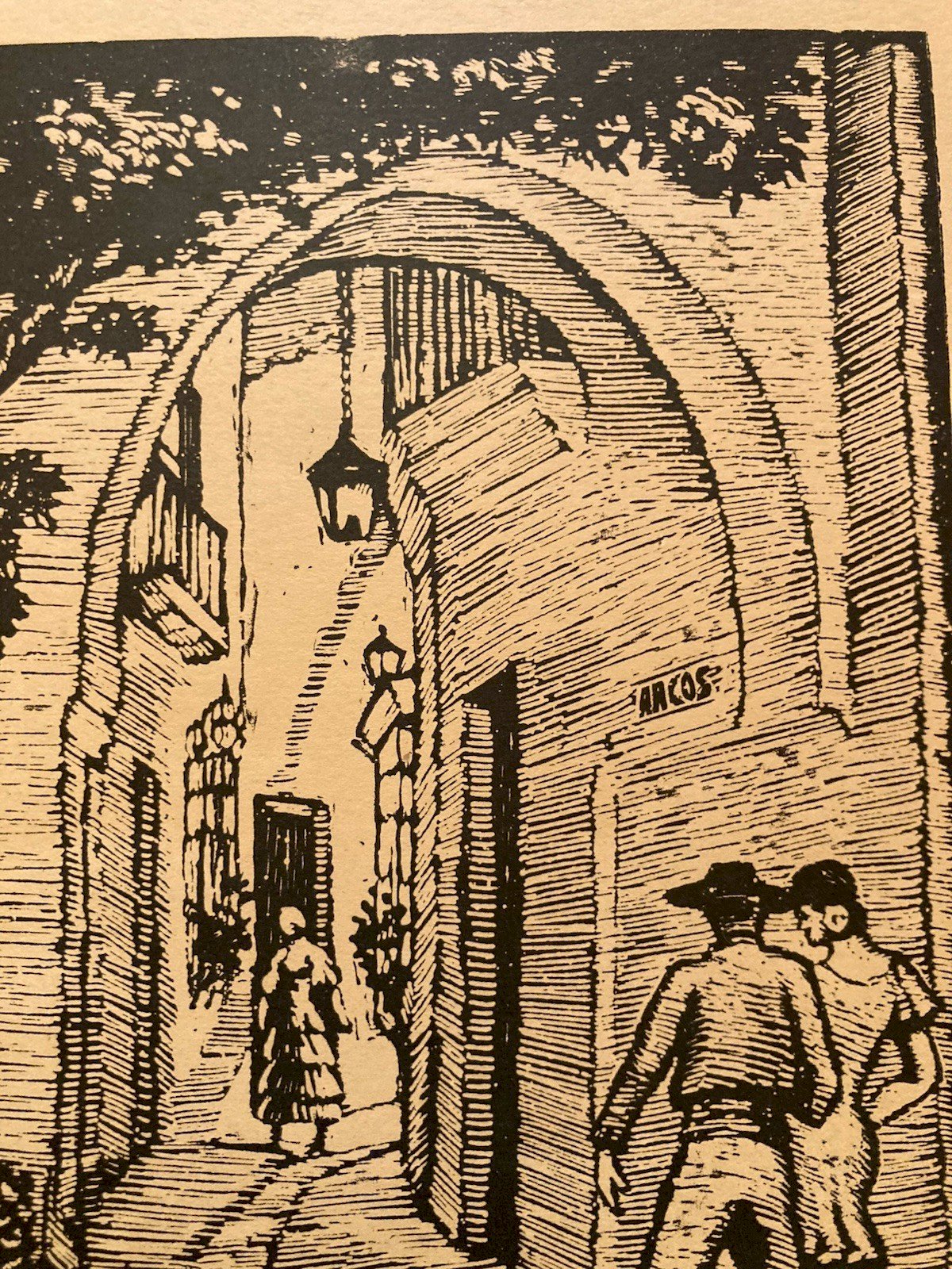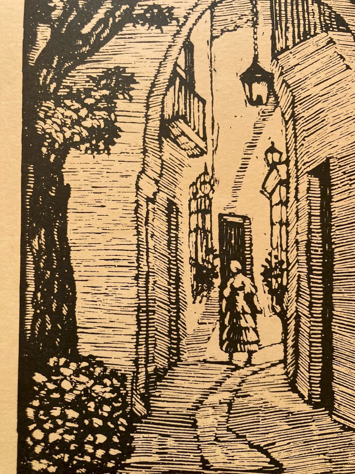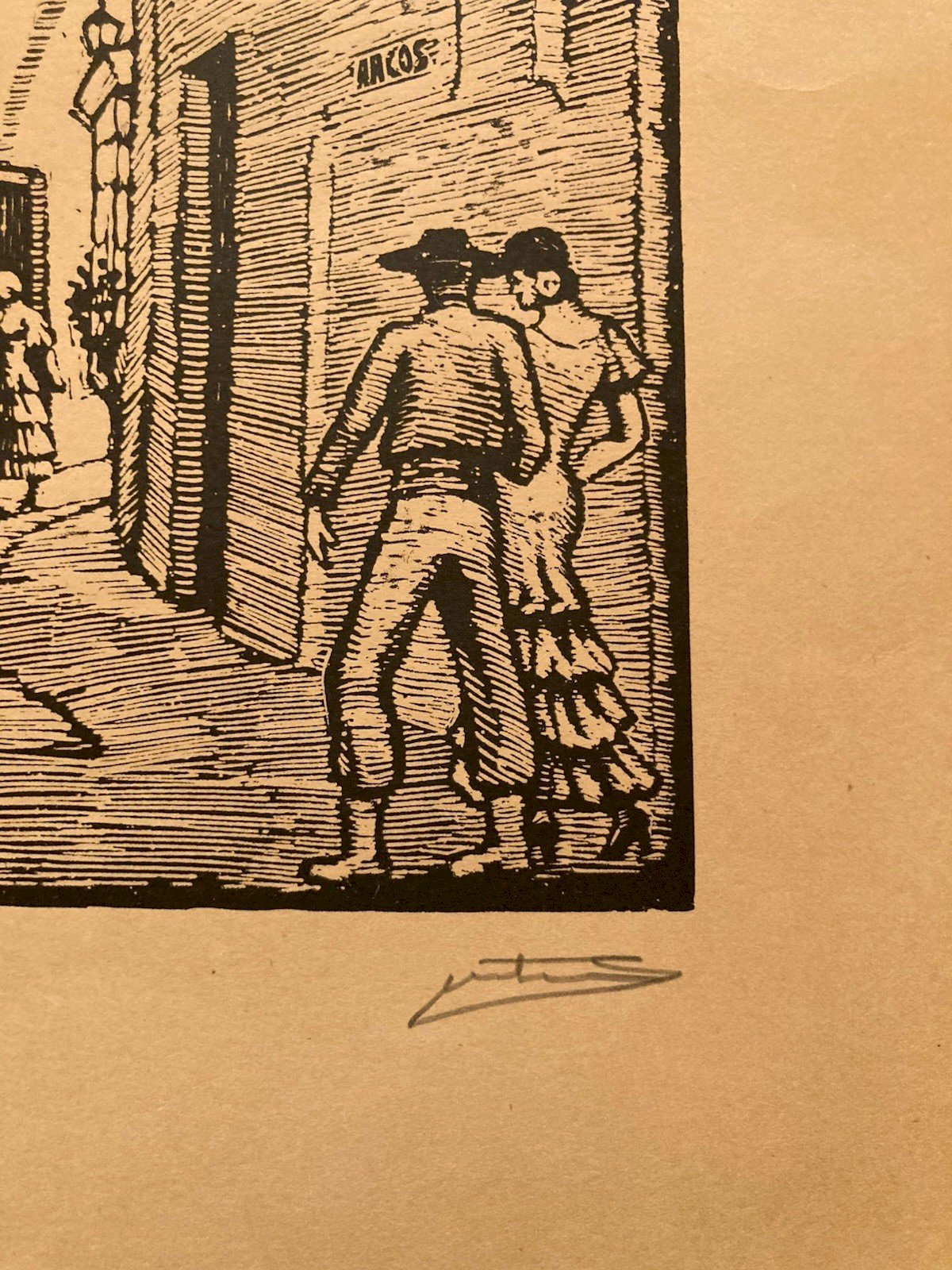 Beautiful Wood Engraving depicting a street in Andalusia, Spain Type: Print Medium: On paper Style: 1940-1960 Theme: Landscape Country of origin: France