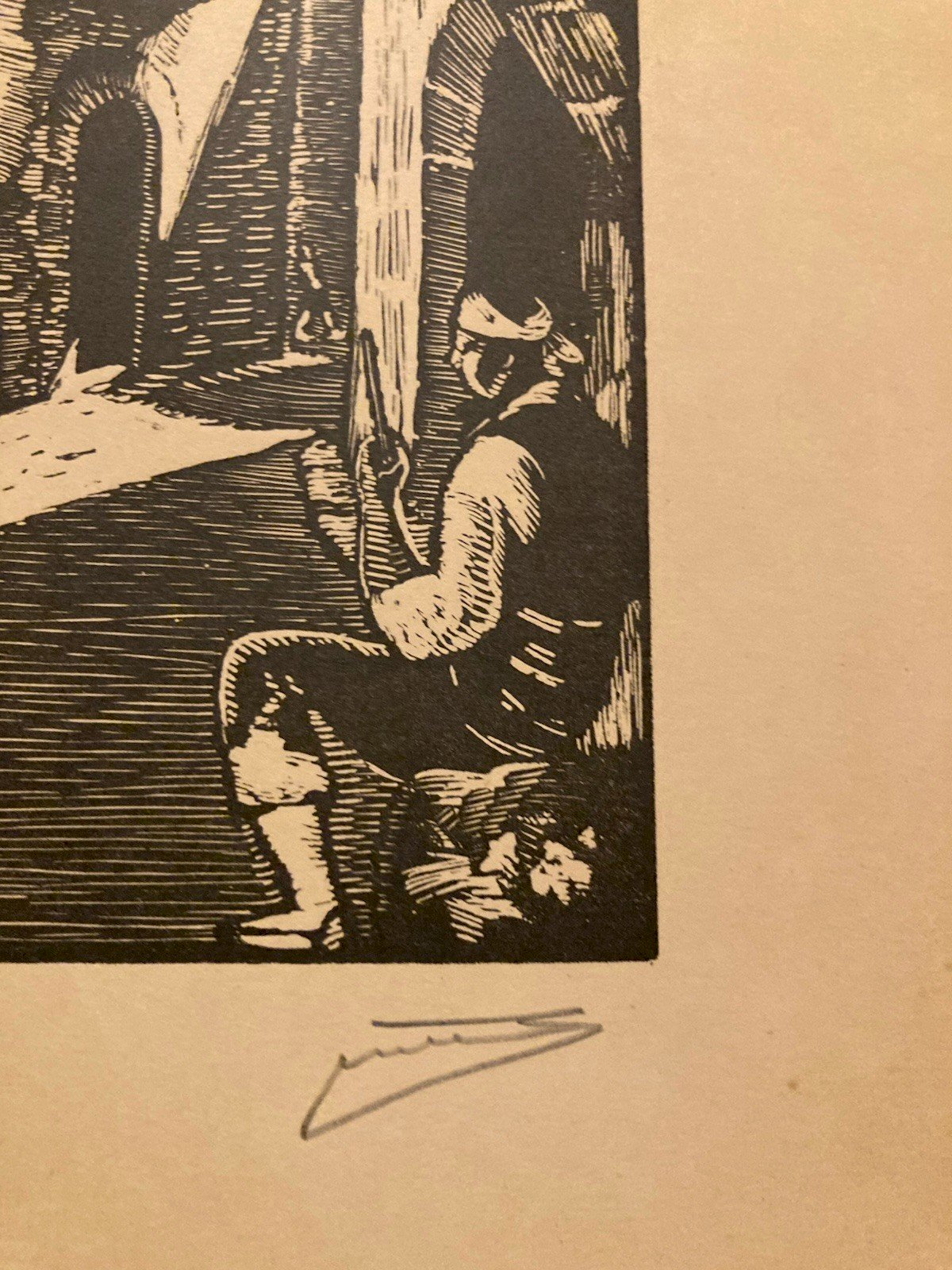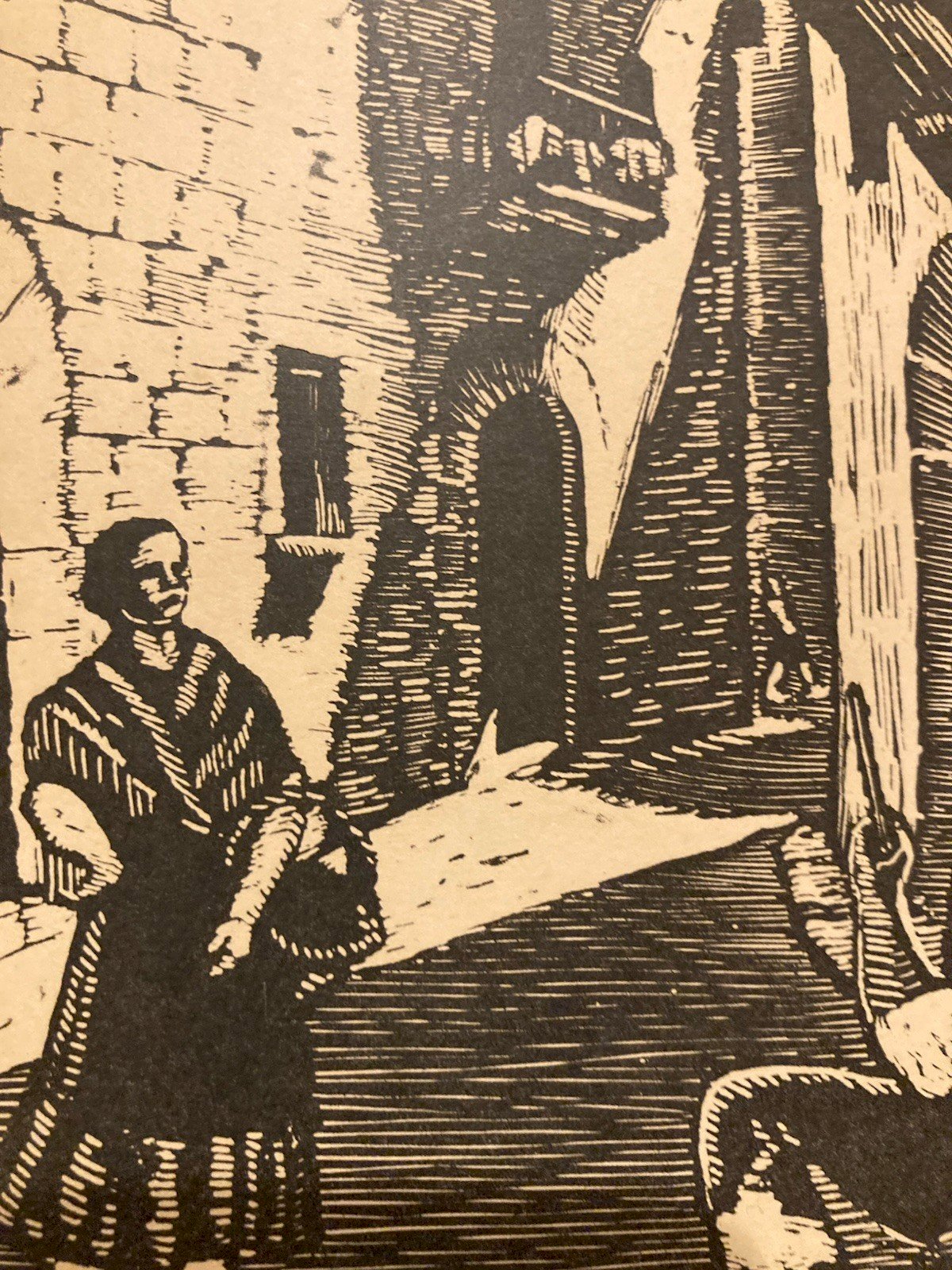Beautiful Wood Engraving depicting a street in Spain, Andalusia Type: Print Medium: On paper Country of origin: France Style: 1940-1960 Theme: Landscape