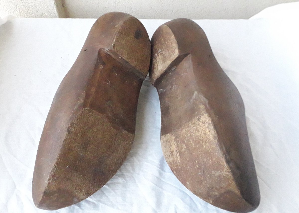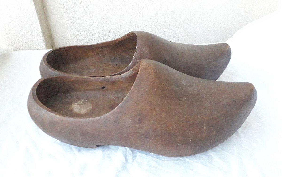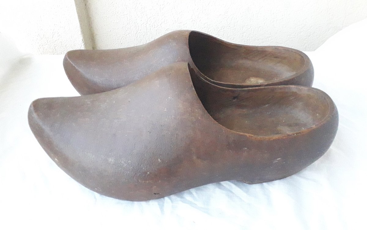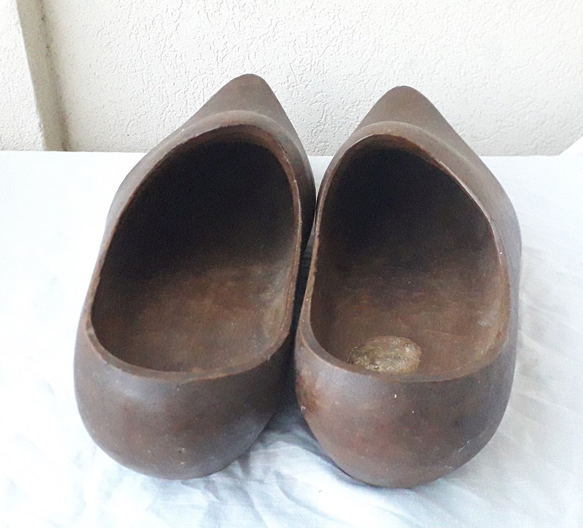 Large pair of carved wooden clogs, for garden decor or to wear.