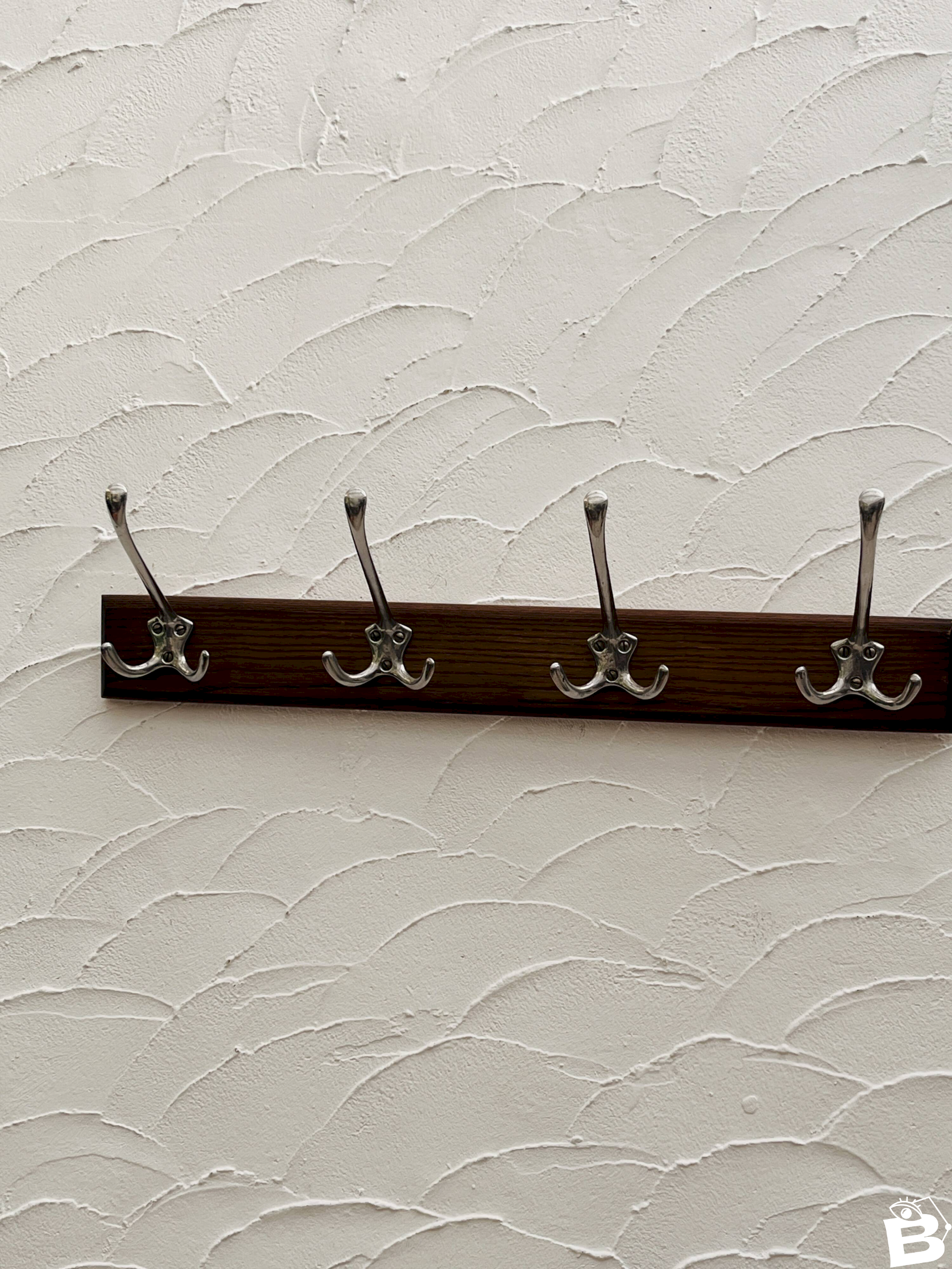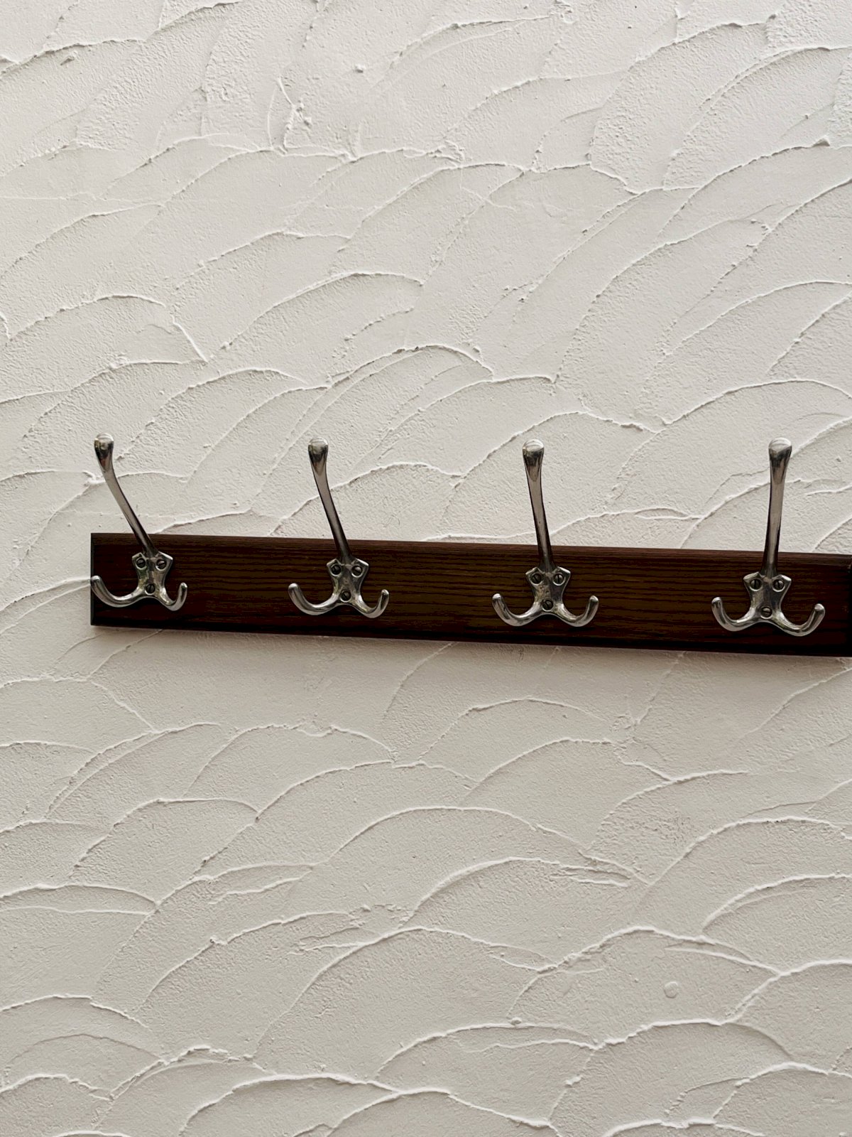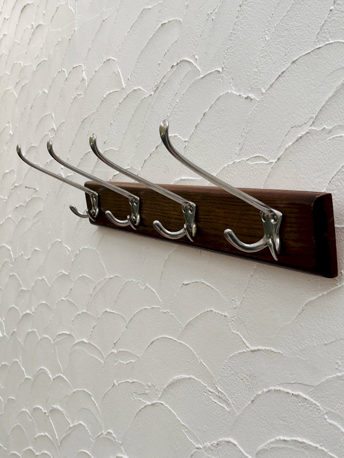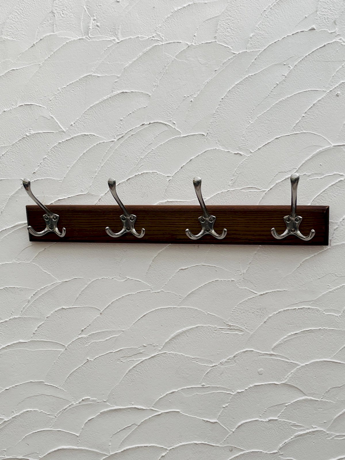 Made from rich brown wood, it features four sturdy metal hooks, providing generous space to hang coats, hats, and scarves.