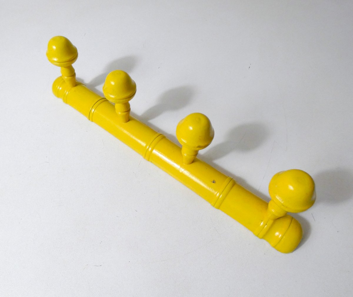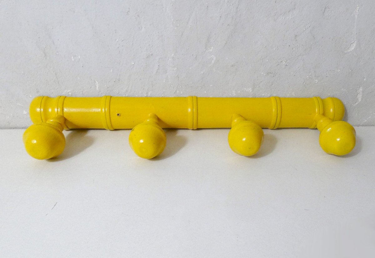 Old painted wooden coat rack, yellow epoxy. Vintage. Width: 48 cm. Depth: 12 cm. Height: 5 cm. In very good condition.
