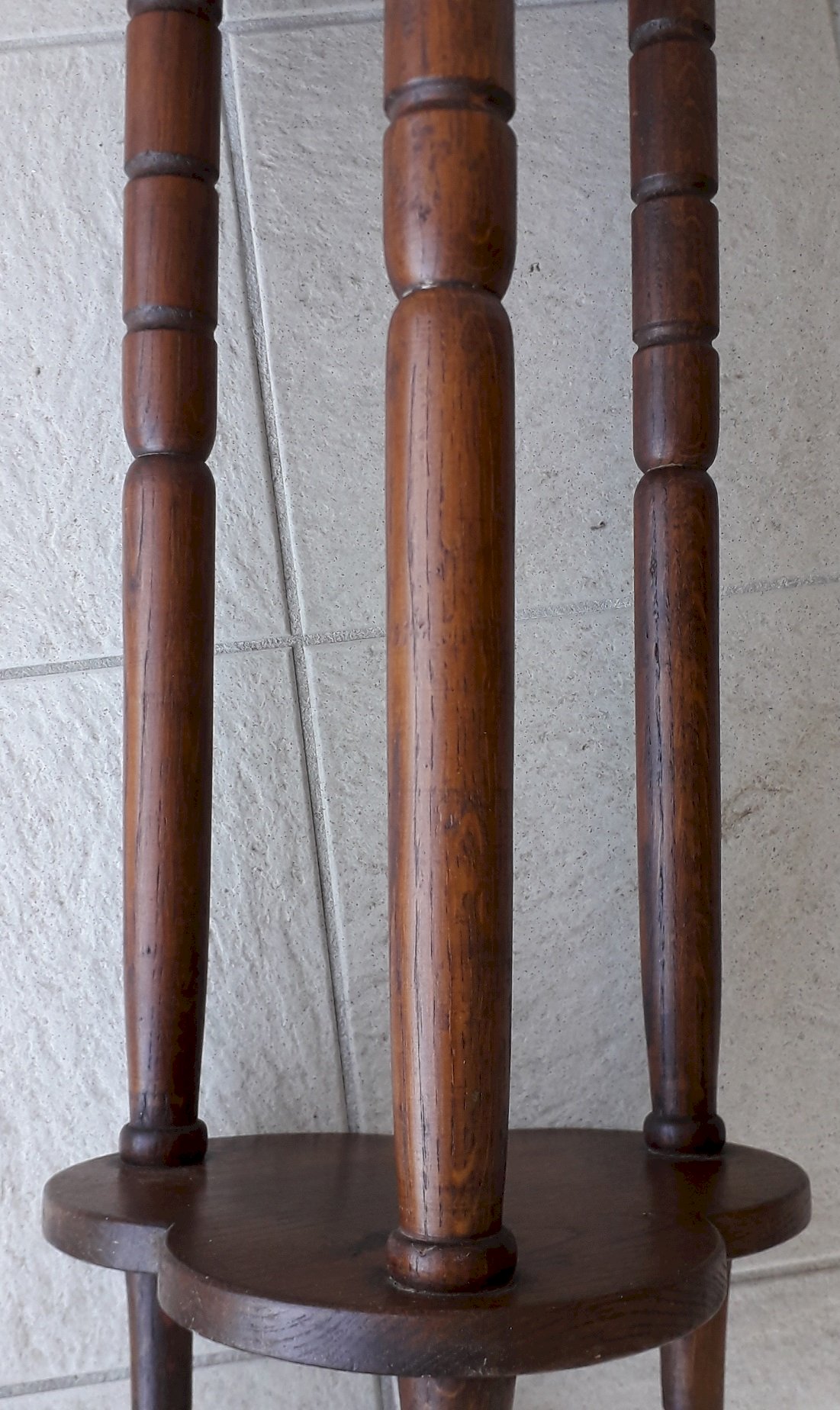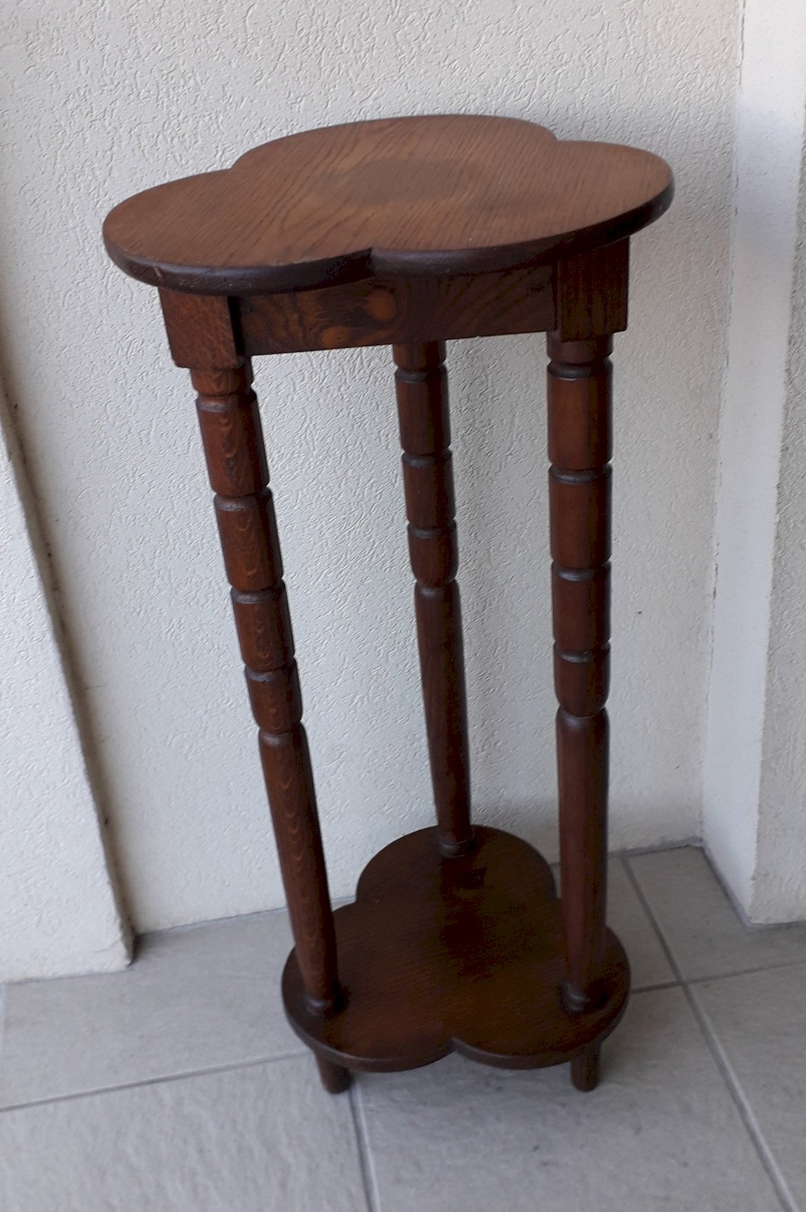 Wooden tripod stand with two shelves, for displaying plants or showcasing objects.